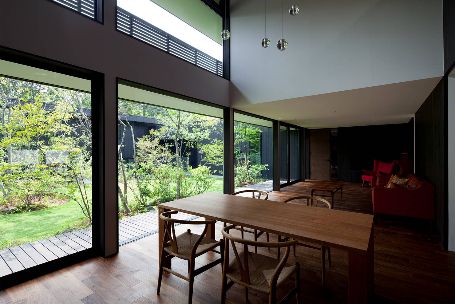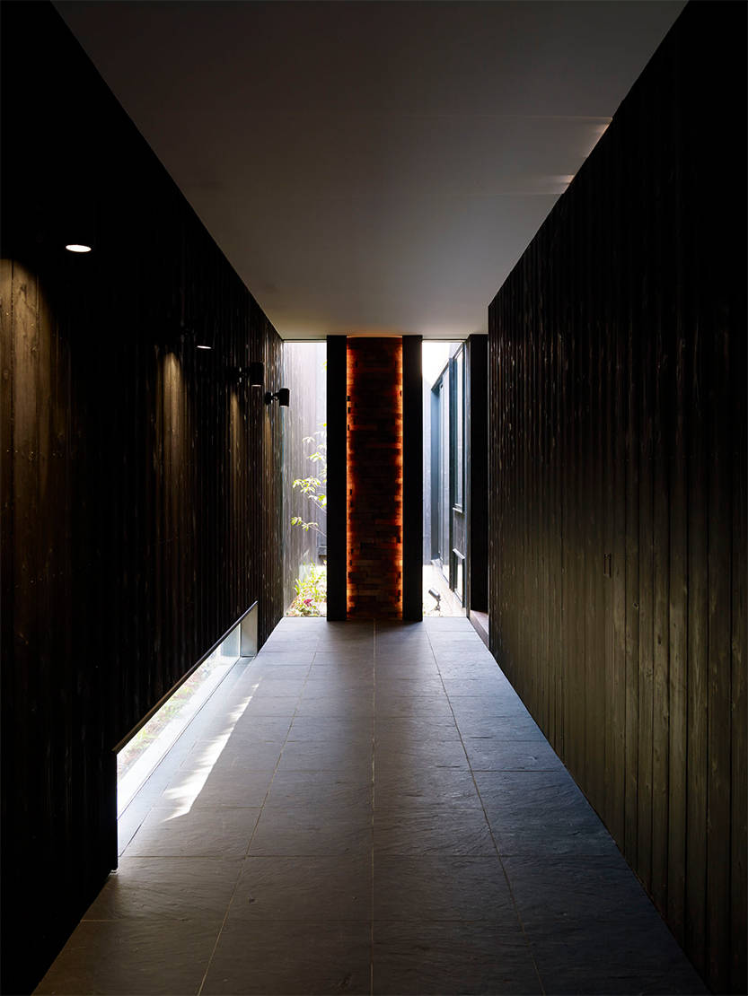 奥の住宅部分に向かうアプローチの長さを逆手に取ってドラマチックな演出空間とした。