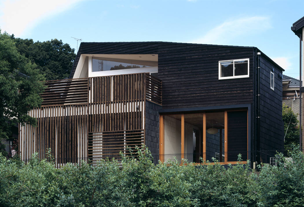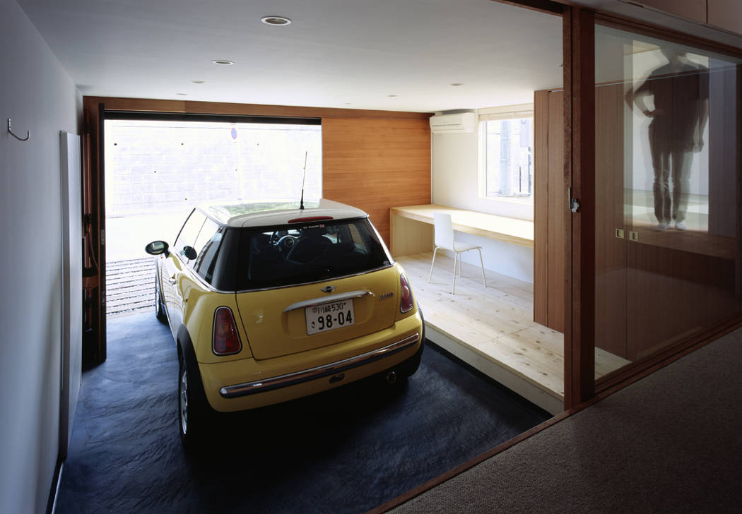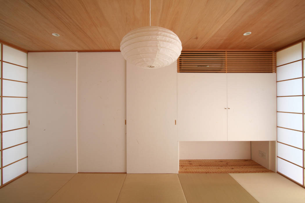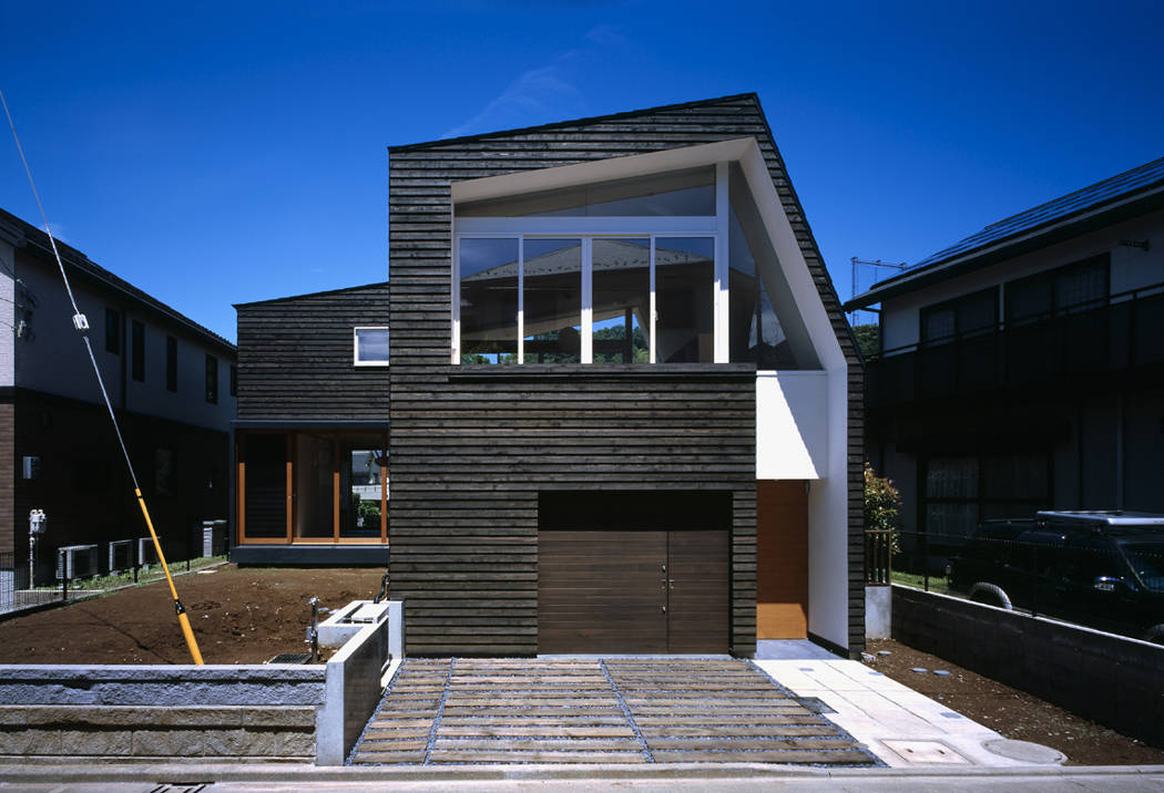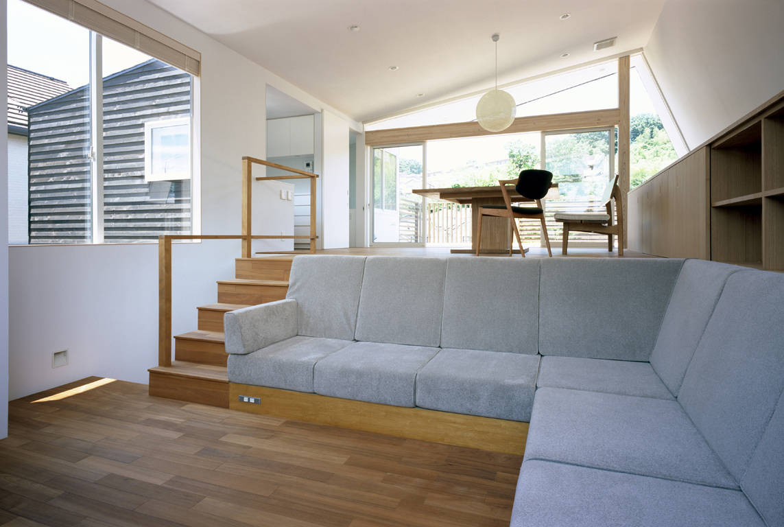 緑や畑が残る環境である。豊かな環境に最大限に開いたスペースを1,2階に確保し、それぞれ和室とリビングとした。玄関からは2階のリビングに導かれる。1階の各部屋には玄関からではなく、別に設けた階段でリビングから降りていく。それは限られたスペースを広く感じさせるため、あえて動線をつなげて一本にして移動距離を長くしている。スキップフロアの家の中の立体的な移動をむしろ楽しみたいと考えた。