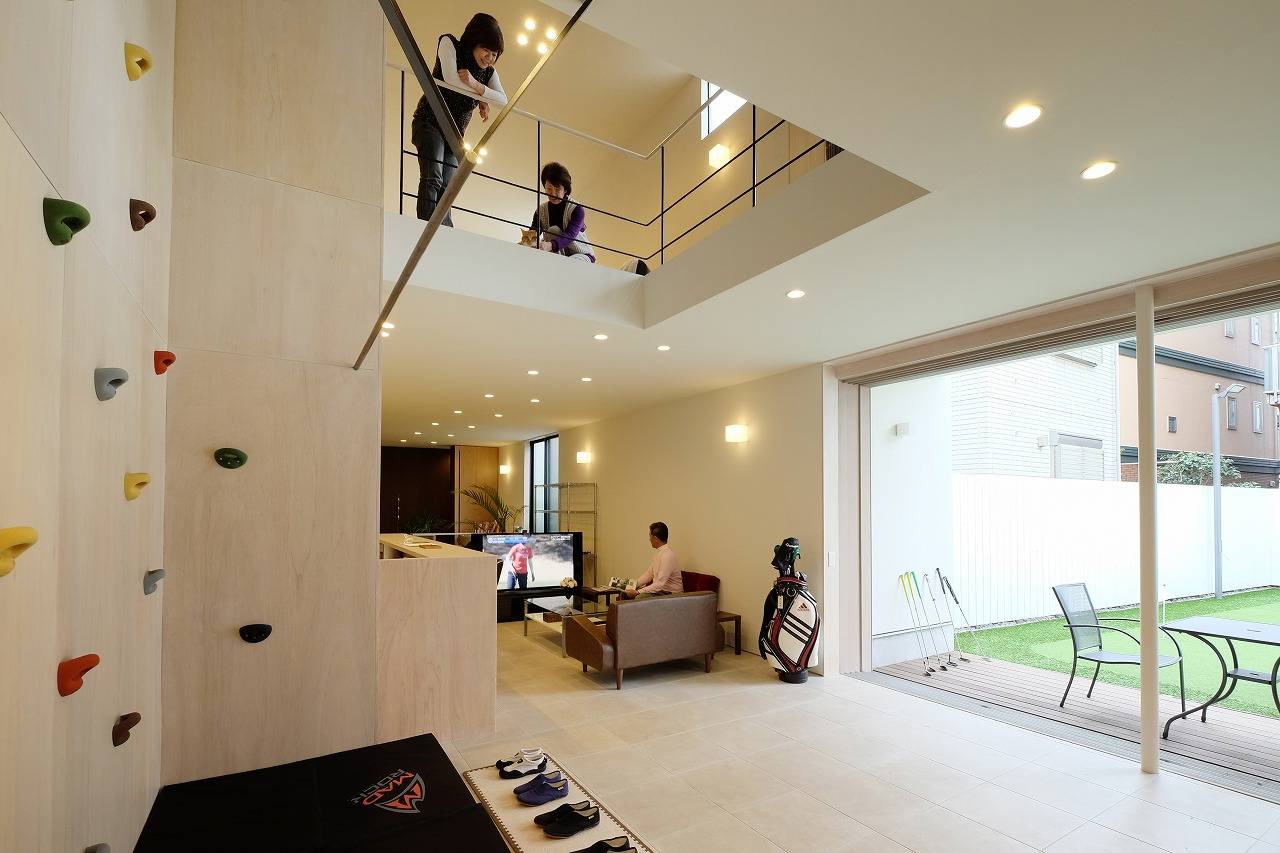 外部空間は、1階にはパターの練習場としてグリーン、テラスから上がった屋根は遠望が可能なルーフバルコニー、開放感の感じられる場所として内部に連続させました。