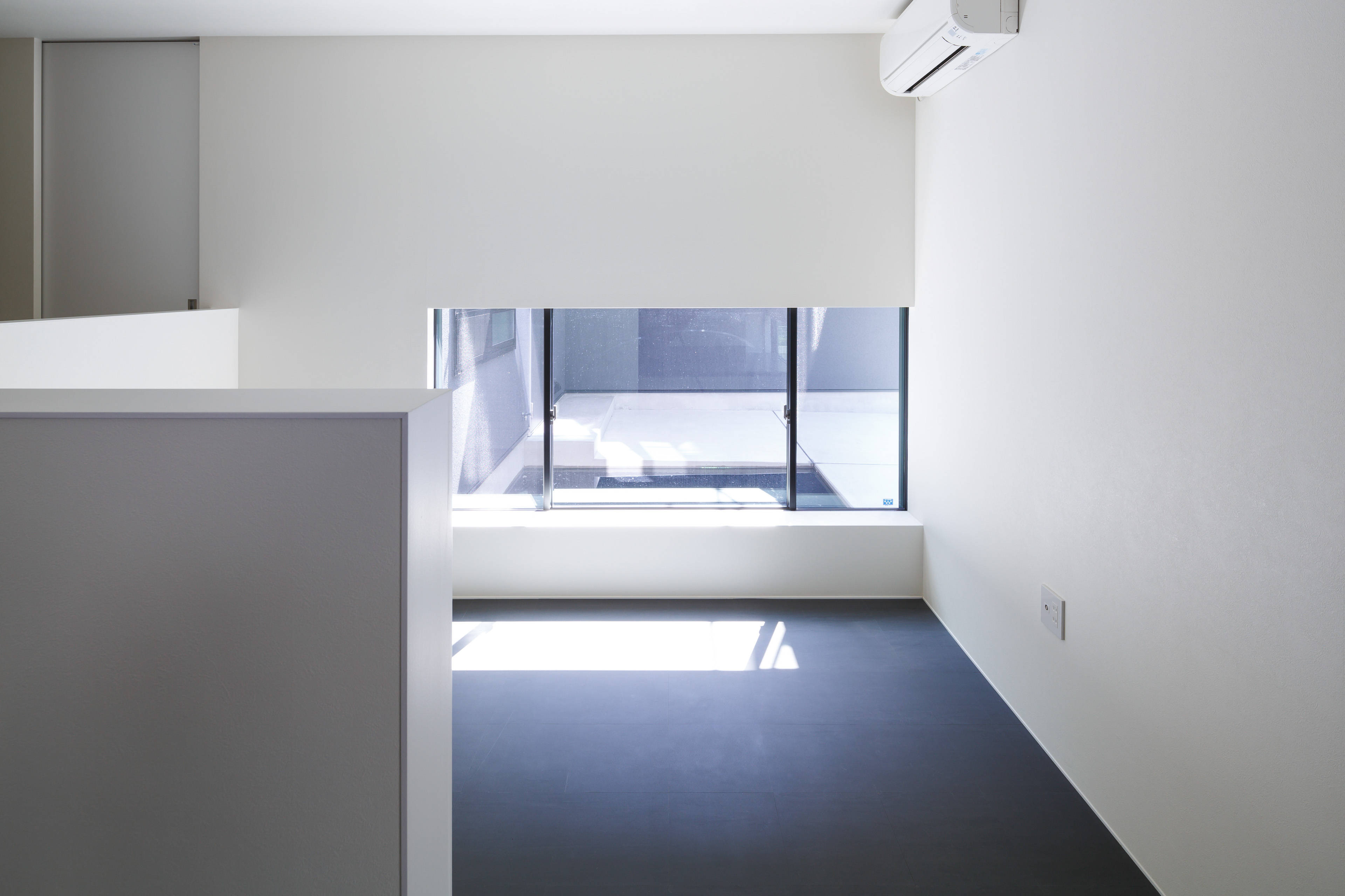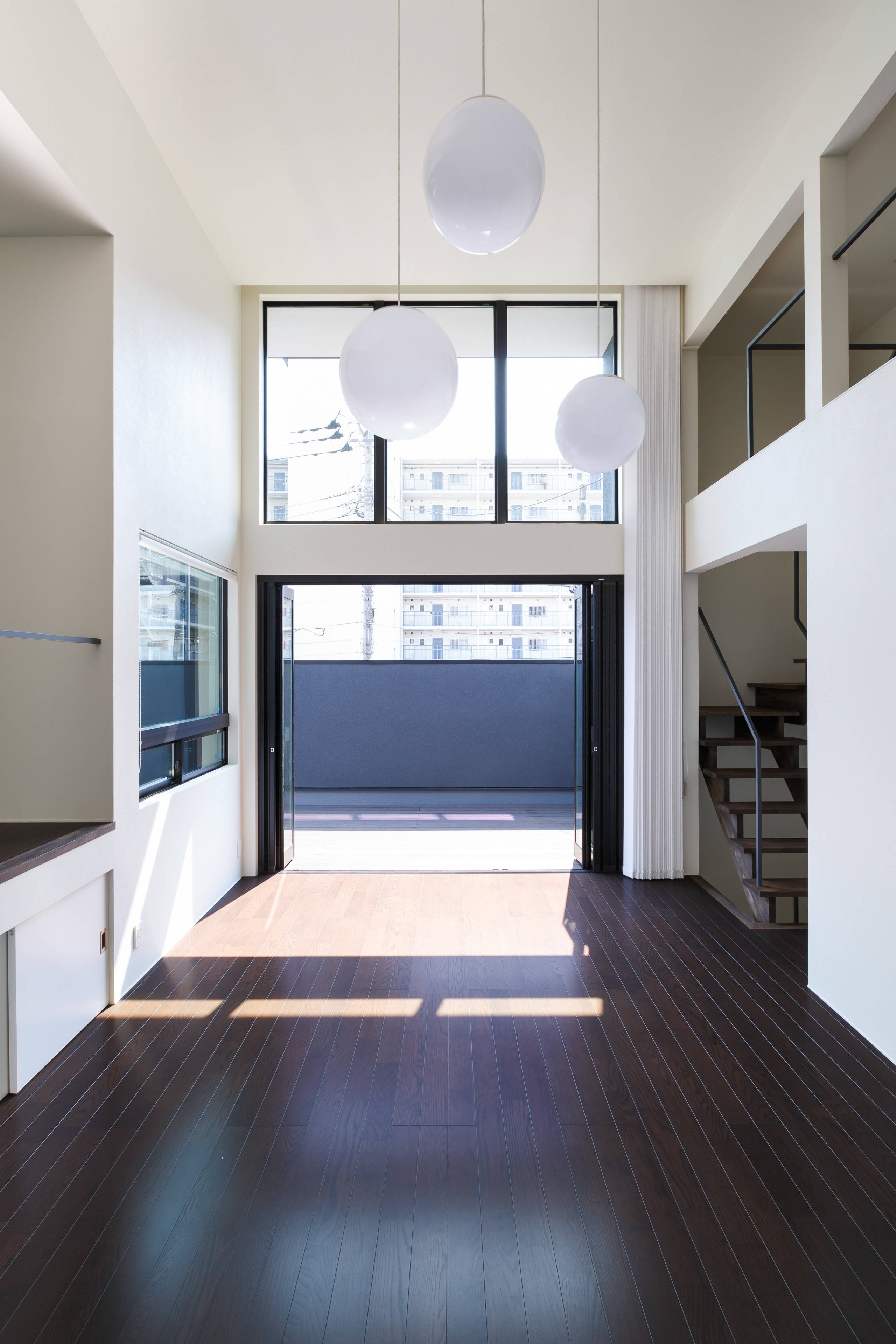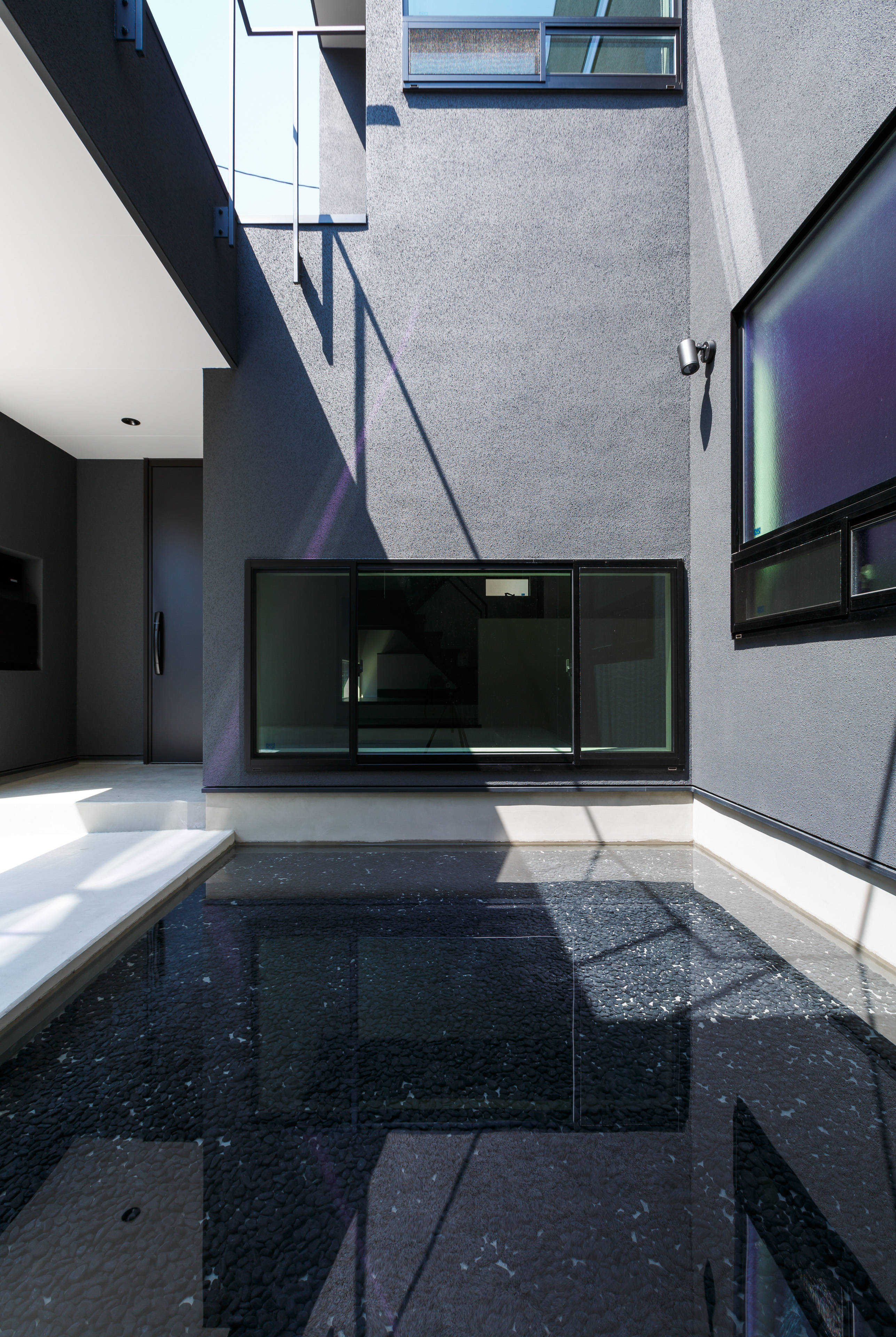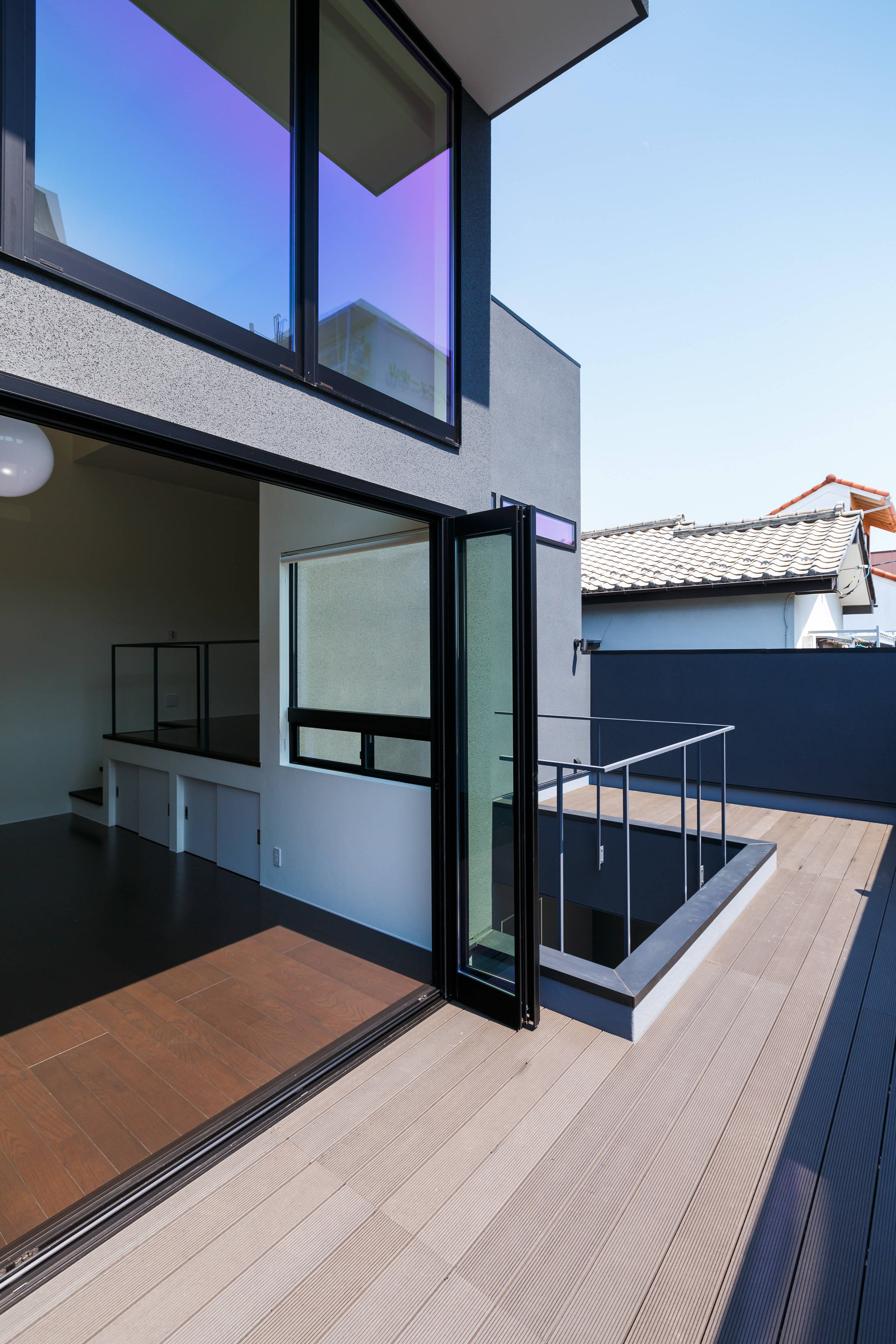 吹抜けのあるダイナミックな構成の2階リビングは、ルーフバルコニーとの連続性を持たせ、手摺壁の高さを綿密に検討することで、周囲からの視線を遮り、プライベート感のある空間となっている。また、バルコニー中央に設けた吹抜けは、1階の水盤へ光を届けるような構成としている。水盤に反射した光は、外壁だけではなく、室内にもその自然の揺らぎを映しだすことで、内部と外部の一体感を感じる空間となっている。
