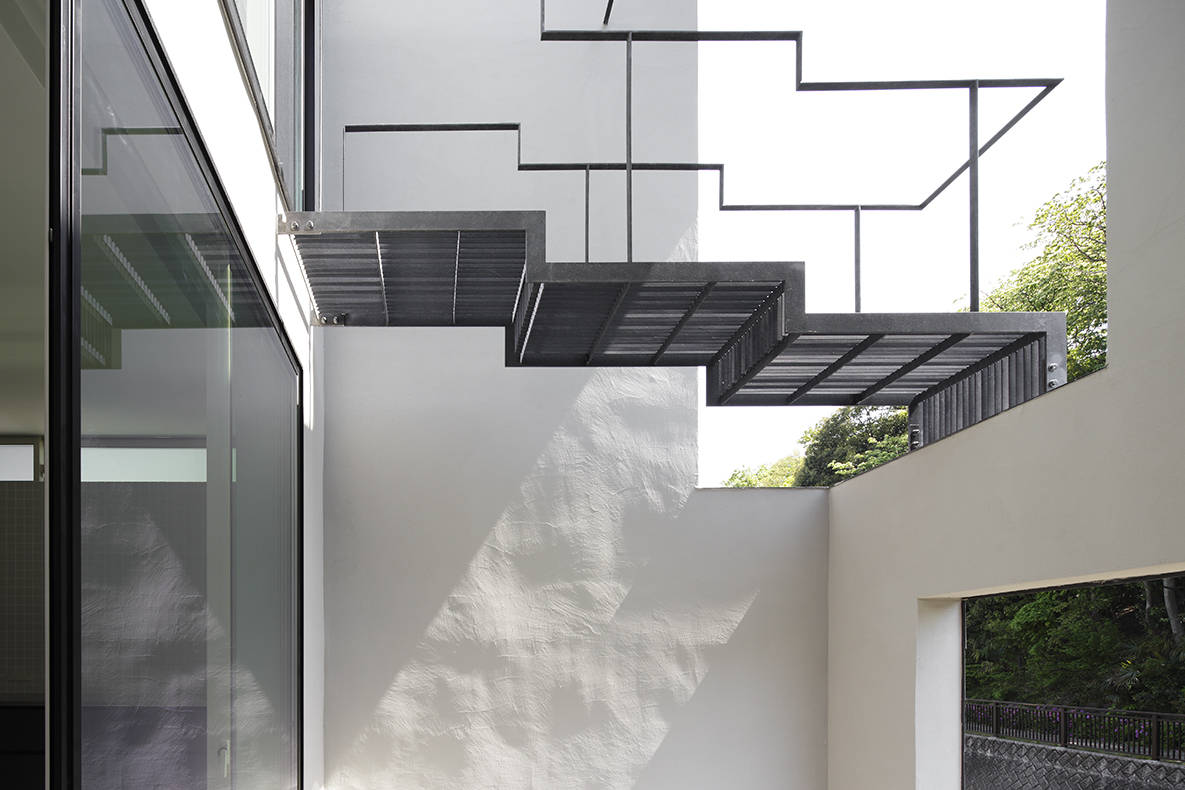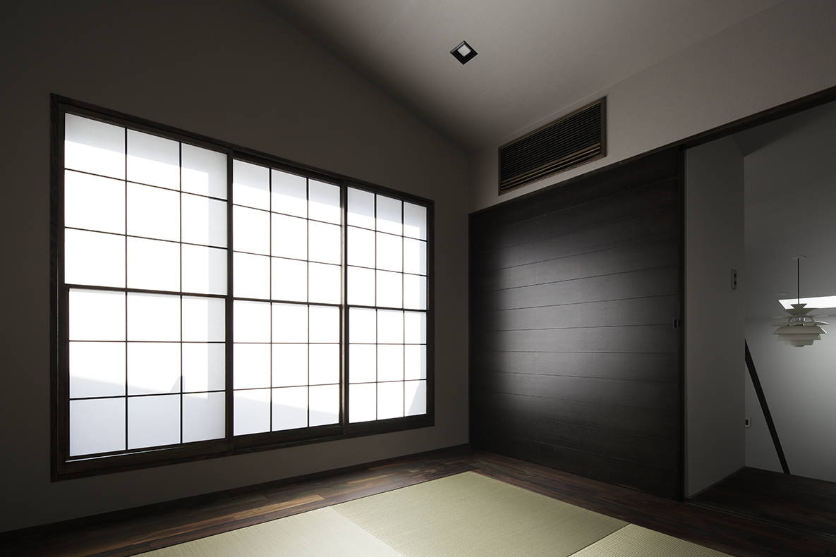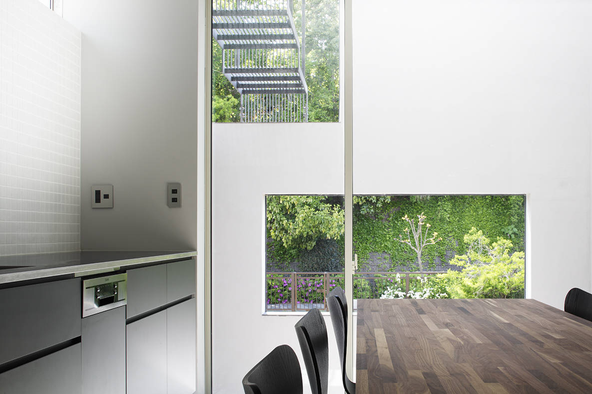 また、川の反対側にある遊歩道からの視線を緩和するために、ダイニングキッチンと川の緩衝領域としてパティオを設置。外壁を皮膜として、内部空間までの視線と感覚を制御している。また、外壁で囲まれた一部分を切り取ることで、額縁として川の景観を内部空間に取り入れるように計画している。