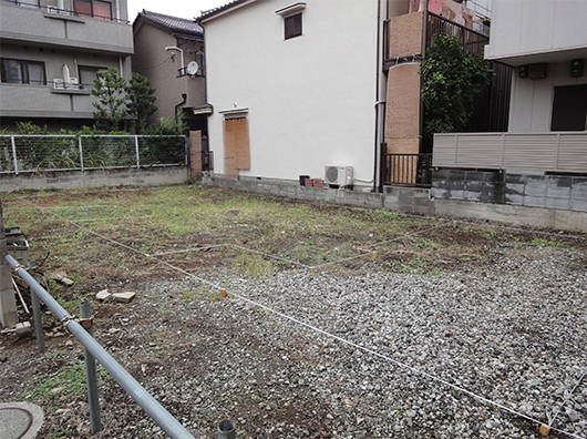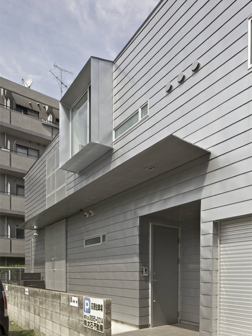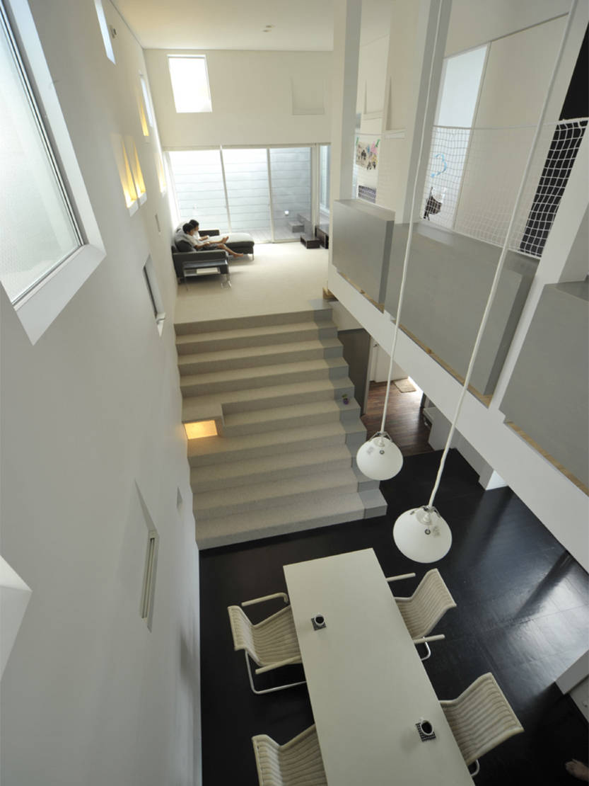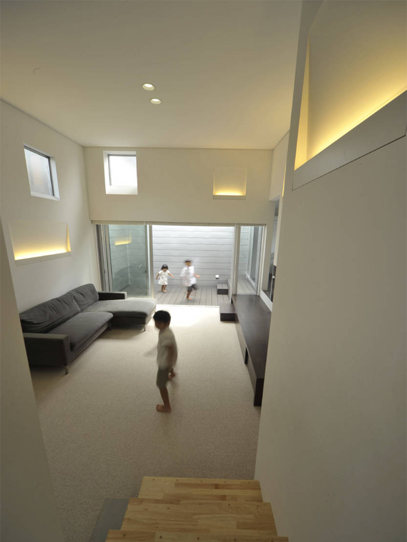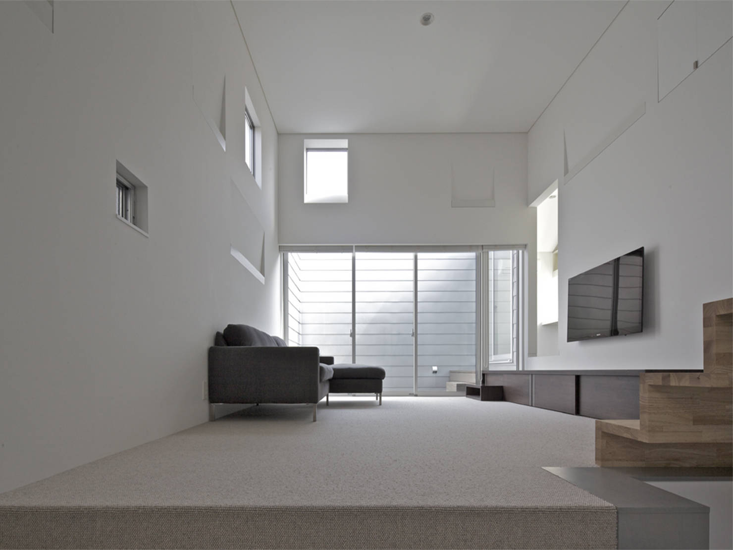 三方を中層階のマンションに囲まれた場所に建つ家。外部からの視線をカットしつつ、内部には開放感のある住まいが求められた。