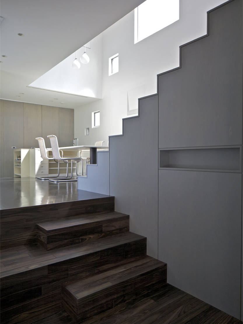 内部には、最大天井高が5mを超える吹き抜けの大空間が広がる。玄関ホールからダイニングキッチン、ダイニングからリビングに至るまでを階段でつなぎ、空間を緩やかに区分しつつも、住まい全体に一体感をもたらした。ダイニングからリビングへと続く大階段は腰かけて寛げるリビングの一部のような存在で、空間を、そして家族を結ぶ場所となっている。どこに居ても家族の気配を感じながら、それぞれが居場所を選んで思い思いの時間を過ごす。ほどよい距離感で家族を繋ぐ、大らかな住まいが完成した。