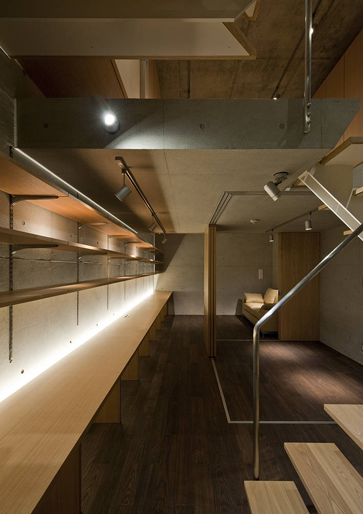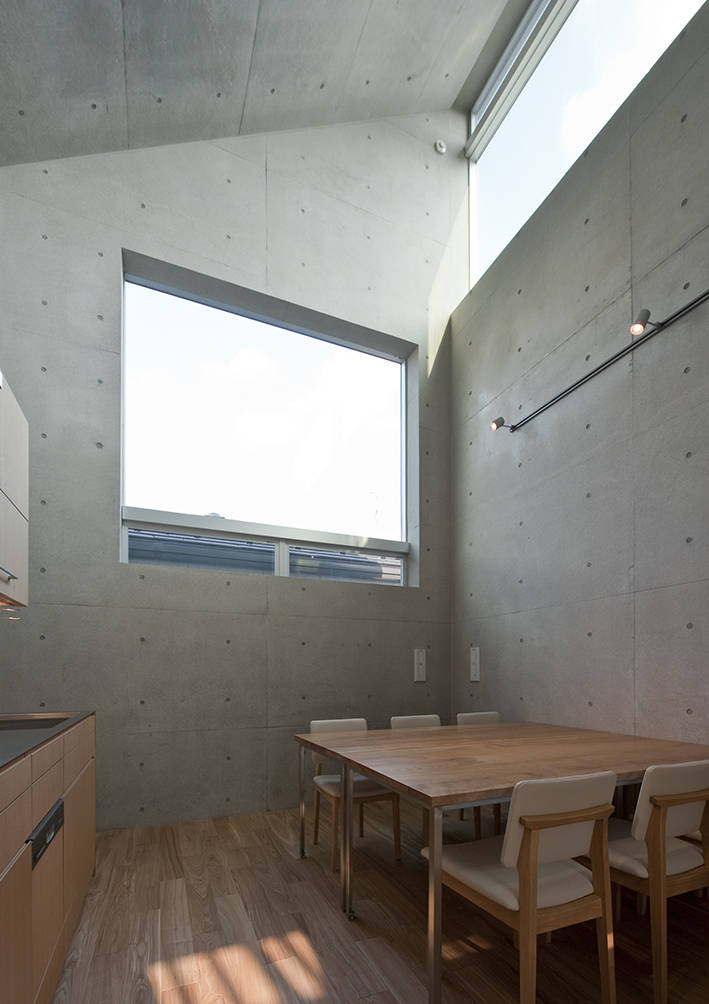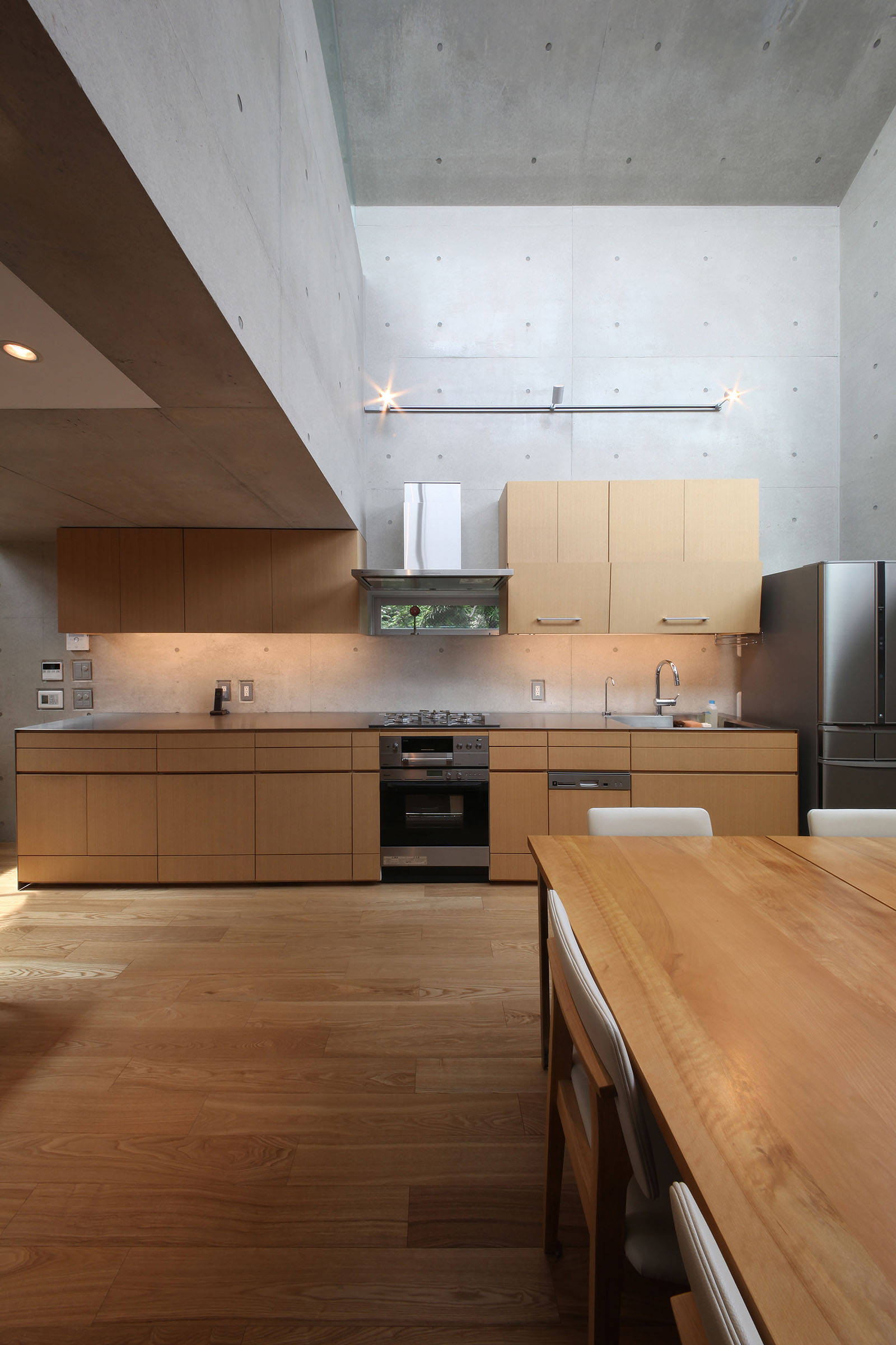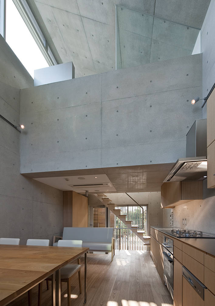 複数の吹抜やドライエリアを配置することで4フロアはワンルーム的につながり、光と風を導きます。地下空間の夏は涼しく空調が必要ありません。冬は大型開口により太陽光で暖かく過ごすことが出来ます。キッチンは妻の希望を反映しながら製作しました。