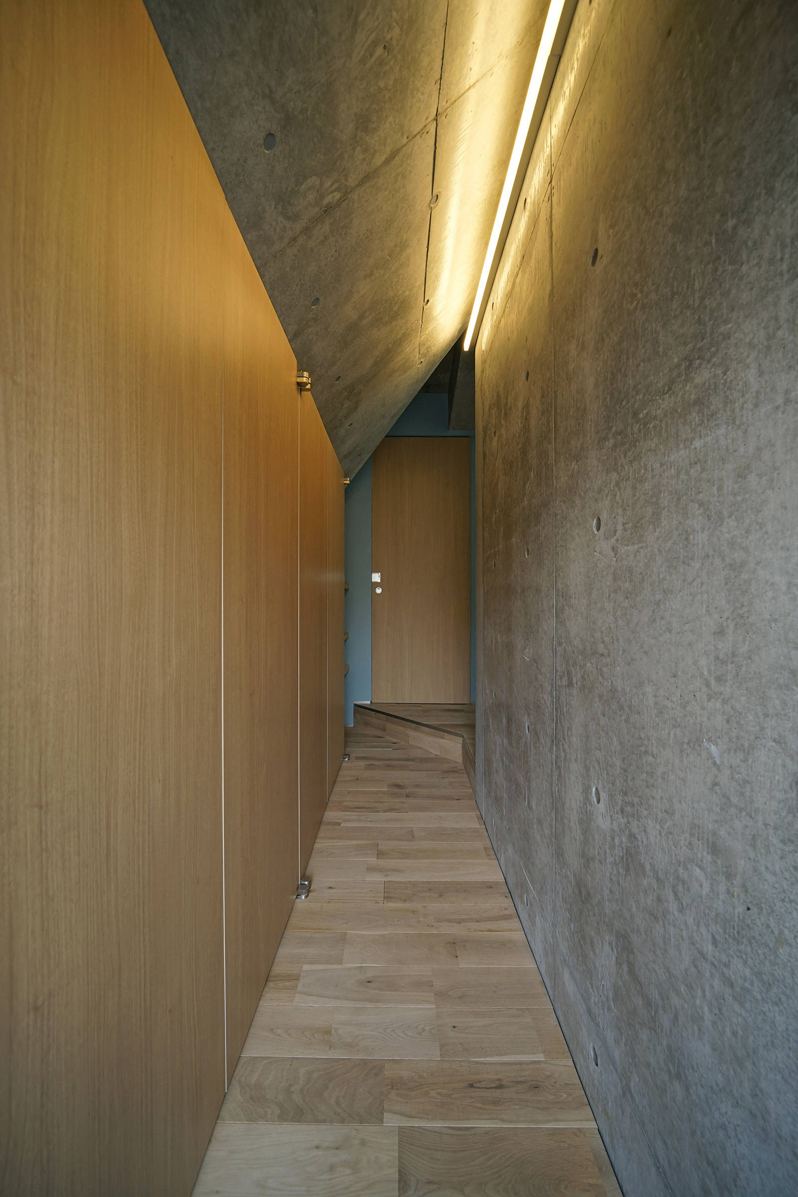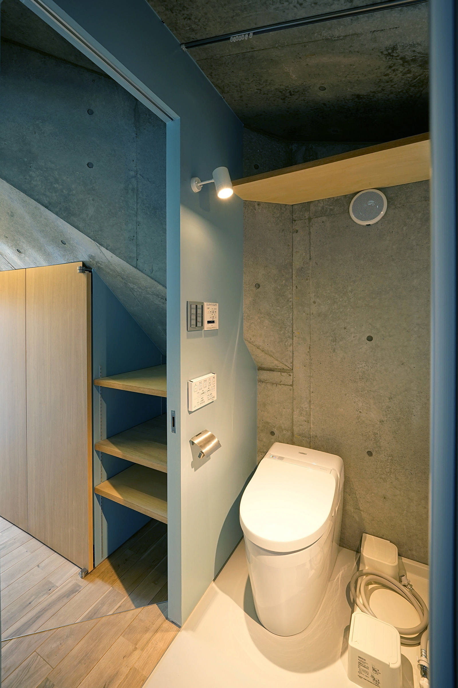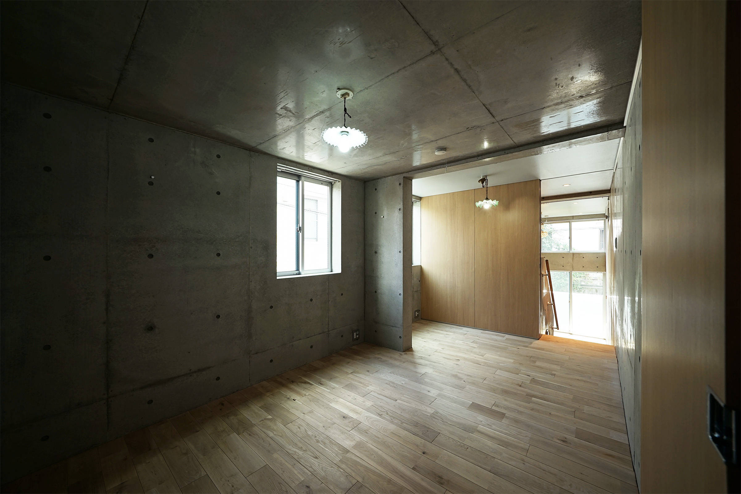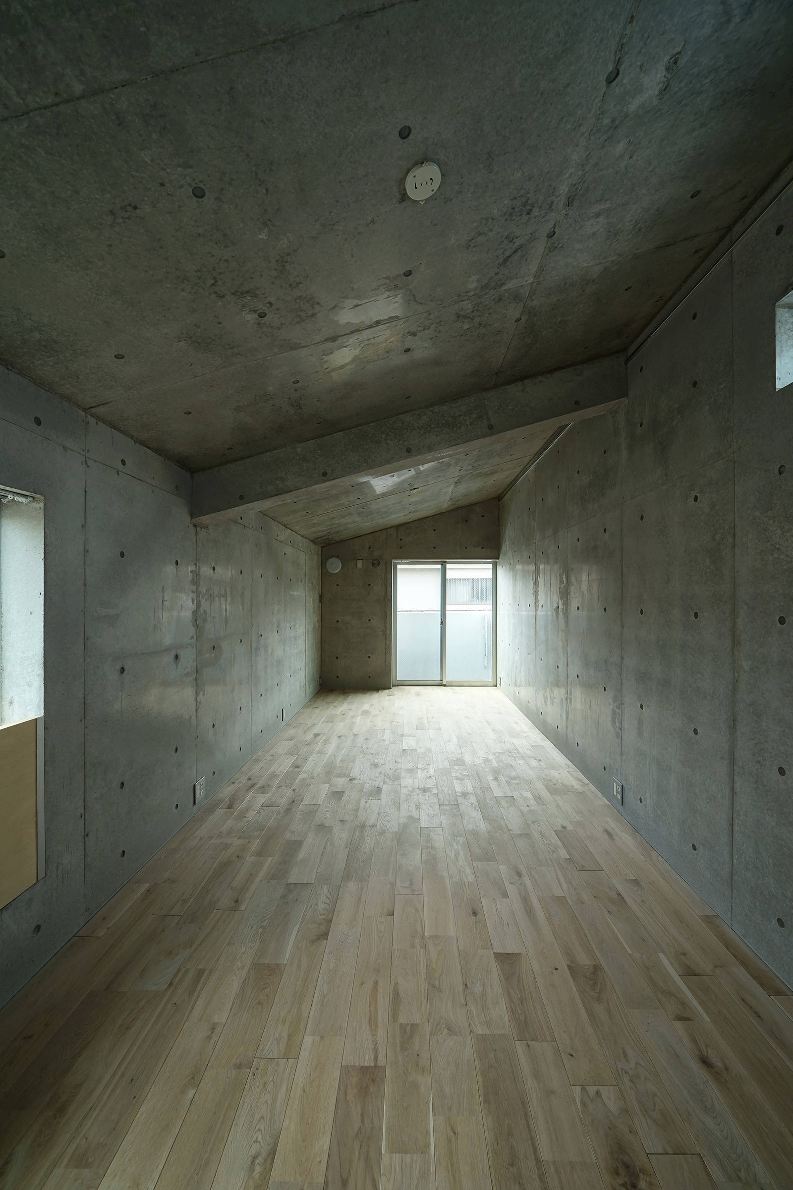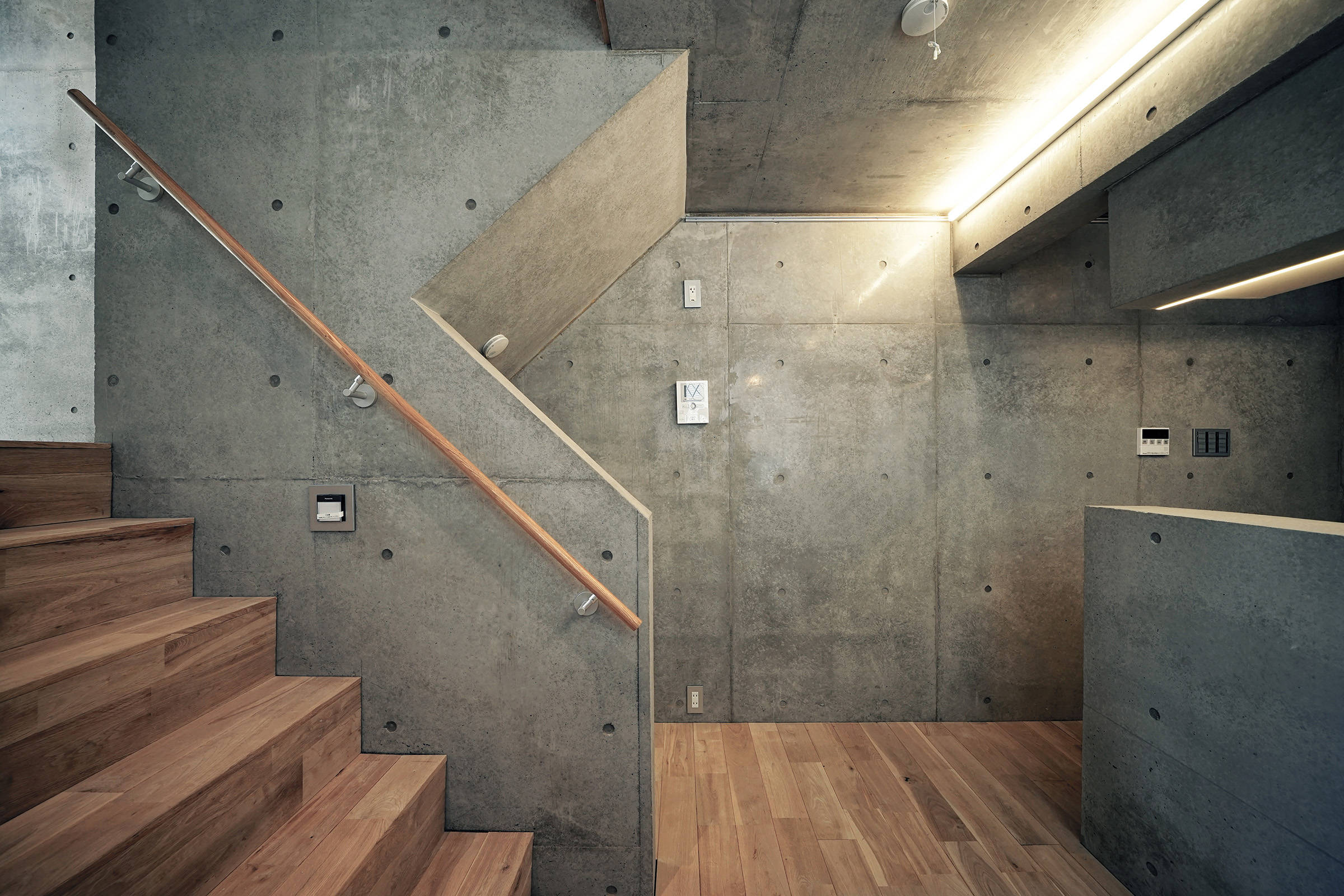 道路高低差を利用した地下1階に最大ボリュームの地上3階を加えた4層をスキップフロアの建築主住居とワンルームの賃貸住居と分割することで、狭小地(建坪11坪)とは思えない広がりを感じさせる空間構成となりました。