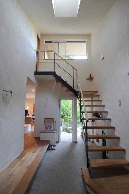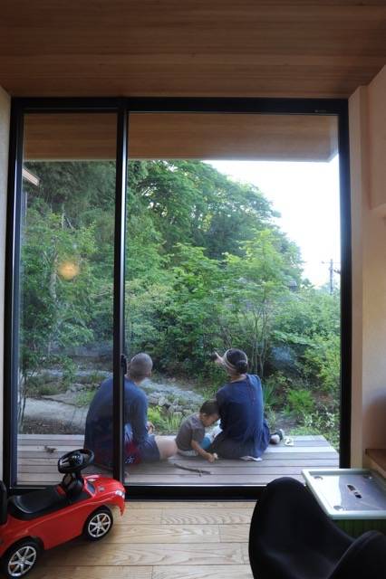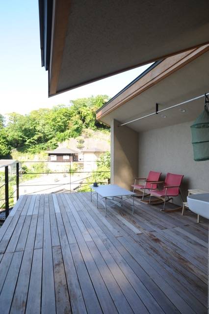 崖に囲まれた2世帯住宅、鎌倉の谷戸(谷状の地形)にしっとりと馴染む素材感と深い軒をもつ家である。