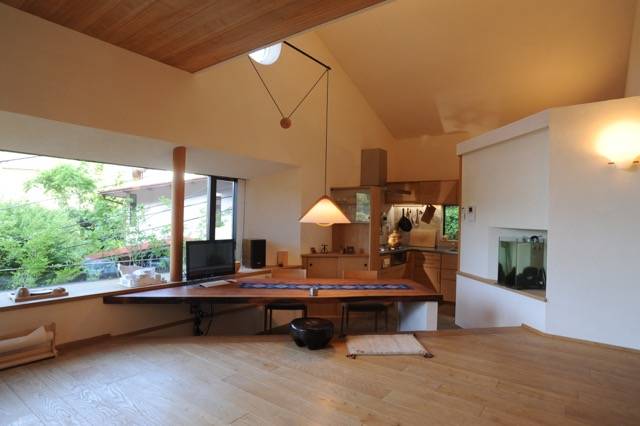 庭の緑を楽しみながら薪ストーブで暖をとる。ゆったりとした音楽が流れている。美味しいシチューが出てきそう。