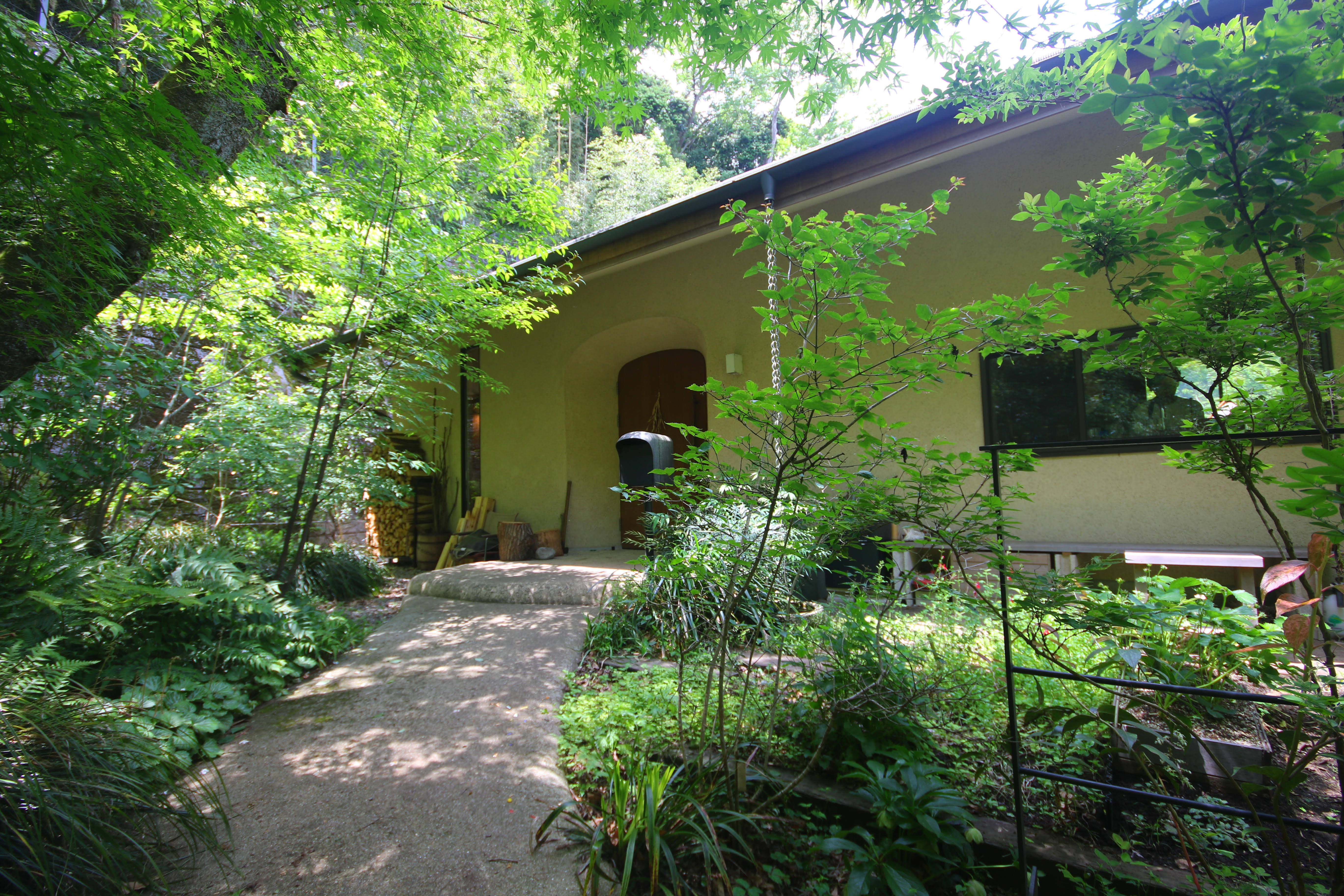 モミジ 桜の下をくぐりながら階段を登っていくと アーチの玄関ドアがまるで童話に出てきそうな雰囲気でお出迎え。ひとつ屋根の下にある共通の通り土間が各世帯を絶妙の距離感で分けている。