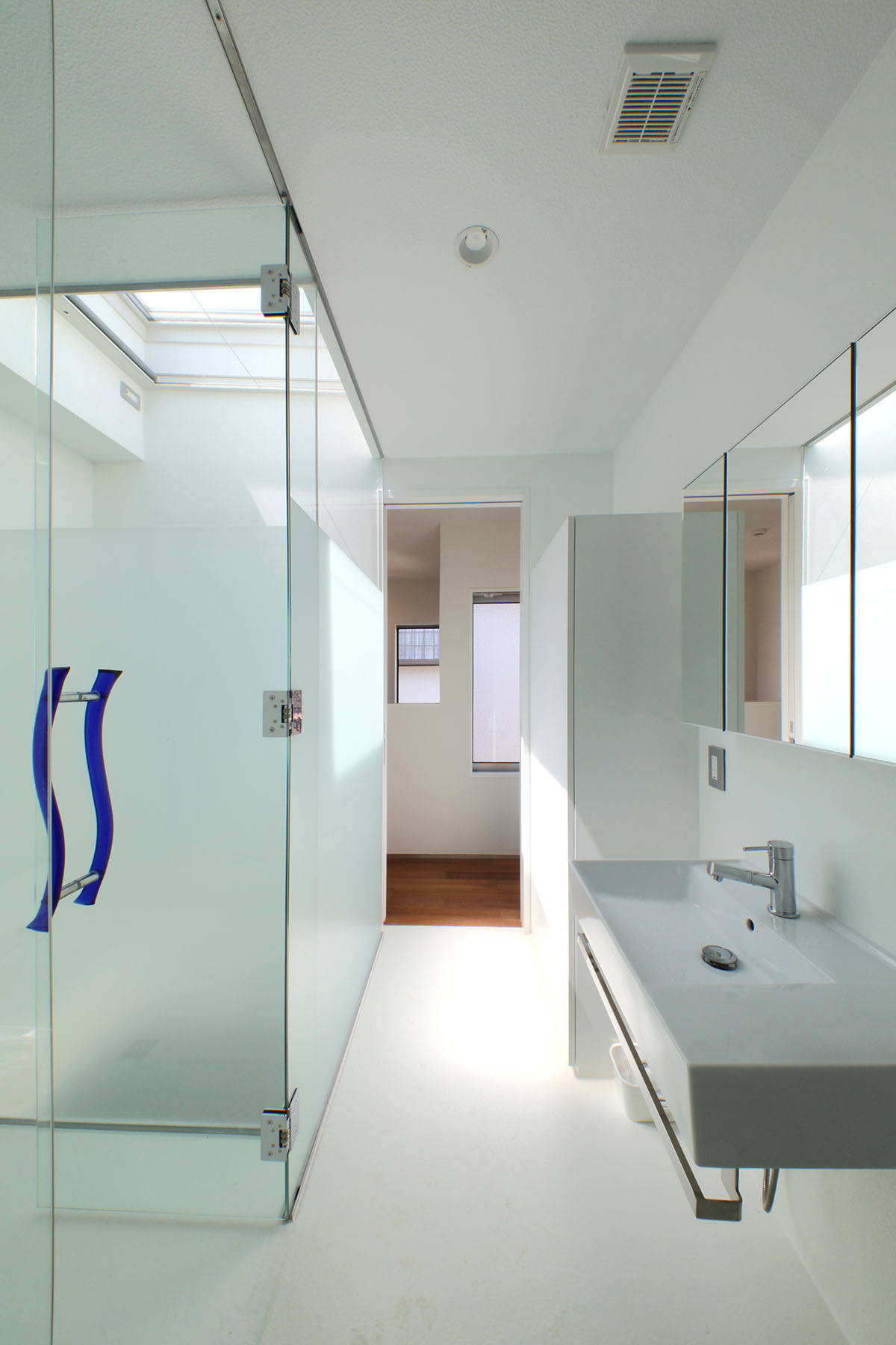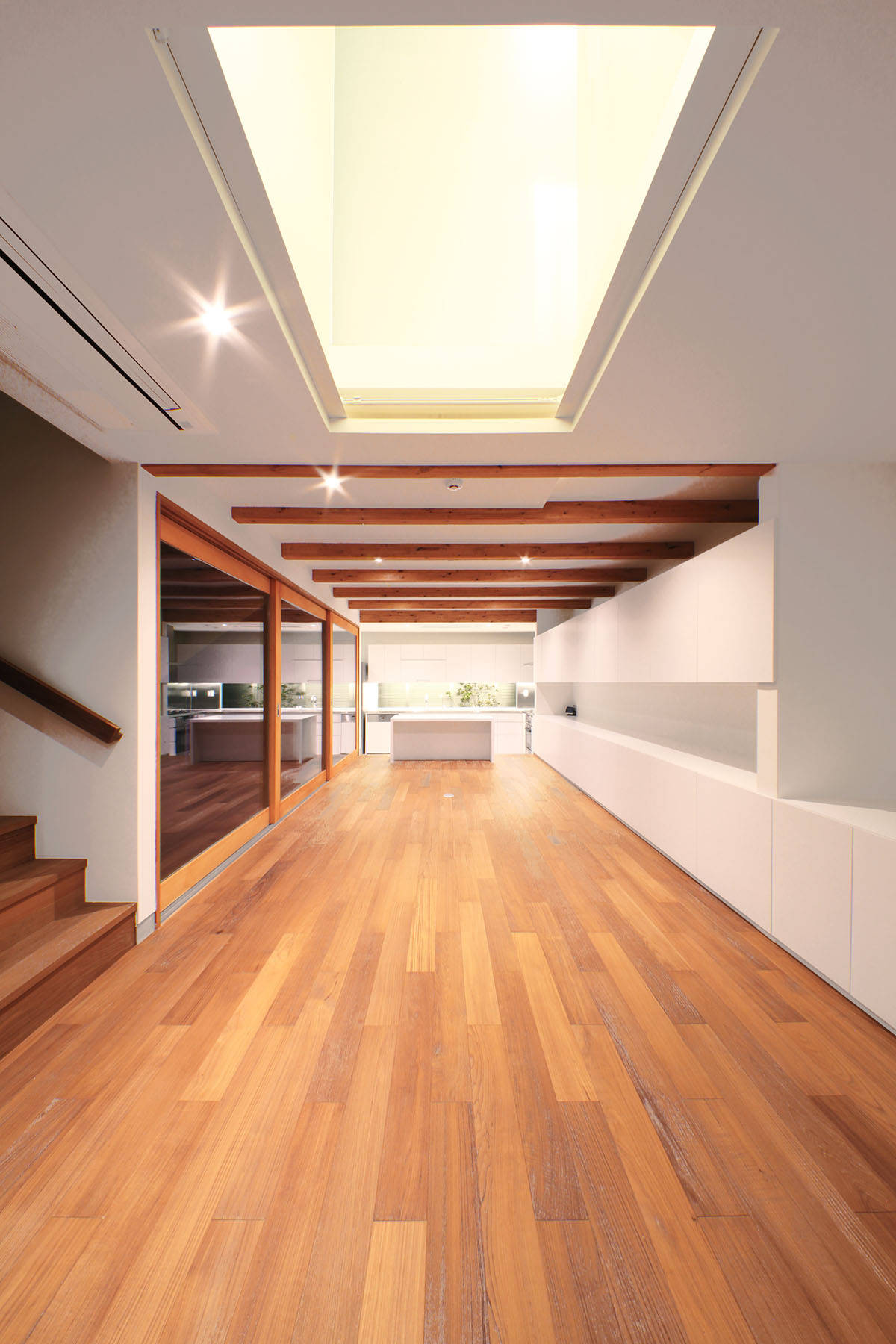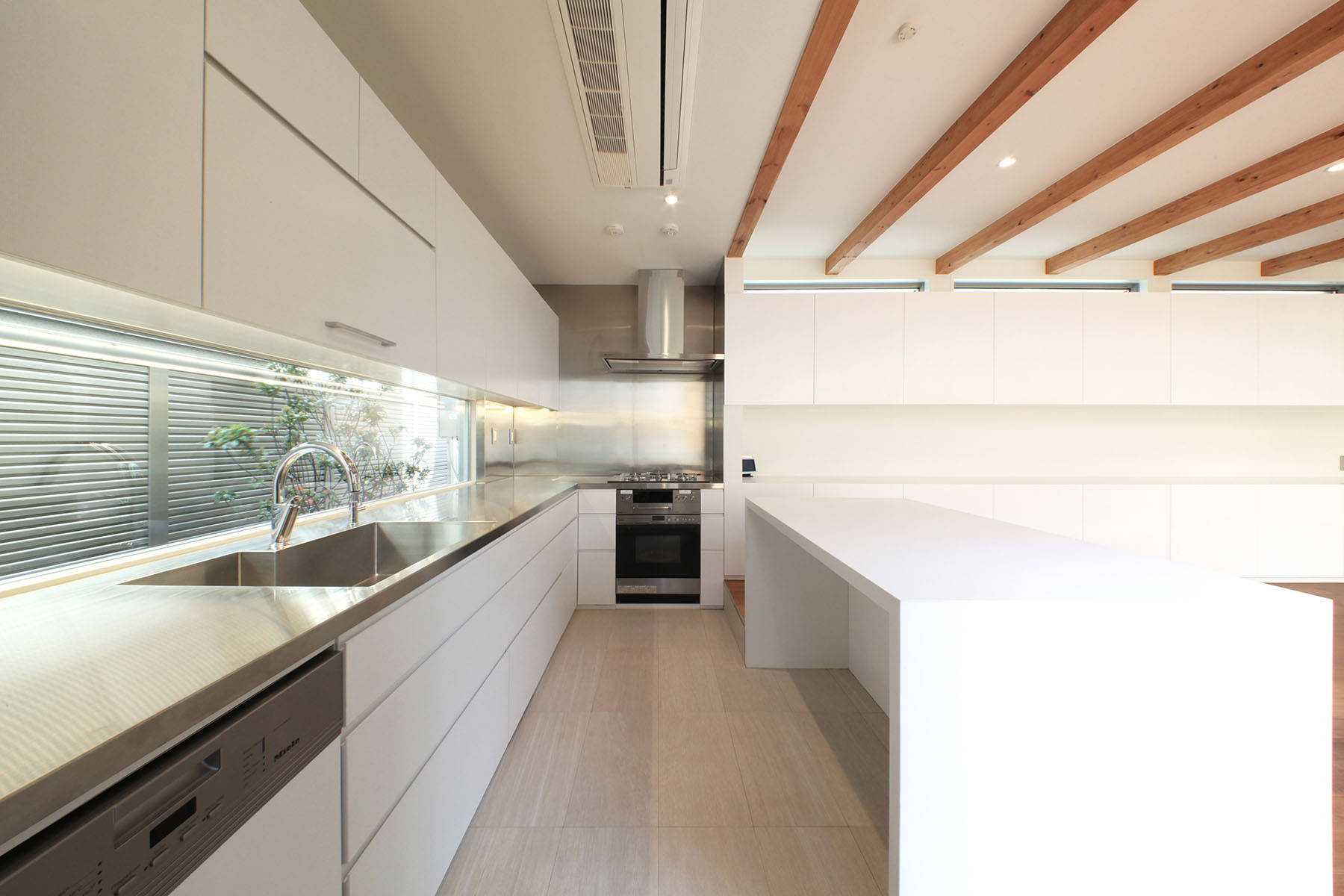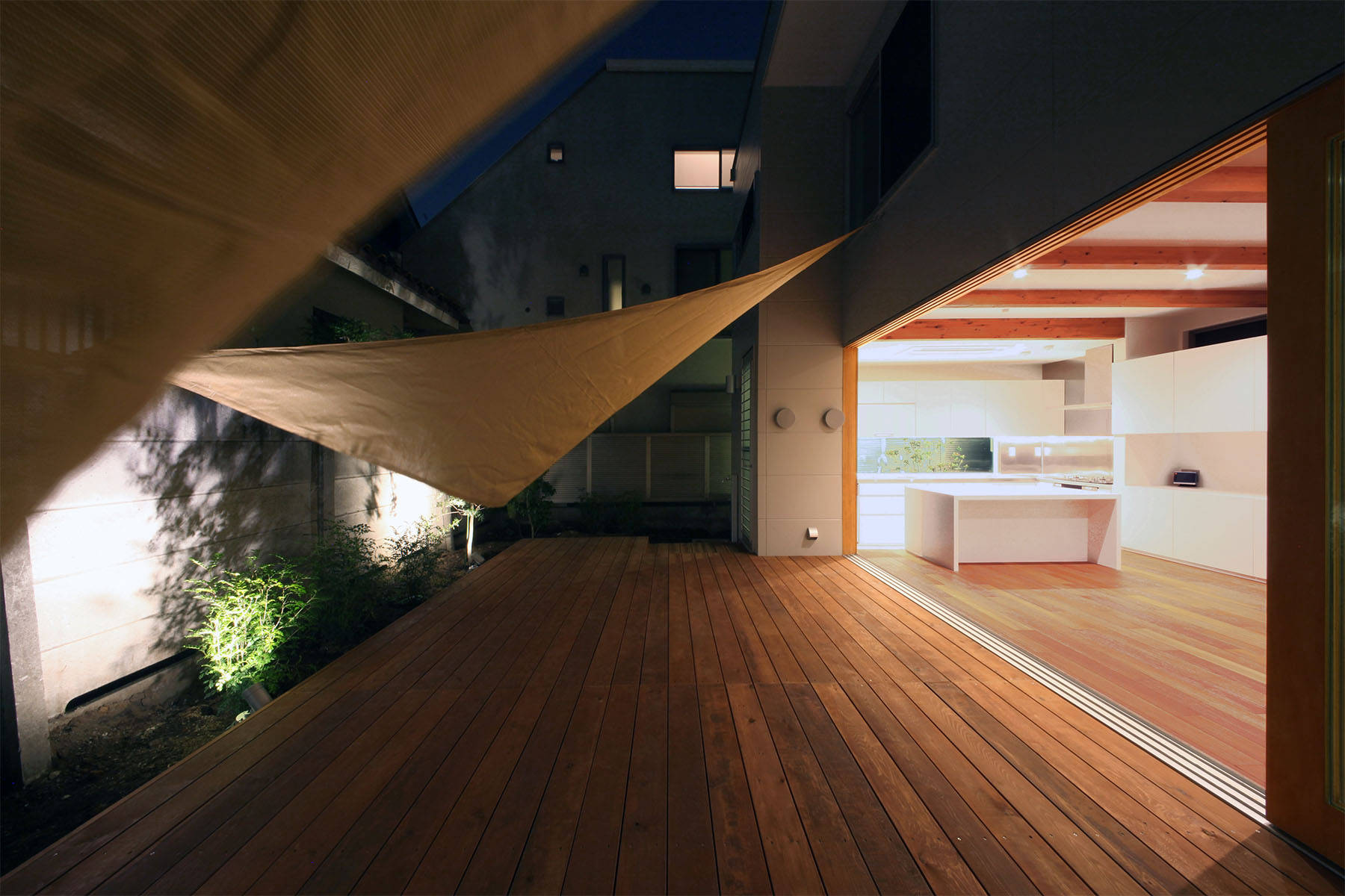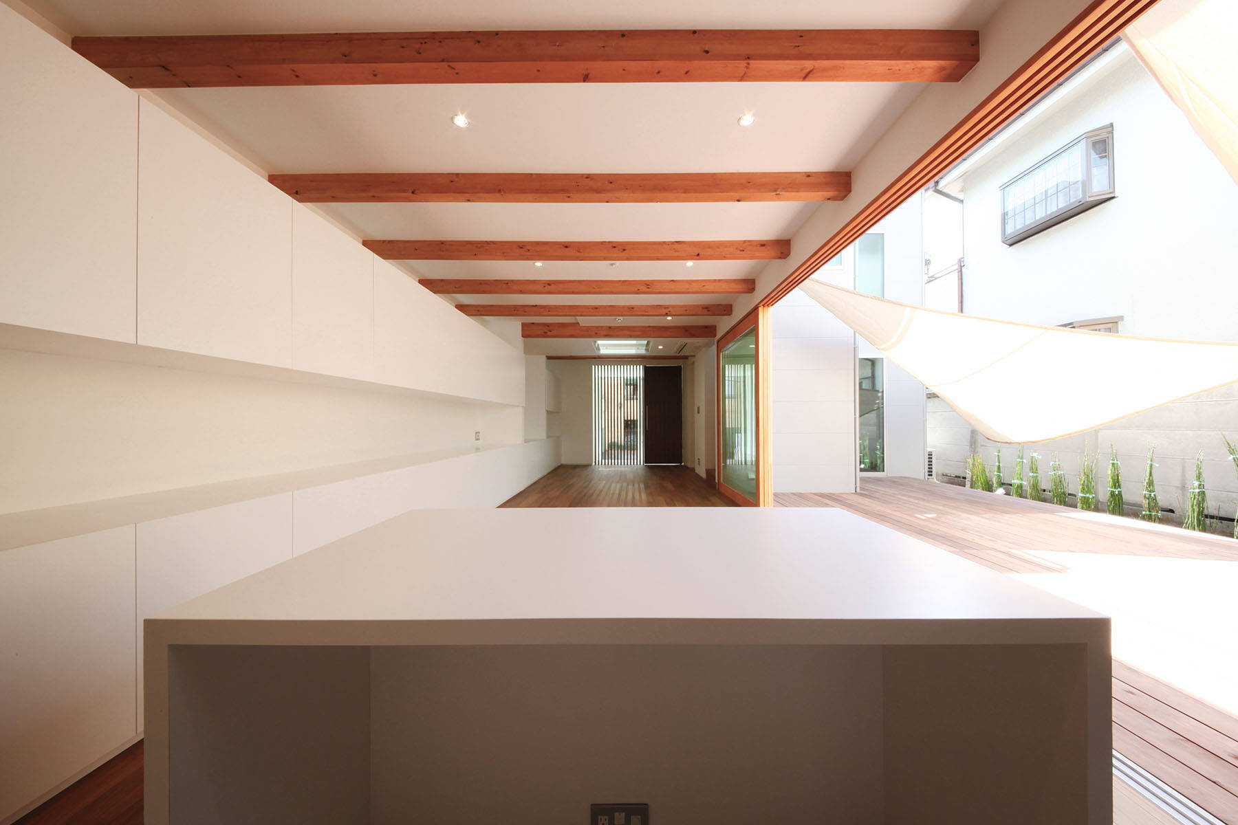 プライバシーに配慮するために南西面の道路からは玄関を介した採光だけを取り入れることにして、北西面に大型開口を設けて採光や通風を確保することで安定した室内環境を確保しています。LDKに面する大型のテラスはLDKを拡張させるだけでなく、多様な住み方を引き出しもう一つの寝室と合わせて一体の広がりを生んでいます。