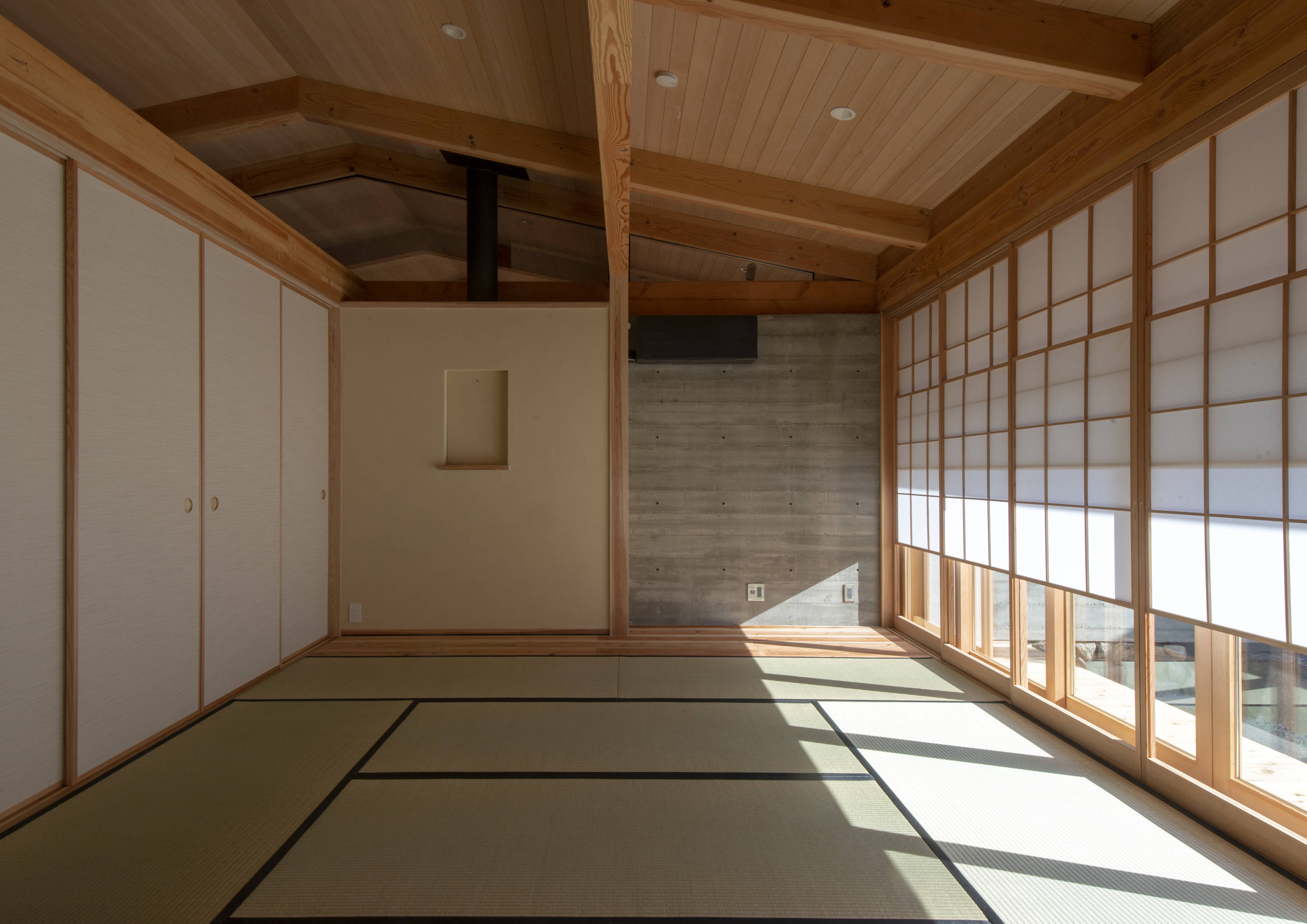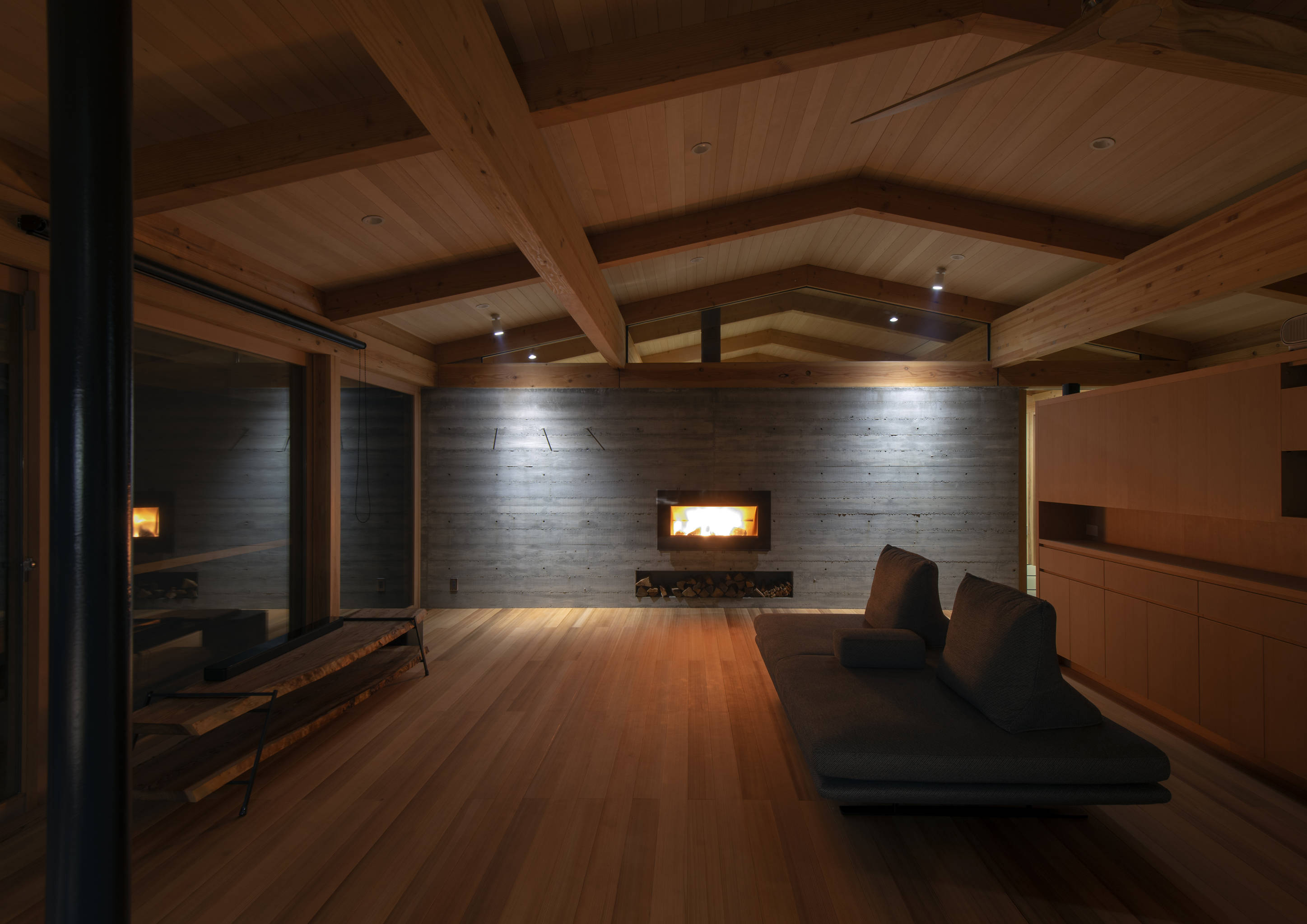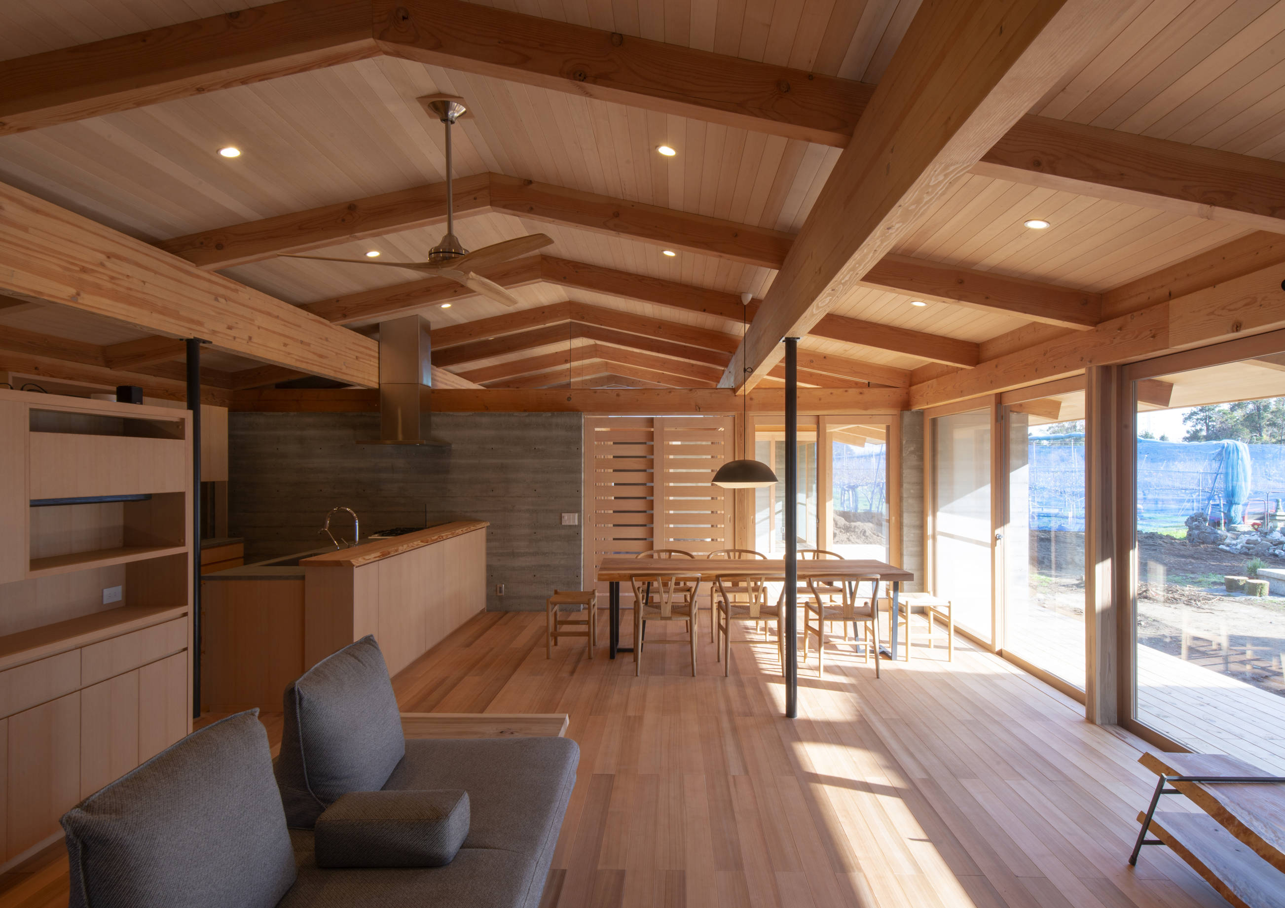 構造はRCと木造の混構造、ゾーンごとに地震力を受けるコンクリート壁を配置し、梁を井桁に組み登り梁を架けることで、壁に仕切られながらも小屋組みが連続する一つの空間をめざした。