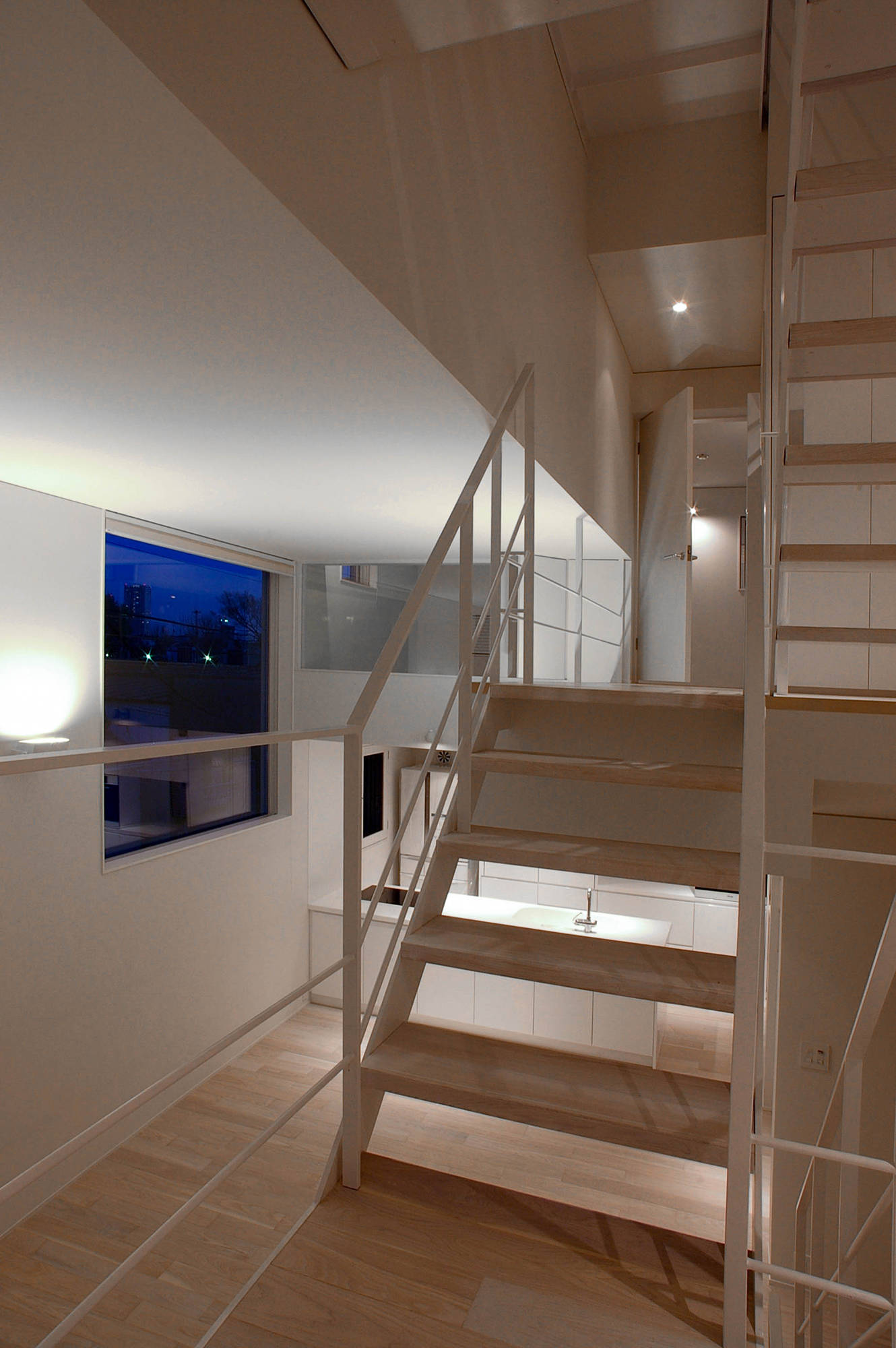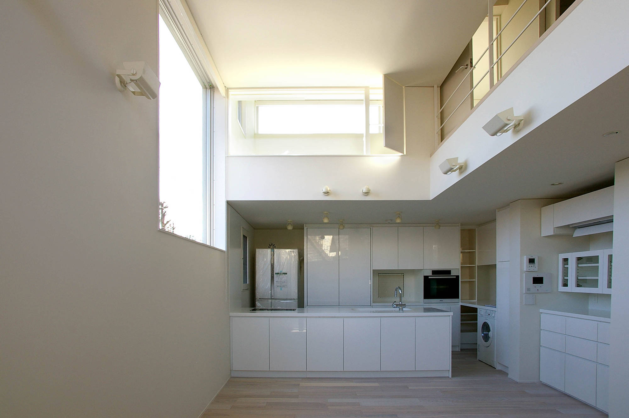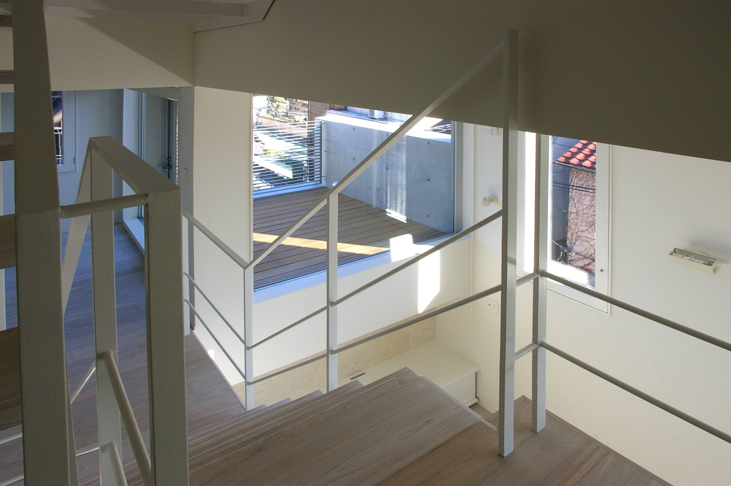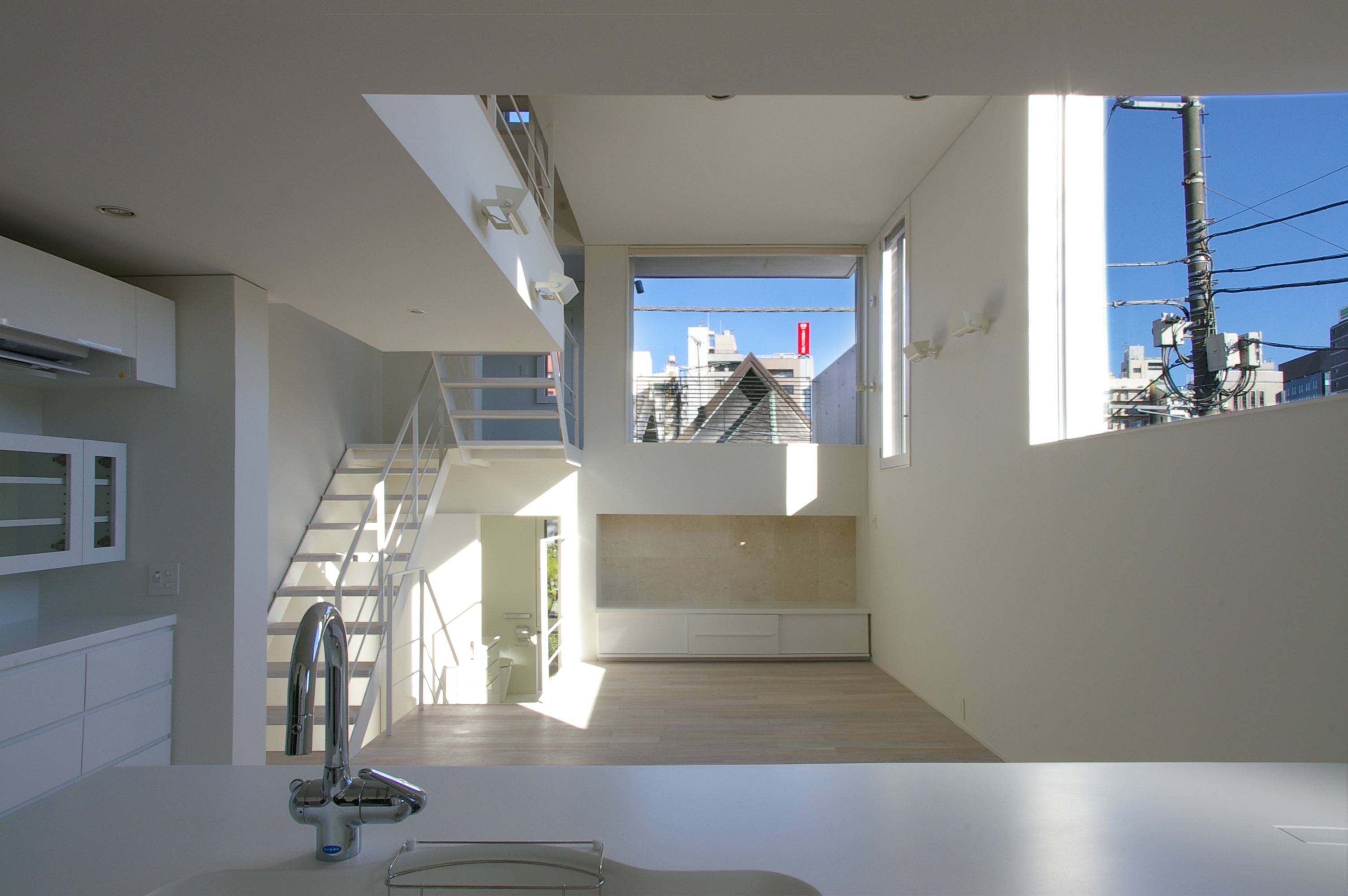 東京都心の住宅です。敷地面積は26坪ですが、分譲地規定により、引込通路を敷地内確保が条件で、実際に建設可能範囲は約15坪の敷地でした。狭小地で快適性を確保するためには、断面の工夫が必要ですが、吹抜けを設けると面積が削られます。