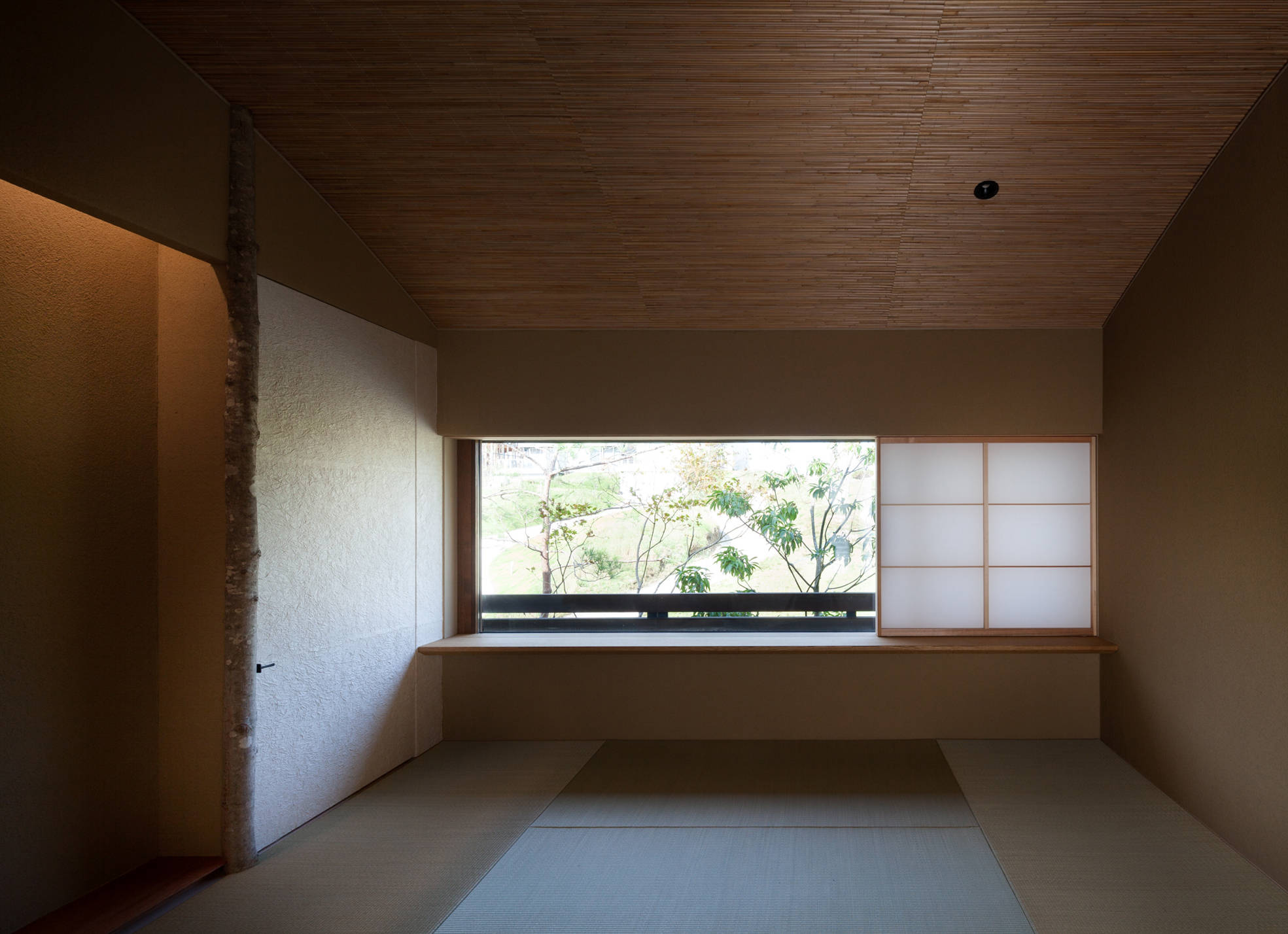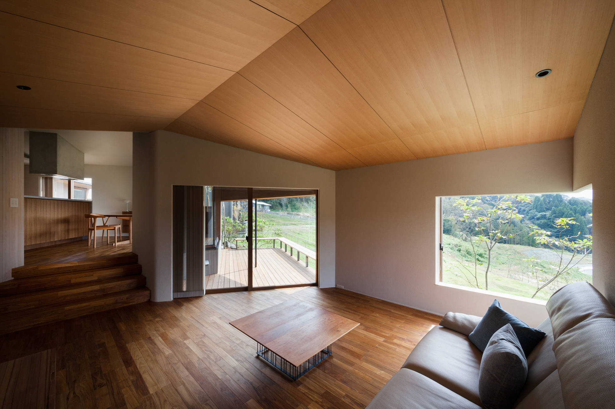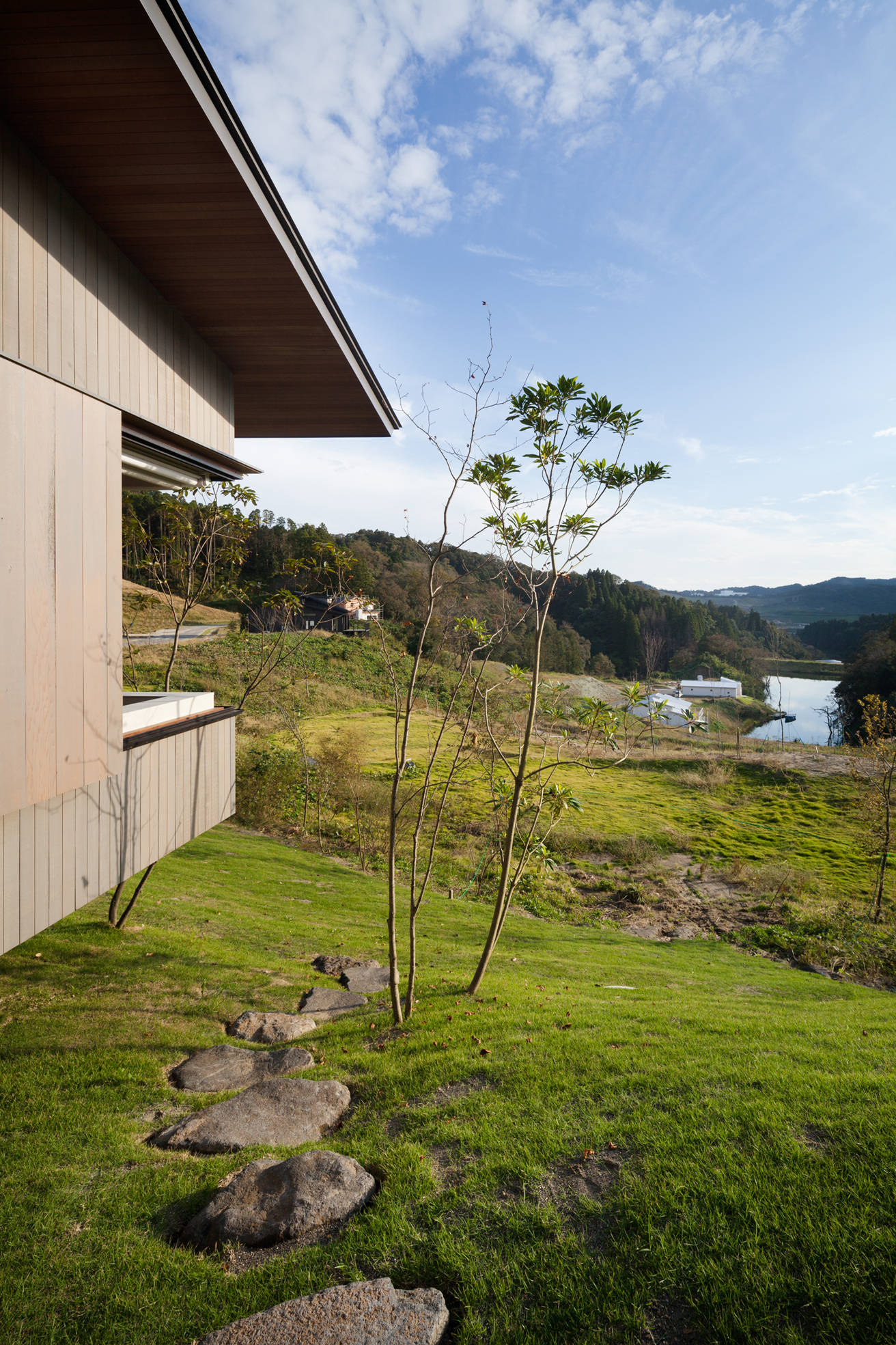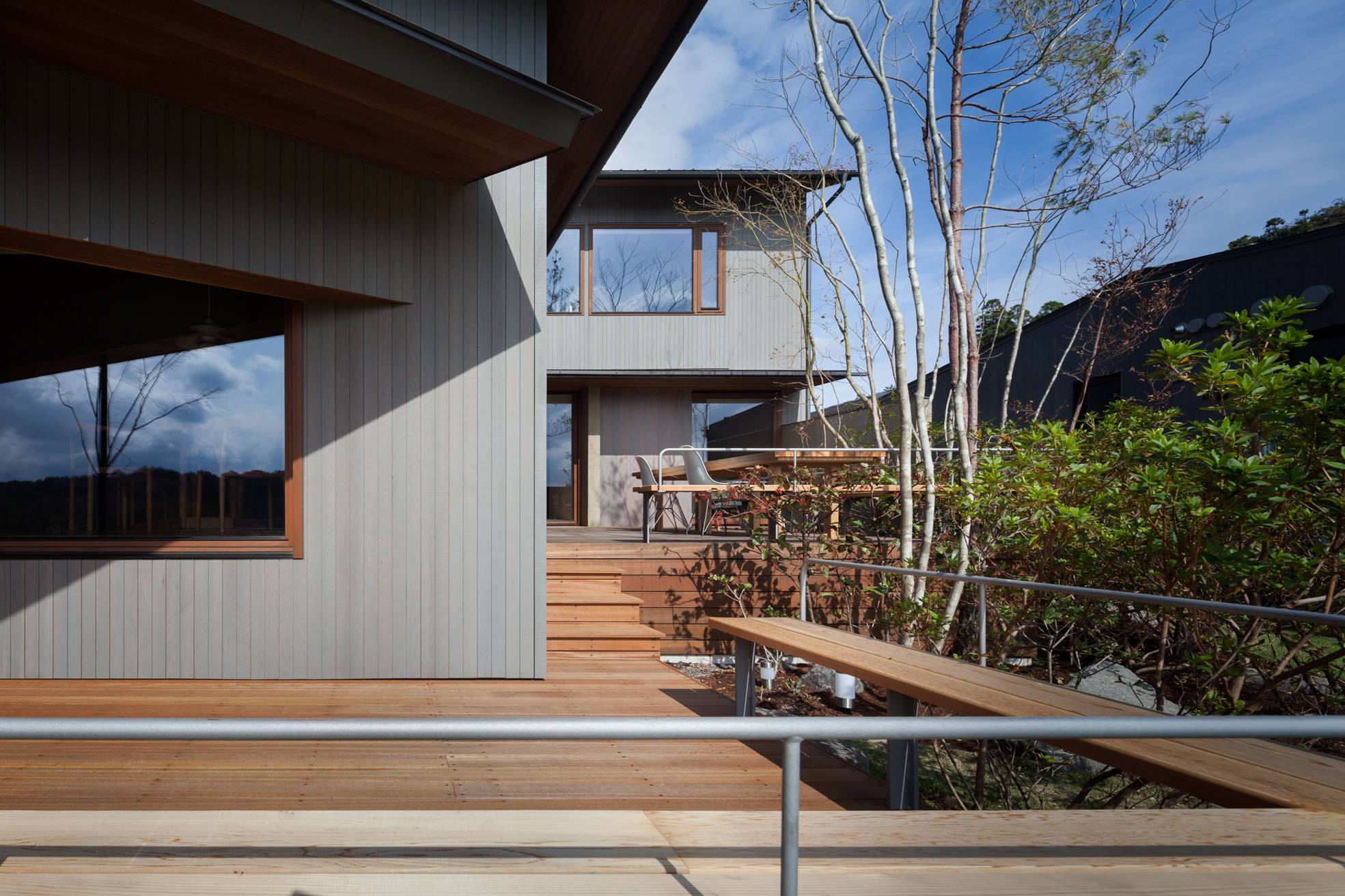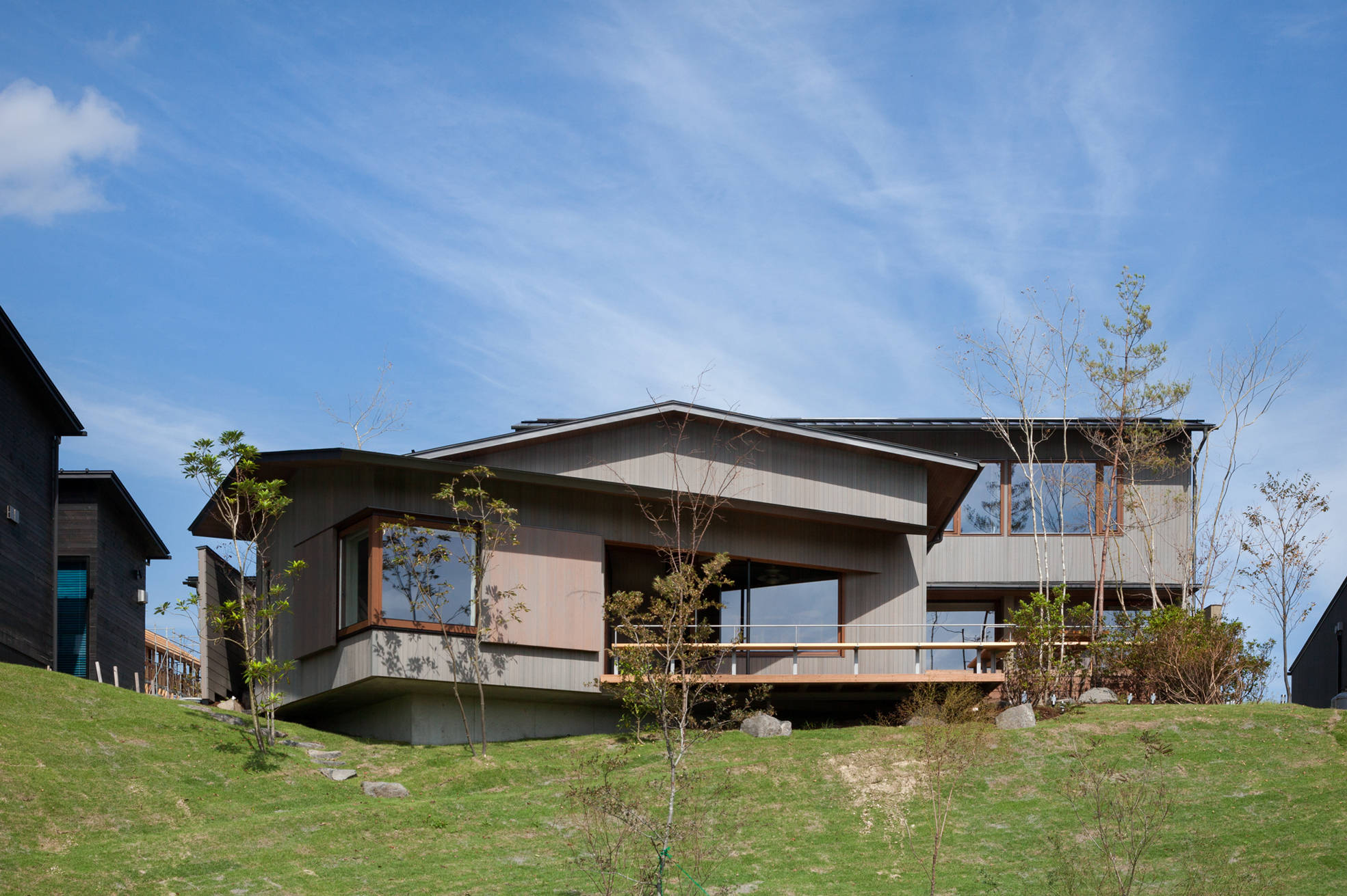 ゴルフコースと住まいが融合した新しいライフスタイルを提案するミュアヘッド・フィールズは、都会が失ってしまった世界がありました。広い空と森があり、湖があり、豊かな四季があり、機能や便利さで測れないものに囲まれています。その、湖畔を眼下に望む敷地は南下がりの傾斜地、湖の先や東側には森が広がります。提案した住まいは、4つの切り妻屋根がズレて南斜面に添うように雁行して配し、室内とウッドデッキは回遊性を持たせてスキップフロアで繋がっています。美しい風景と光が室内とつながり、静けさのあるそれぞれそこにしかない特徴を持った大小の居場所を設け、室内外のあちこちに散りばめています。