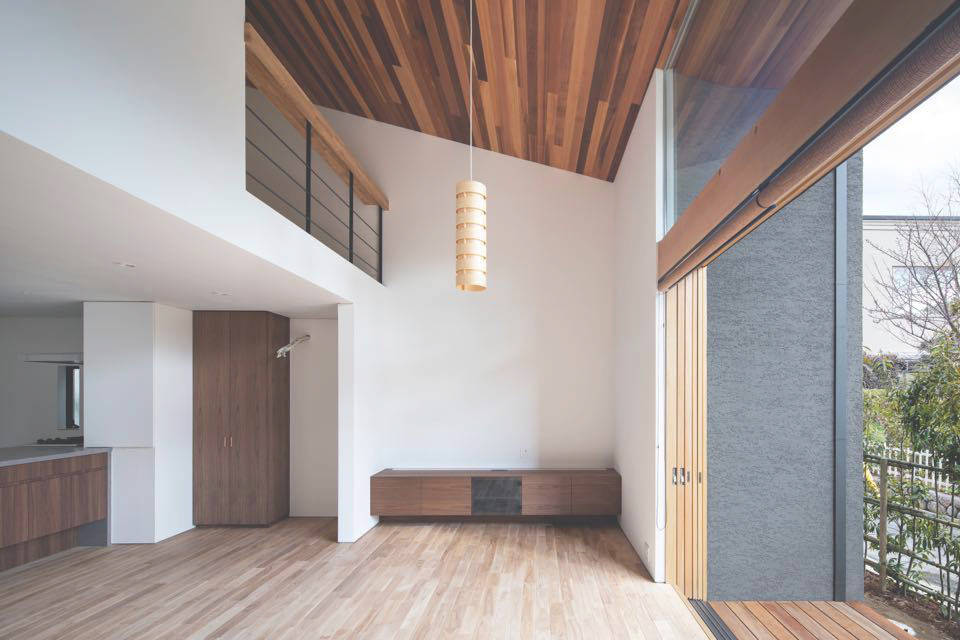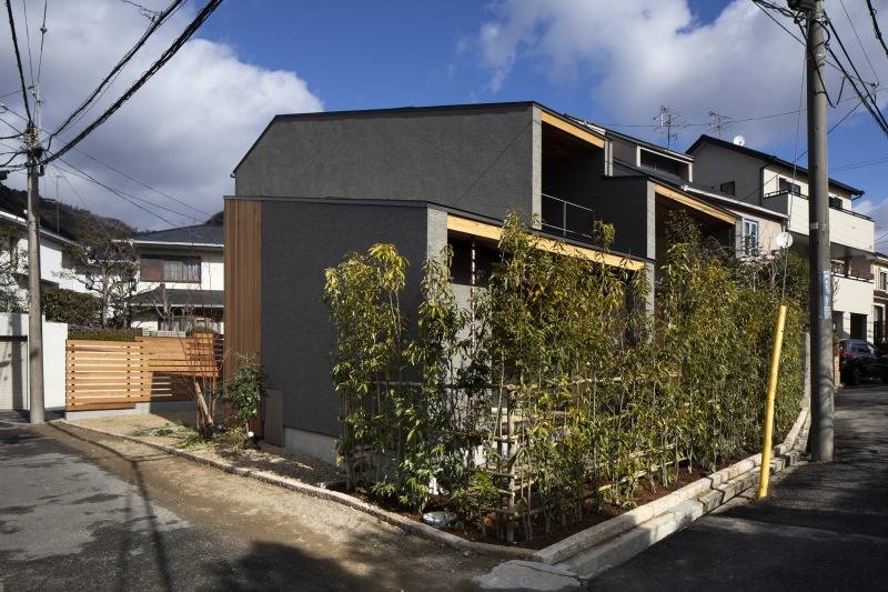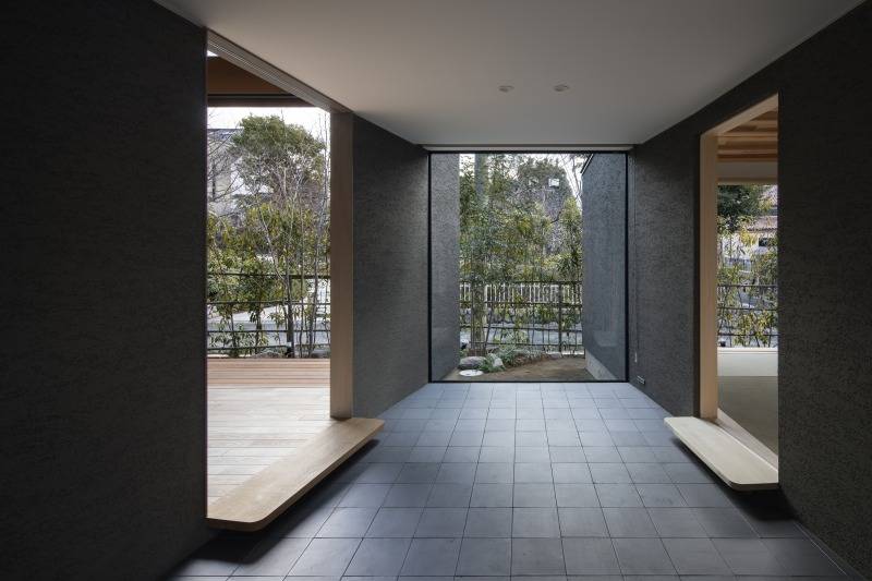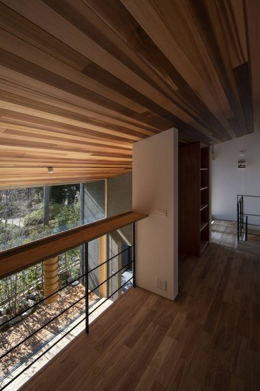 北側斜線の制約を受けながらも、南側を一層、北側を二層とし、公園側を低く、山側を高くしました。その上で、3枚の斜めの壁により開口部の狭広を作り、風を効果的に建物内部に引き込みます。また、内部で風が立体的に廻るように吹抜けや階段で上下を繋いでいます。その結果、山からの風が抜ける南側の開口は公園に開いた大きな窓となり、海からの風が抜ける北側の開口は六甲山に開いた大きな窓なり、眺望と風を取り入れる配慮を形として表しました。
