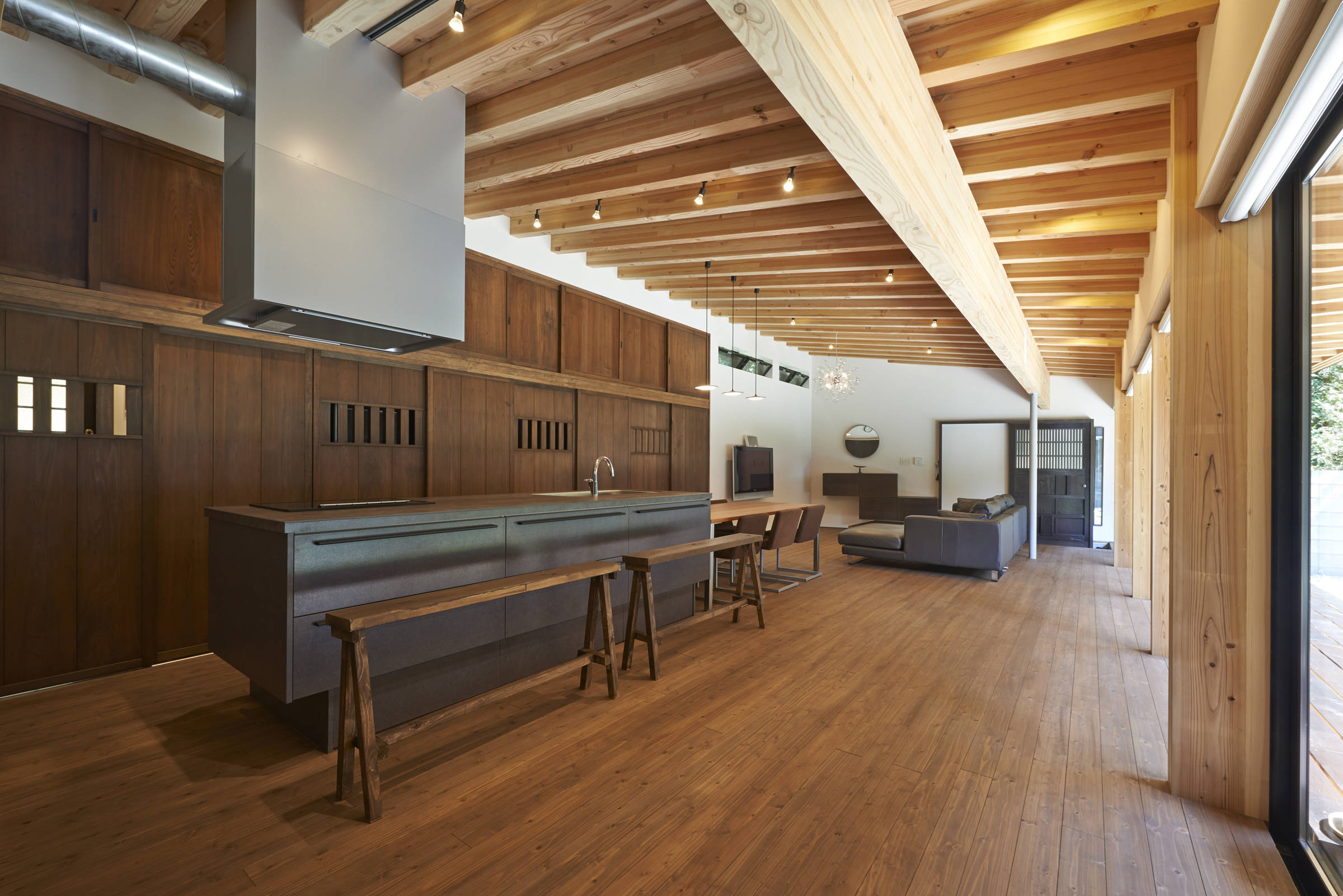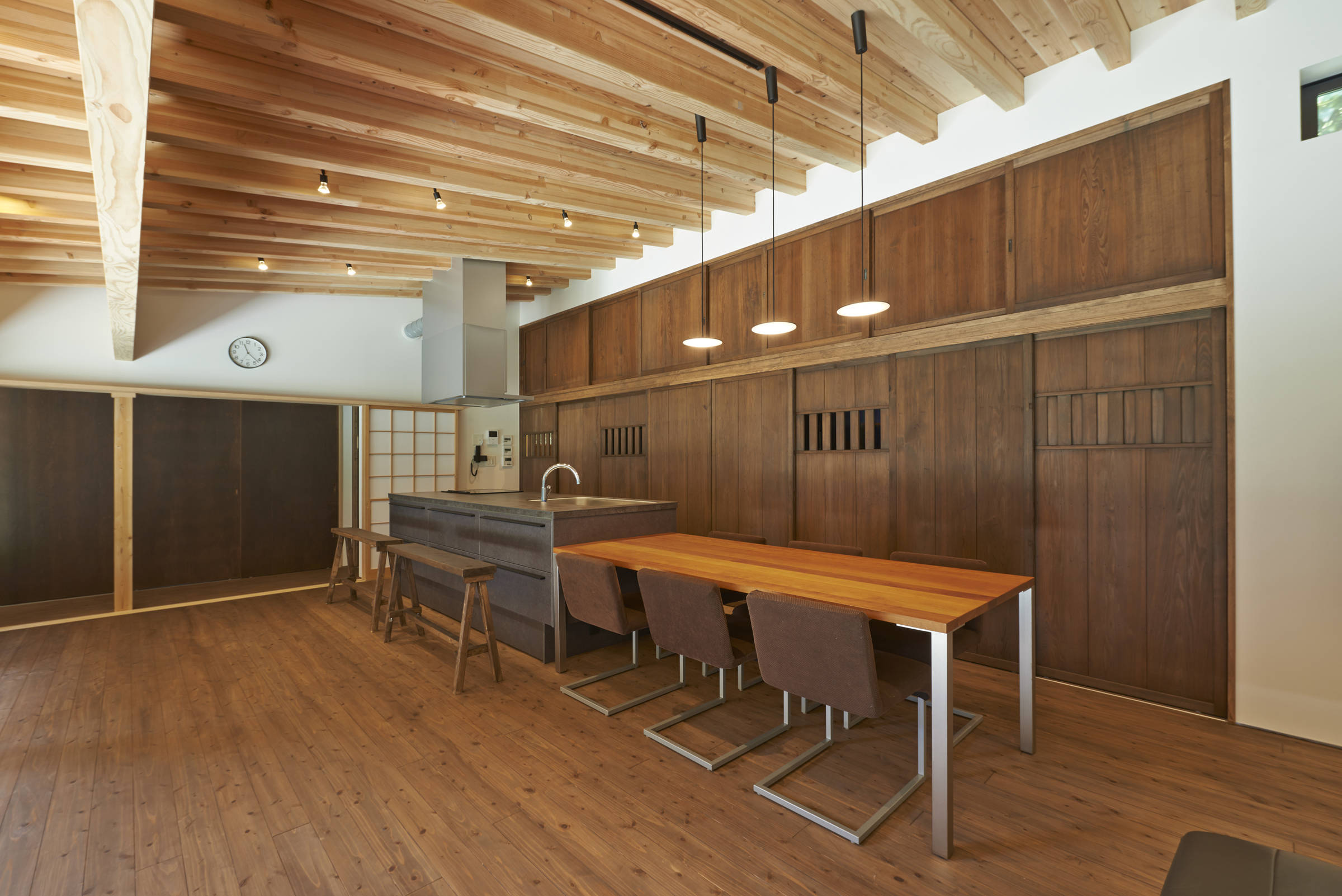 仕上げは木を多用し落ち着きのある空間としました。杉の雨戸や蔵戸をオイル塗装して古材の再生利用もしました。床や建具はクライアントさんがDIYで塗装され、愛着のある住居となりました。