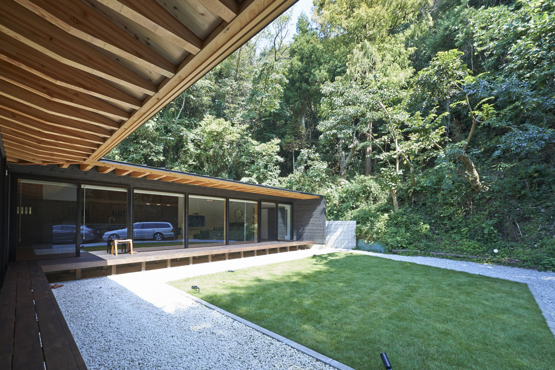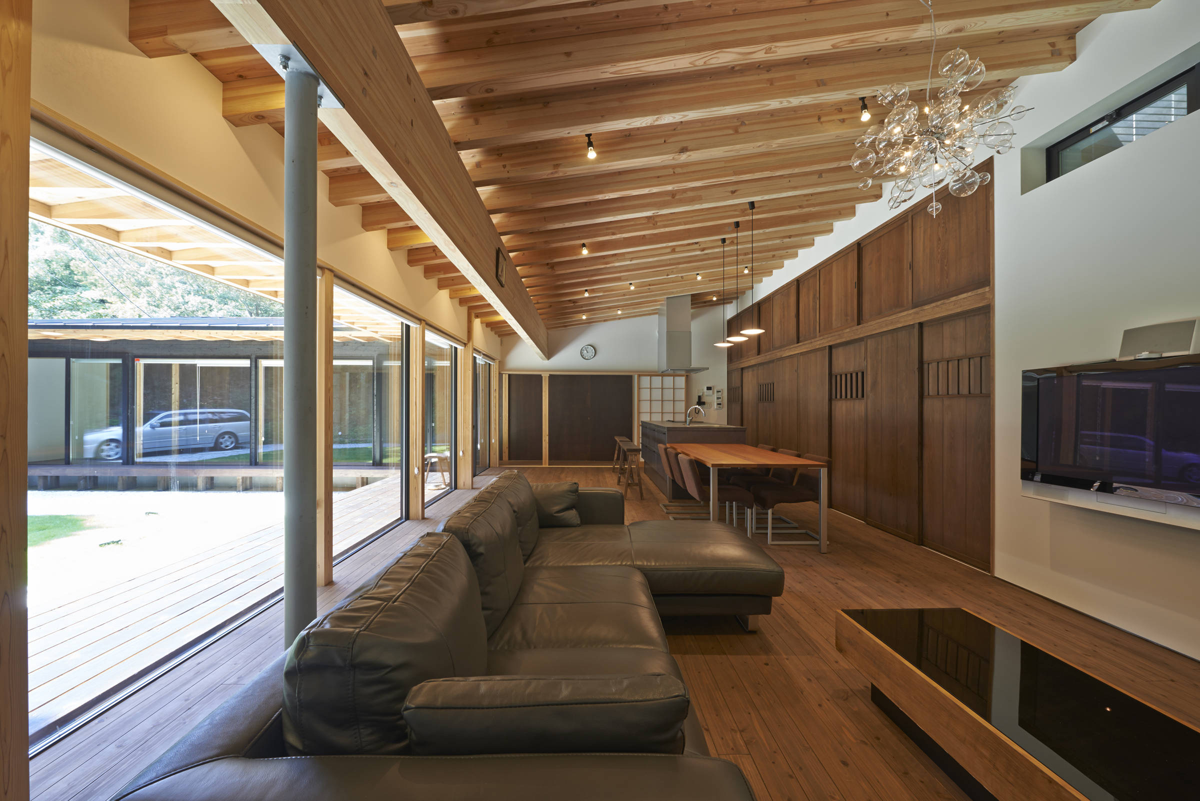 環境が良いため、自然と一体化した空間を目指しました。その為に建物が庭に面している部分に壁をつくらず、視線を遮らない開放的な空間としました。オーダーの大サッシをつかい、サッシ枠を床や天井で見切り、縁側と室内の床レベルを揃えて、室内外が繋がったような空間としました。個室は西隣地側に纏め、リビングを大きくとっています。庭に面し一間の軒を取り、快適な半屋外空間をつくりました。勾配屋根と軒により夏の日射を遮り、上部の窓から自然換気をする、環境を活かした設計としました。