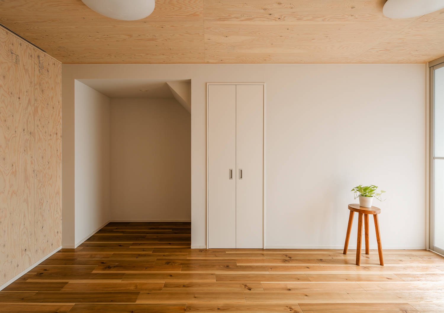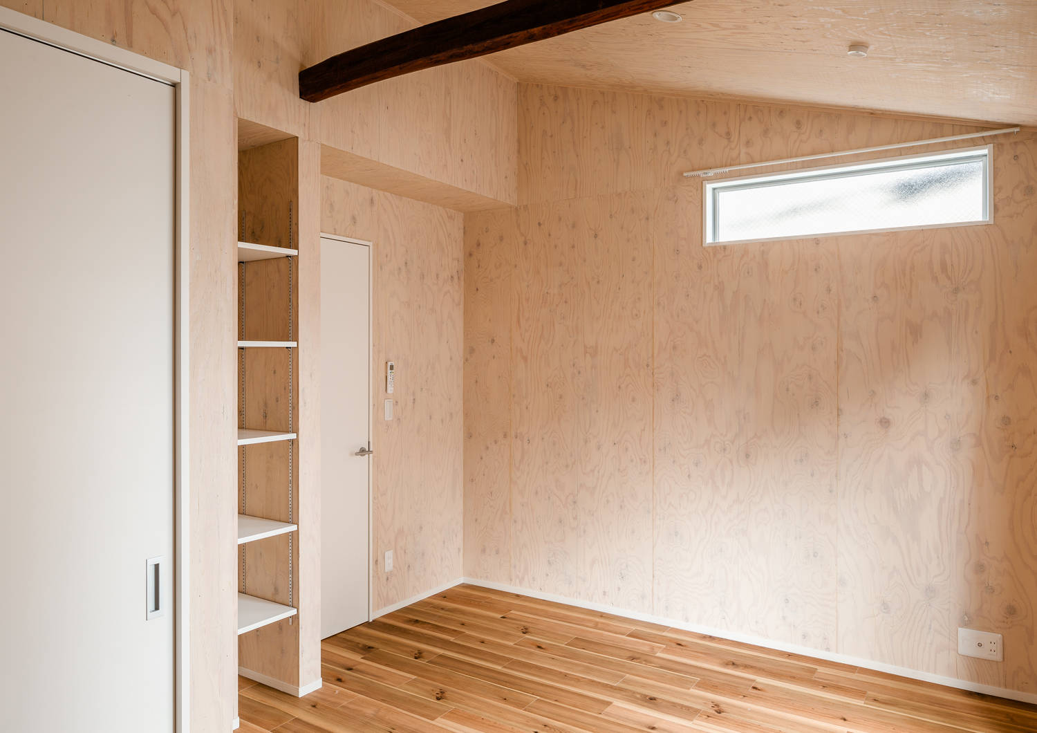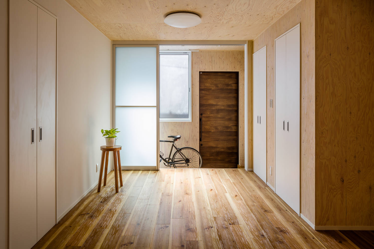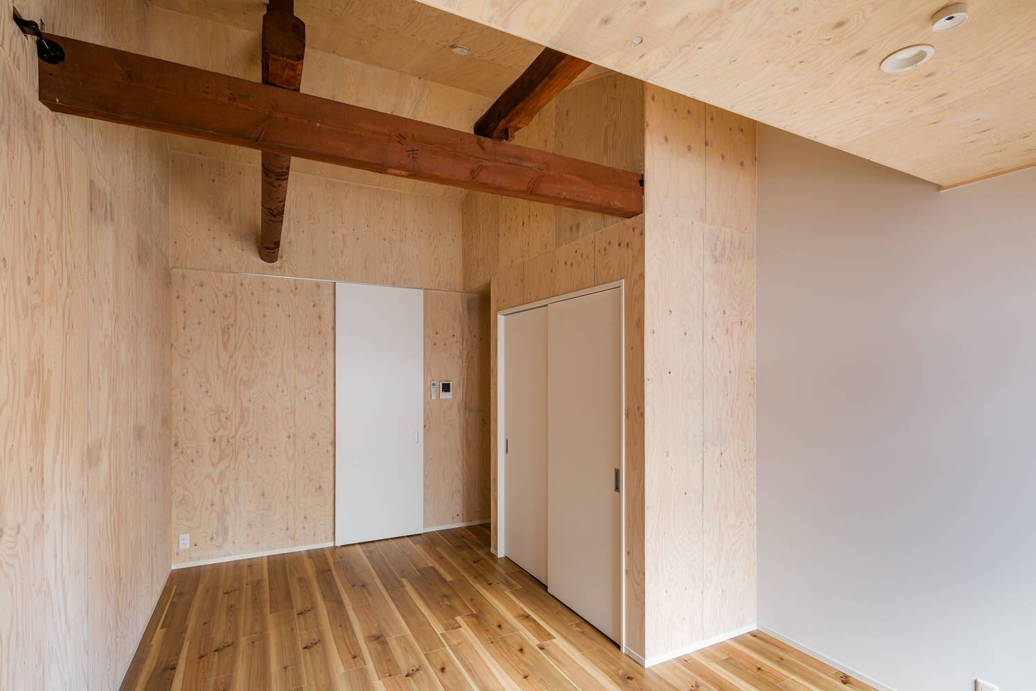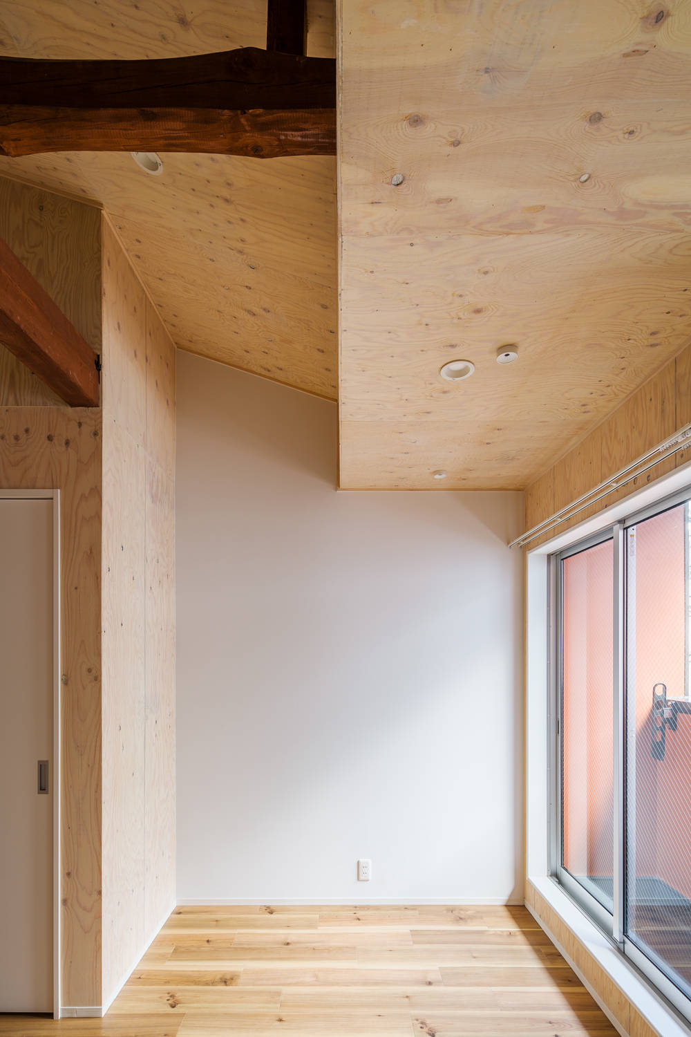 住宅密集地の建物は、目の前が道路でプライバシーが損なわれていました。そこで土間空間を設け、外部との干渉エリアかつ自転車置場・洗濯物干場とし、光を取り入れる明るい部屋でありながら、外から覗かれない空間としています。内部は、構造の梁を見せ、フローリングと木製合板の壁が、心地よい空間になっています。