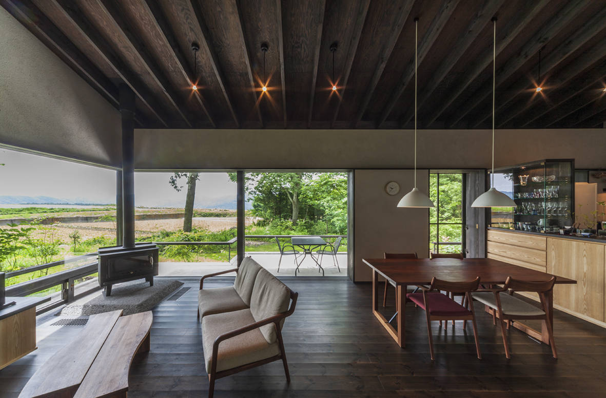 当然のこととして、居間・食堂のメインの開口部からは、それらの庭と広葉樹の大木を近くの眺めに採り込んで、横長に遠方の山が連なる景色を生け捕った。