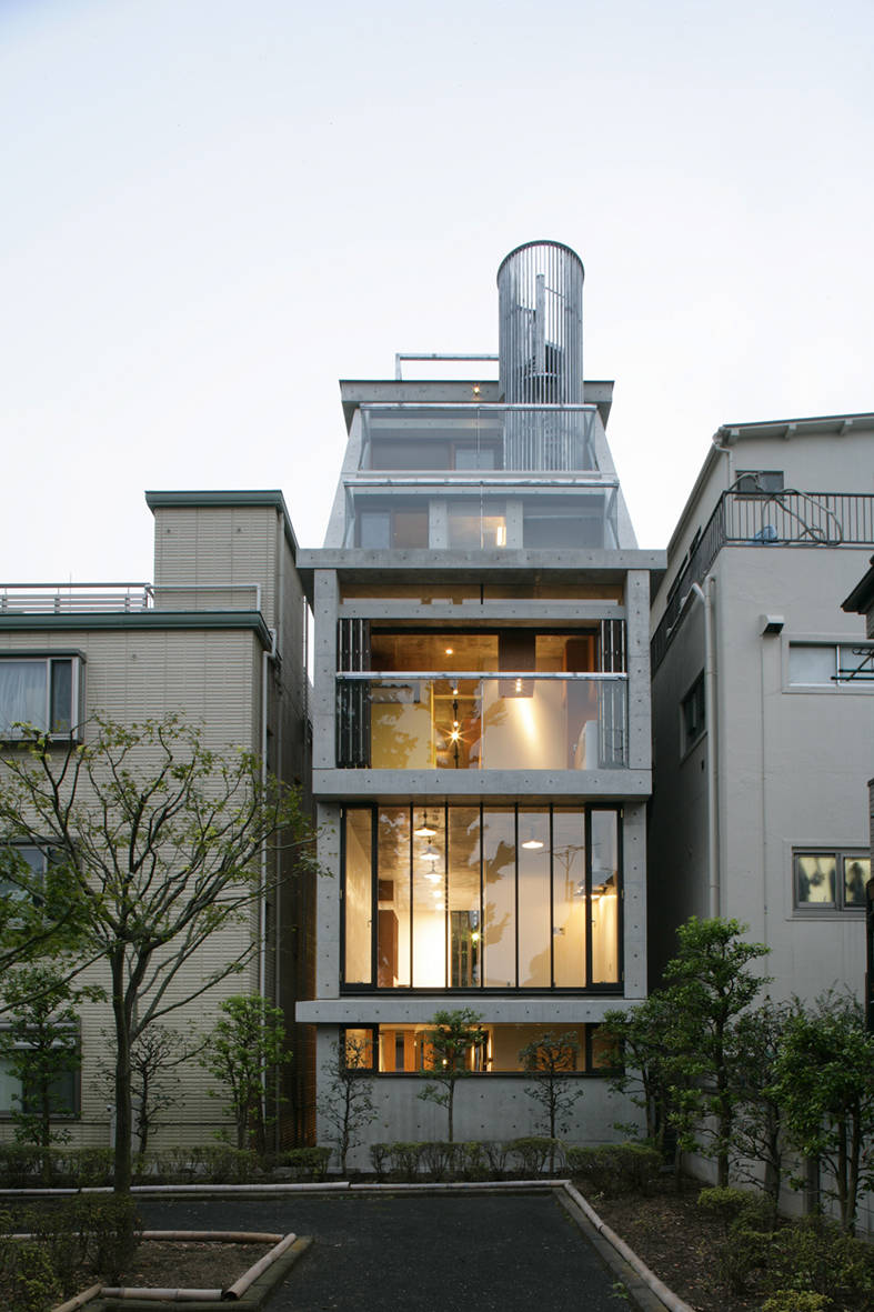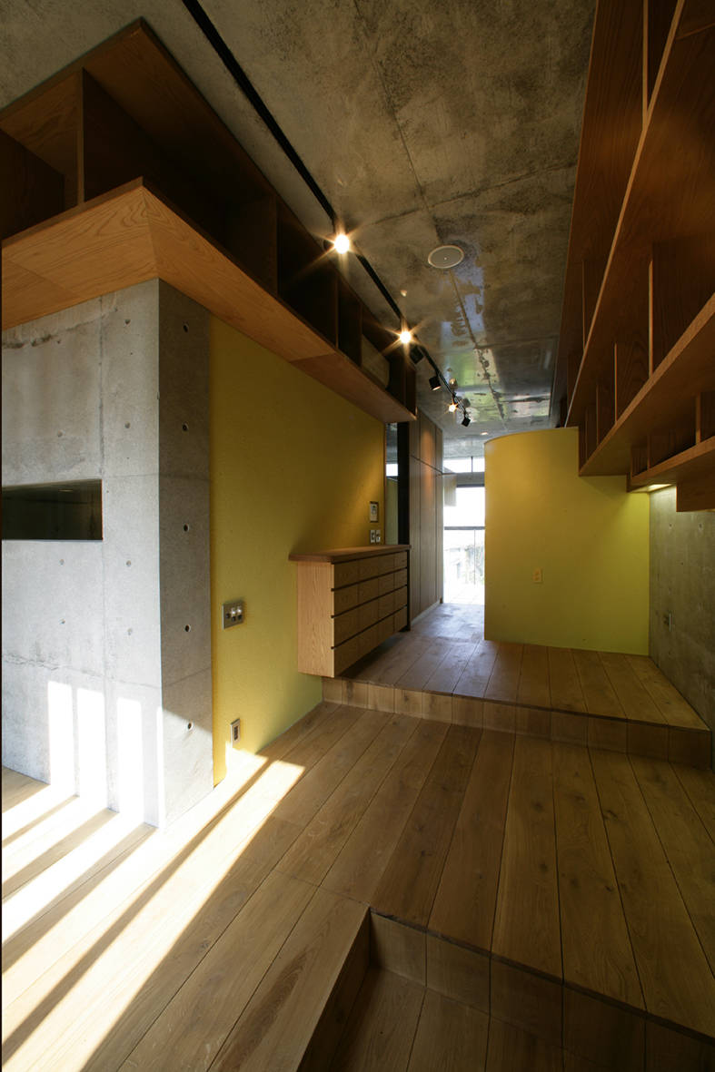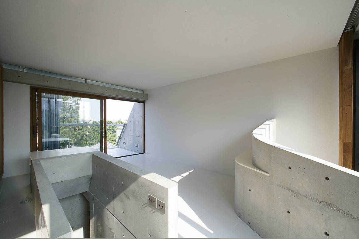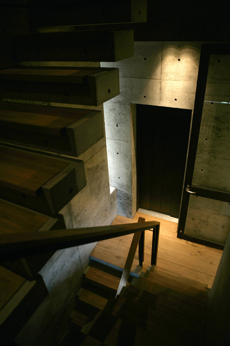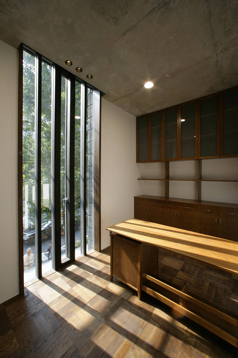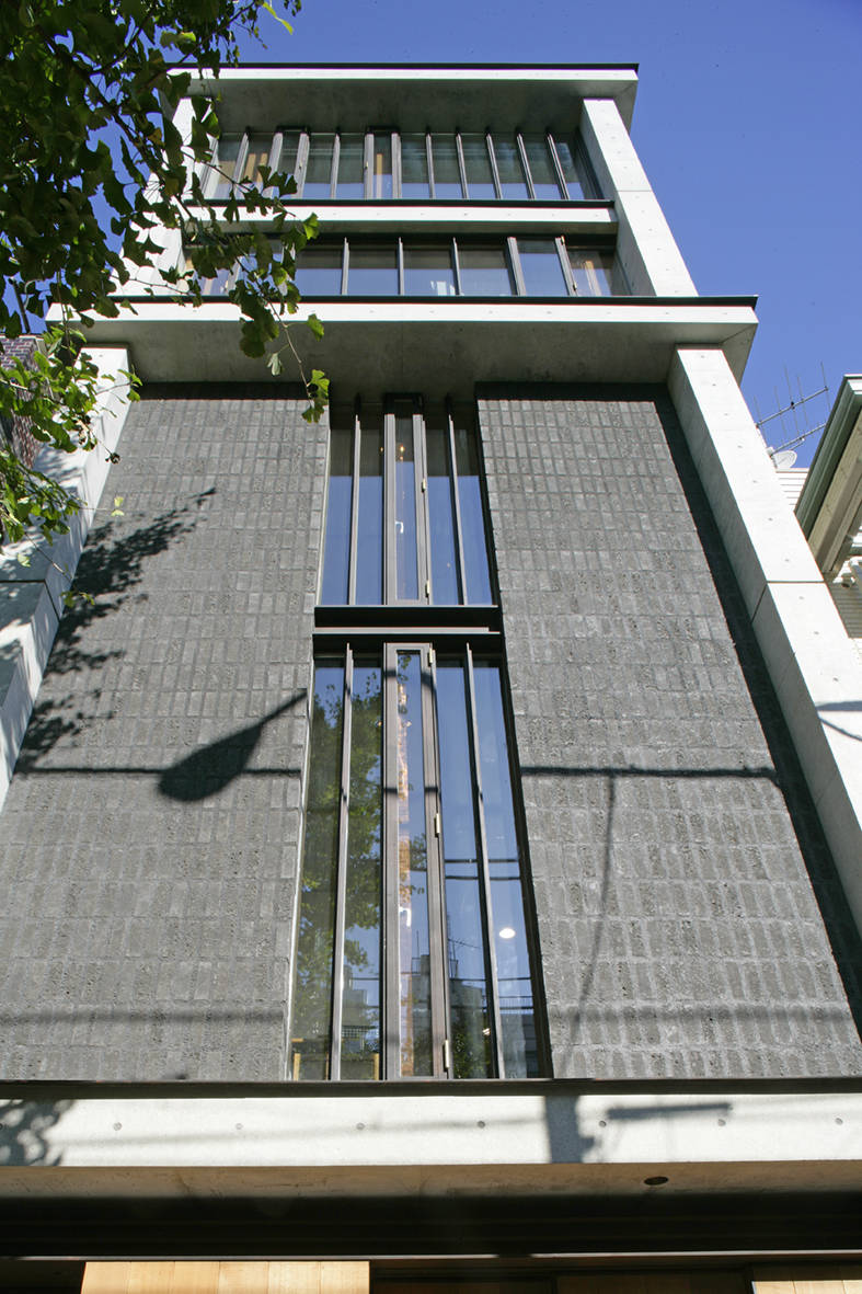 一方で南面する青梅街道側の下層階は交通騒音の影響が強いので、コンクリートの両壁に特注した二丁掛けの墨色タイルを太目地芋貼りとしている。道路からの防音を意図して、壁面中央をスリット開口にした。そして内部から街路樹を見せて陽光を採り入れた。