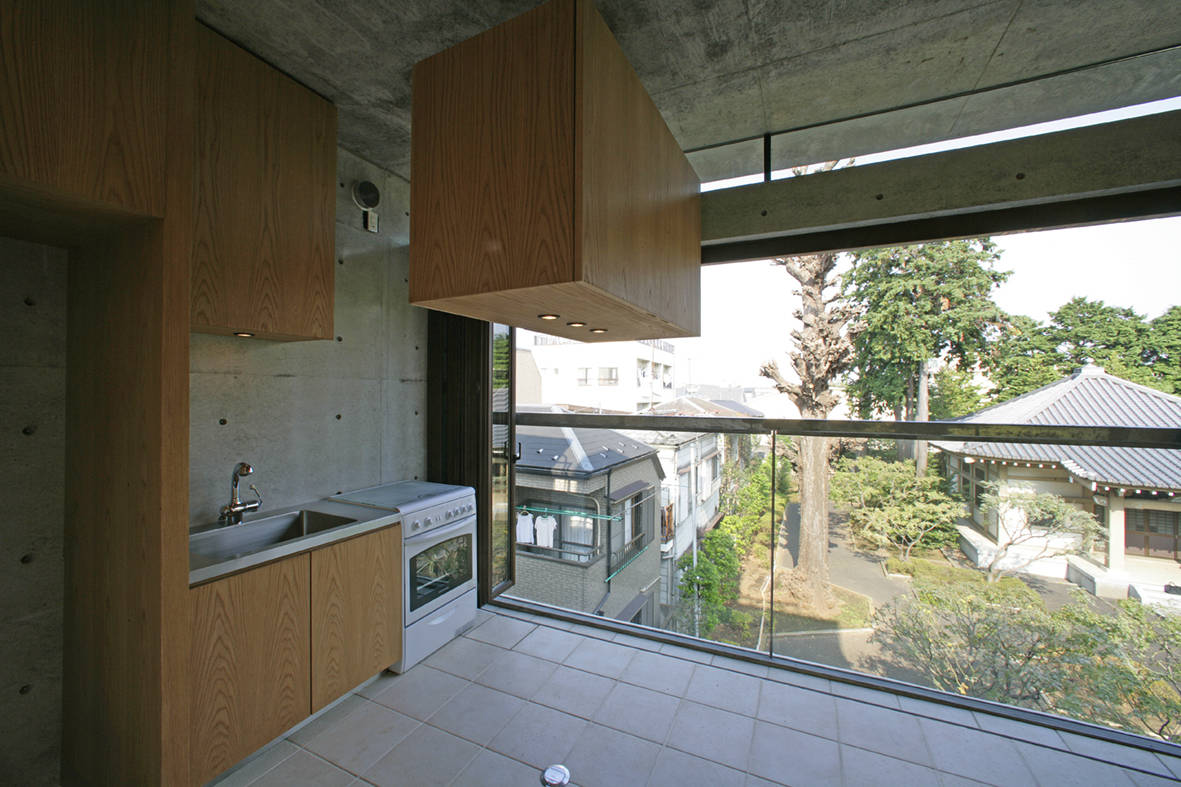 この敷地は運良く北側に緑の多い薬王院の境内を一望でき、上層階の南側からは天祖神社の比較的大きな森が見え、北の遠方には観泉寺の森が見える。さらには東側、青梅街道の延長戦上に東京都庁舎が遠望できる恵まれた環境にある。したがって各階の北側内部からは京都、幡枝離宮跡である円通寺に代表される借景の手法を用いて、隣接する薬王院の境内に向けて大きく開放した。そして寺院の本堂と杉と銀杏の大木の立つ姿を横長の開口部によって生け採った。