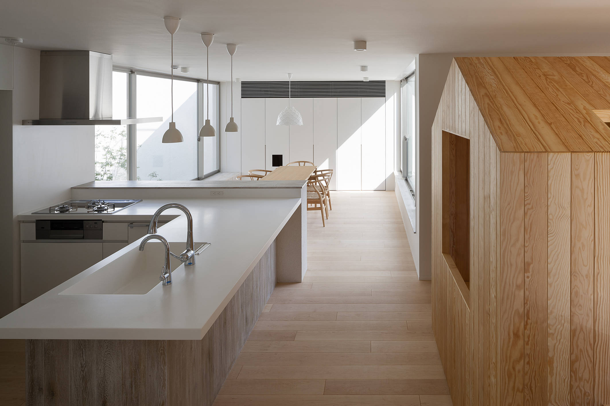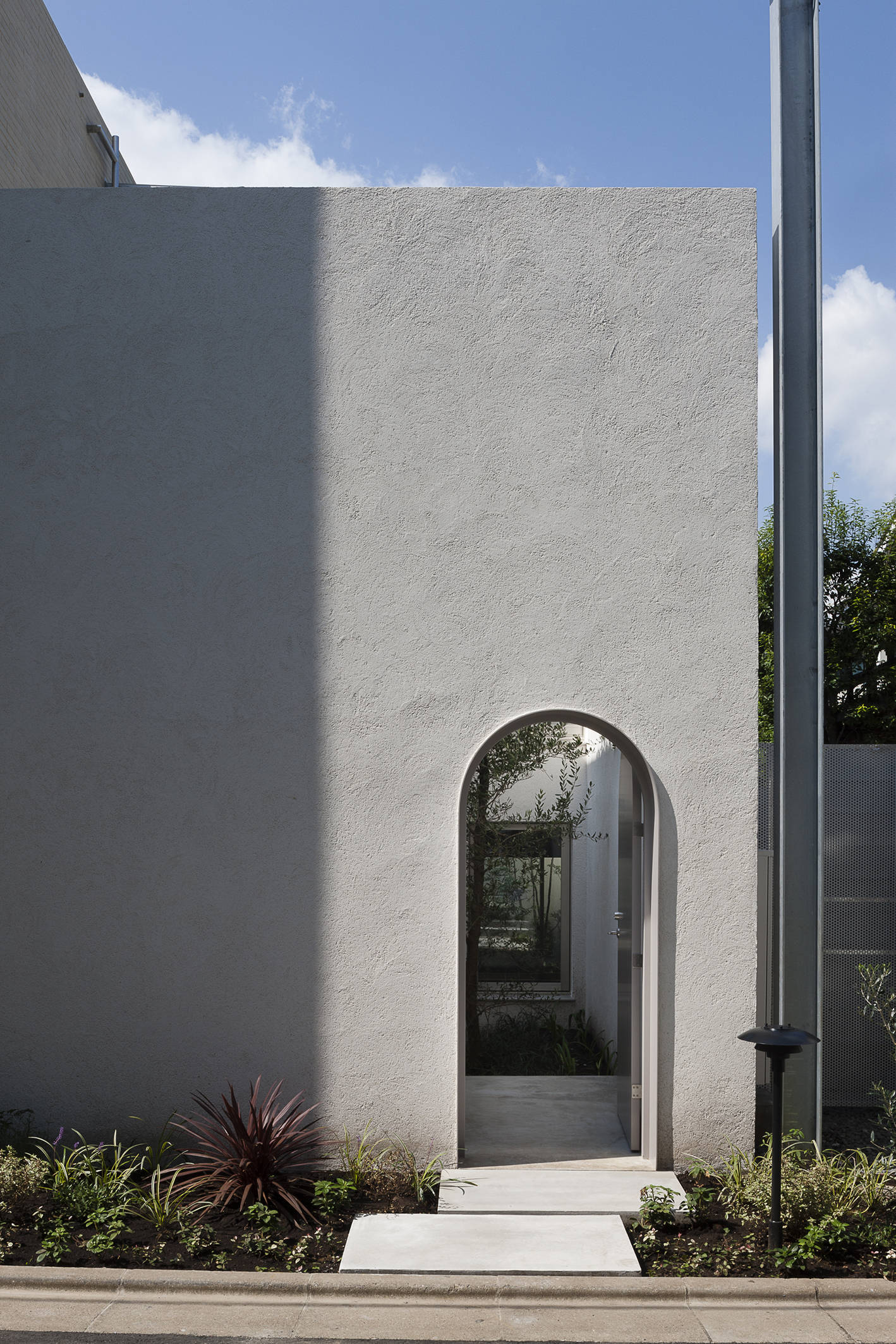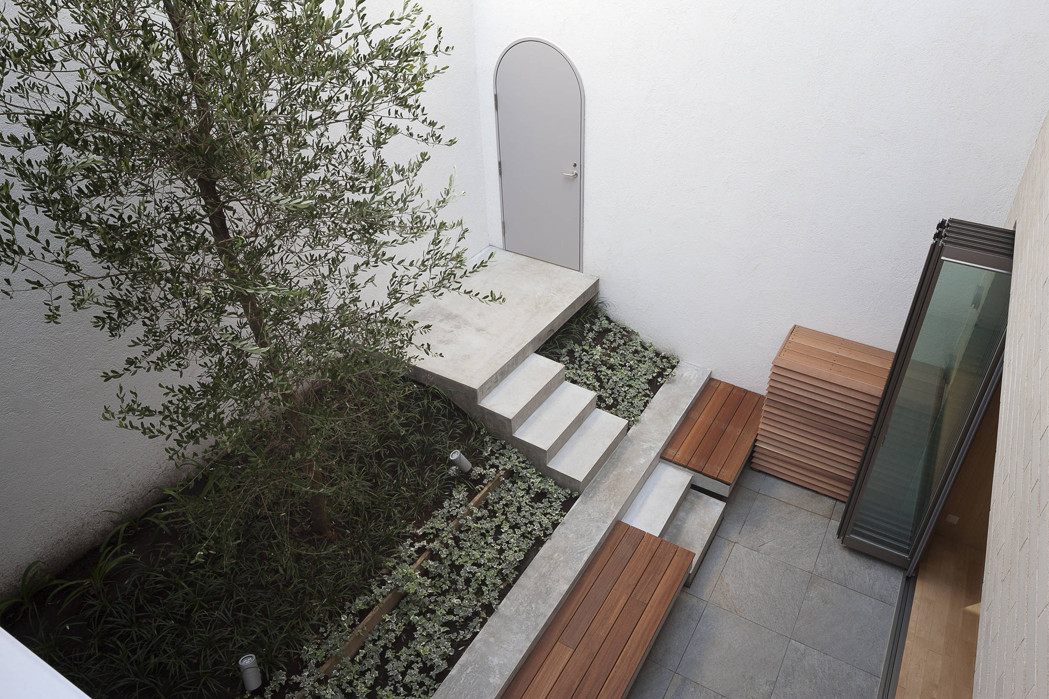 敷地は商店街と住宅街の境目に位置する。プライバシーを考慮しつつ、心地良いゆったりとした生活空間が要求された。建物外周部に街との緩衝帯として3つの庭と大きなテラスを設けた。ひとつはテラスへ直接アクセスする庭で、水を張ると水盤となり、大きなクスノキが緩衝帯となって街の喧噪から離れたくつろぎの空間への導入となる。オリーブが植えられた2つめの庭は扉を開放することでスタジオと一体的に利用できる。3つめの庭はゲストルームに面し落ち着いた趣となっている。庭の樹木は上階のダイニングからも見え、北側にあるダイニングが明るく心地良い空間となるようにした。外部から直接アクセスできる半地下にはスタジオとゲストルームを設けた。1階は半地下と上階の生活エリアを繋ぎ、2階はテラスを中心に、ダイニング、キッチンなどのファミリースペースとリビングをスキップさせながら繋げた。テラスに面した扉を開放すると、取り巻く居室と一体となってよりダイナミックな空間となる。3階は寝室、水廻りを家事動線を考慮して配置した。外壁の配置や高さは周辺建物との関係を考慮しつつ決定し、外壁の素材は均質で大づくりな外観にならないよう変化を持たせた。