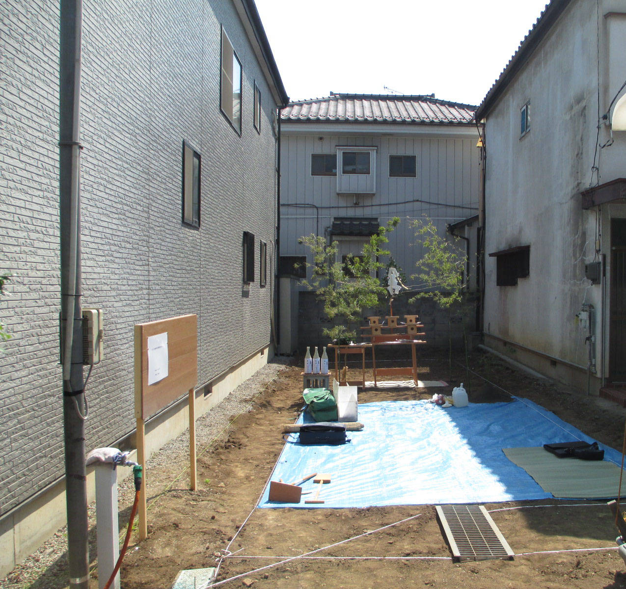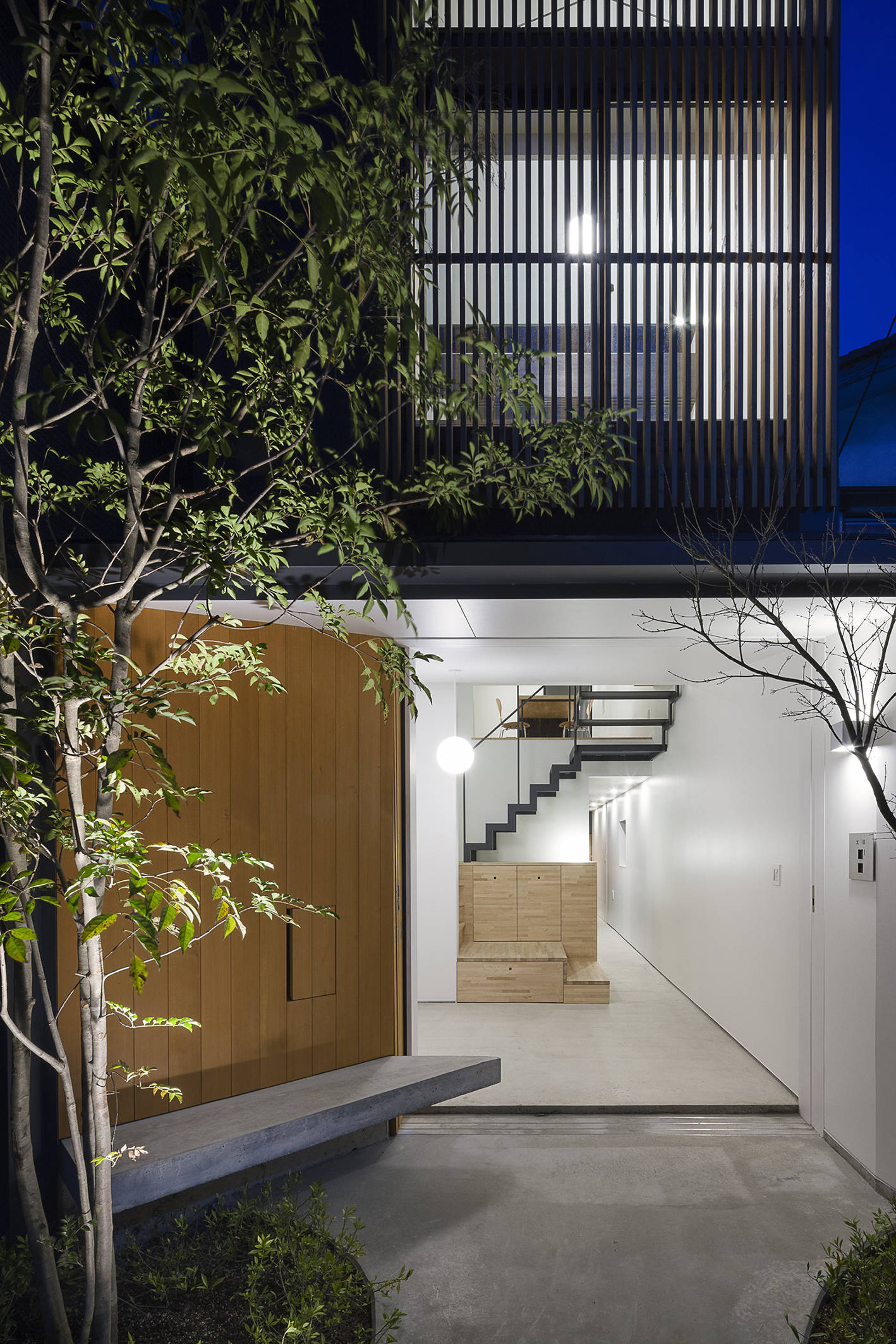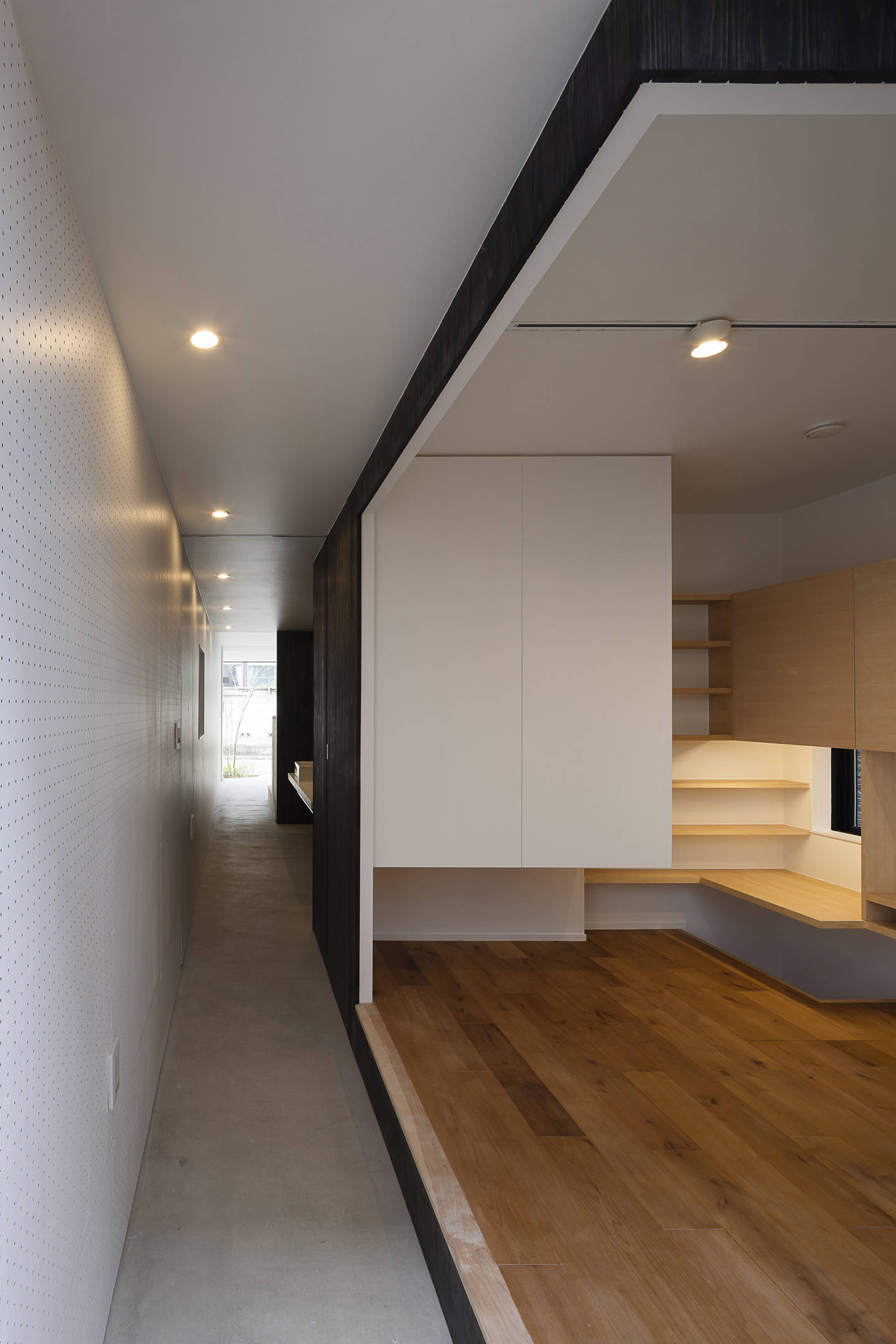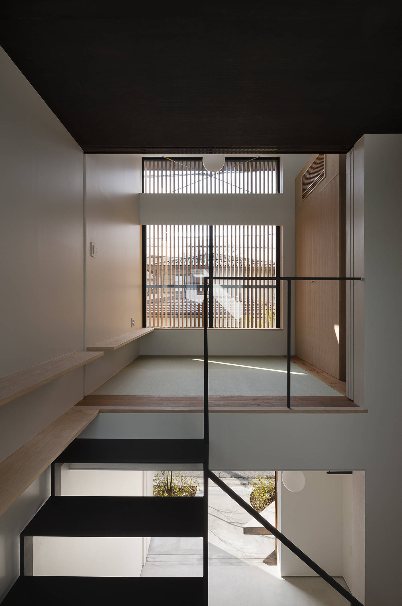 この町家は3つのテーマを持つ。1つ目は川越の街並みに配慮し、街との関係性を密接にする事である。外壁の塗装色や木の縦格子、平入りの屋根形状は蔵造りの街並みの雰囲気を引き継いでいる。道路に面する土間の格子戸を全開すると、地域の人たちが気軽に立ち寄ったり、川越まつりの際にセミパブリックスペースとして利用できる。2つ目はいくつかの小間を、それぞれの距離感を大切にしながら配置している事である。10個の小間の引戸を開閉する事により、街と家、それぞれの居場所に多様な距離感と関係性をもたらす。3つ目は光や風を取り込みつつ、効率的な自然エネルギーの利用を図る事である。高窓から程良い光を取り込み、小さな窓は換気の機能とした。屋根に集熱パネルを設け給湯システムを担うと同時に、将来温水ルームヒーターを活用することができる様になっている。またロフトの天井付近から1階の土間に温かい空気を送風するシステムを導入し、冬季の冷え込み対策としている。