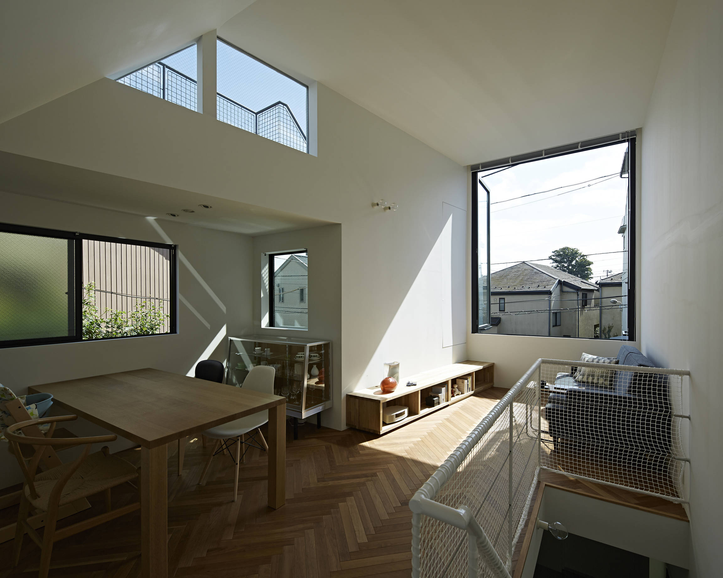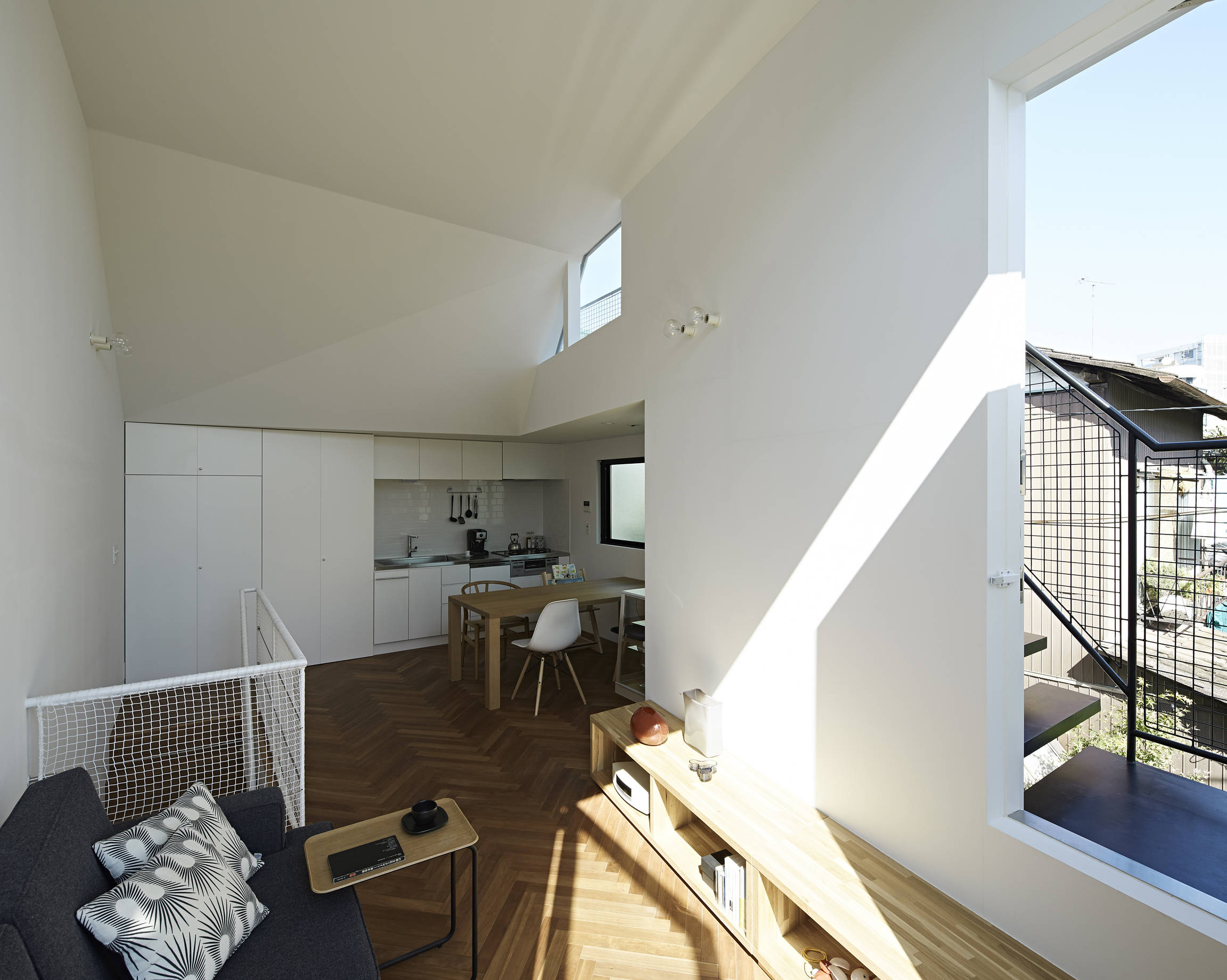 2階リビングには大きな両開きの窓を設けました。窓を開けると、家の内外がつながる心地のよい空間となります。屋上へは外階段で直接つながるので、頭上にも地面があるような不思議な安心感が得られます。