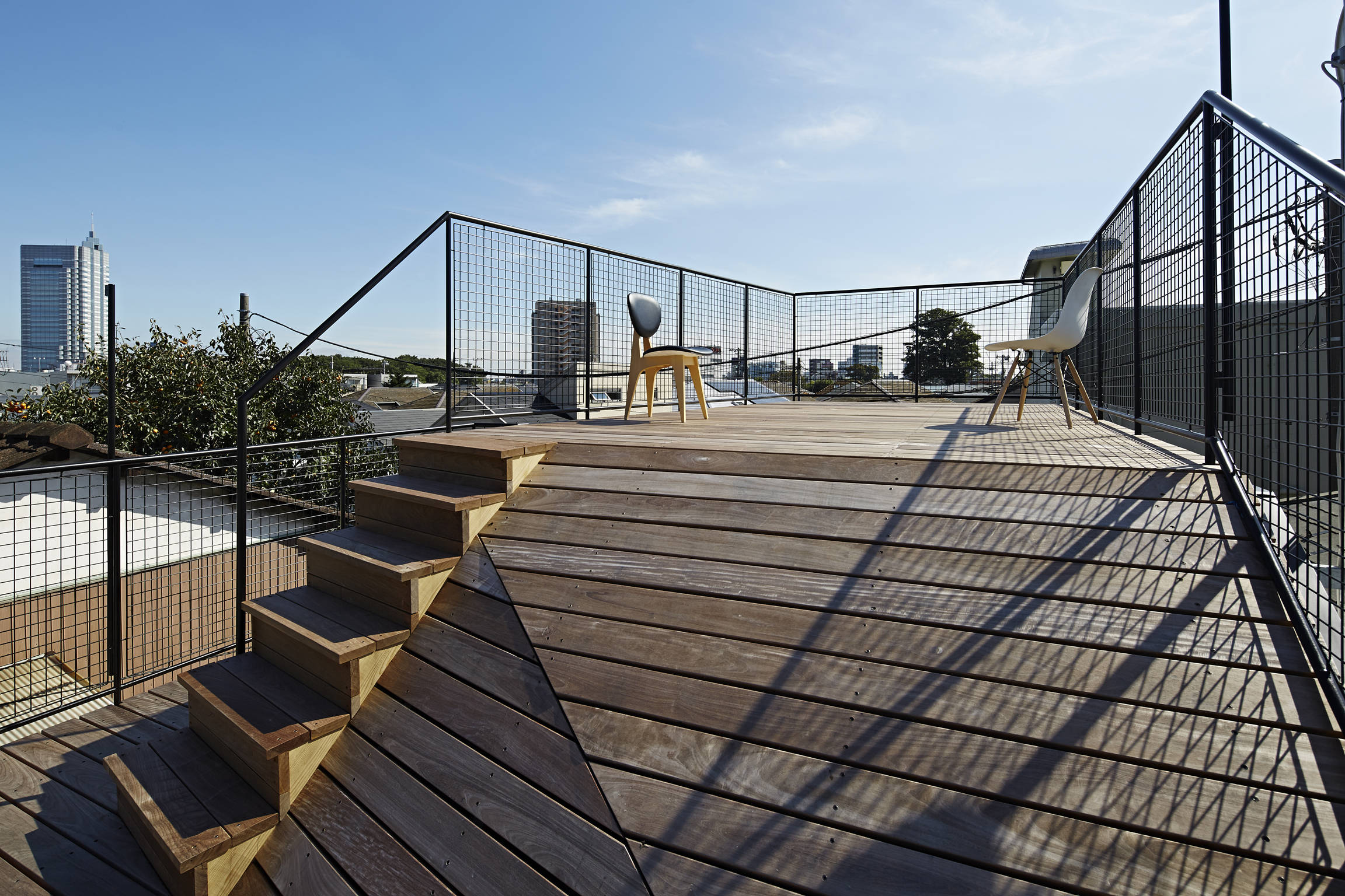 法条件の厳しい街区では、建物サイズは多くの場合法律で規定され、同じような高さの建物が建ち並びます。そこで、屋上は眺望や風通しのよい魅力的な空間となるわけです。この住宅の屋上からは、公園の緑や花火大会、はるか遠方の景色まで見渡すことができ、季節の移ろいや自然を感じることができます。