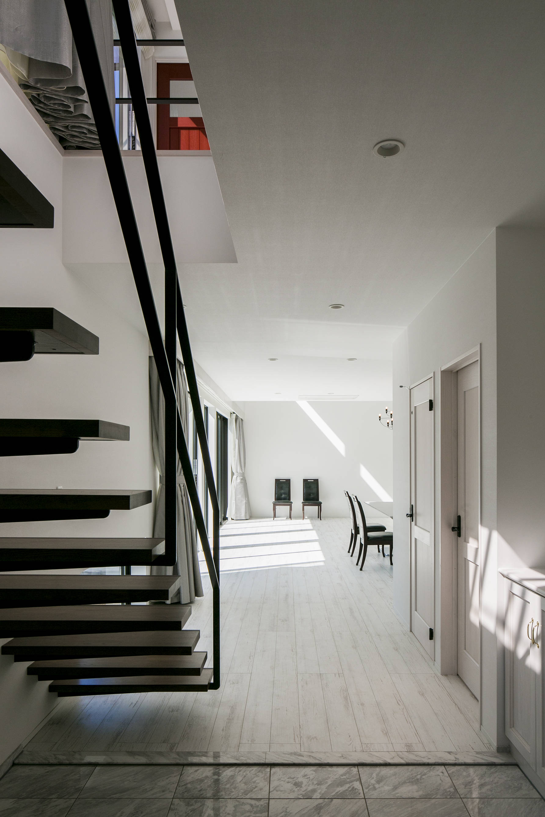 そこで2世帯共通のエントランスを兼ねたラウンジという大空間を提案。玄関を通らずに土足で上がることのできるラウンジを通って、各世帯の内玄関からそれぞれの居住エリアに入ることができます。