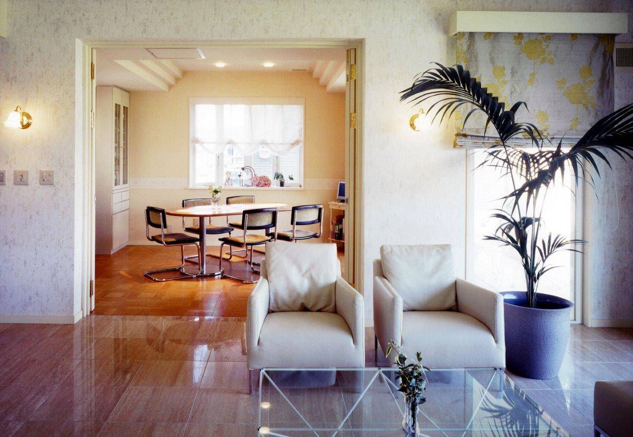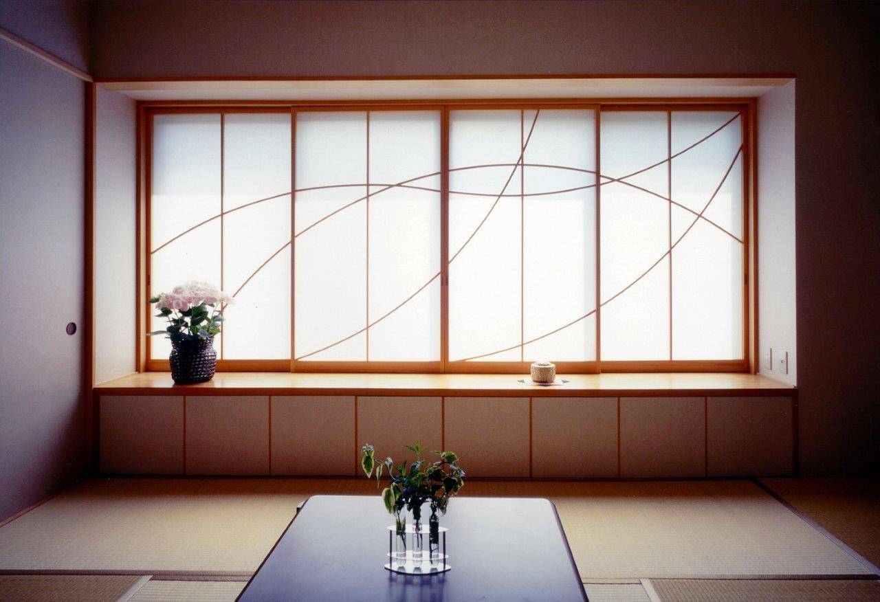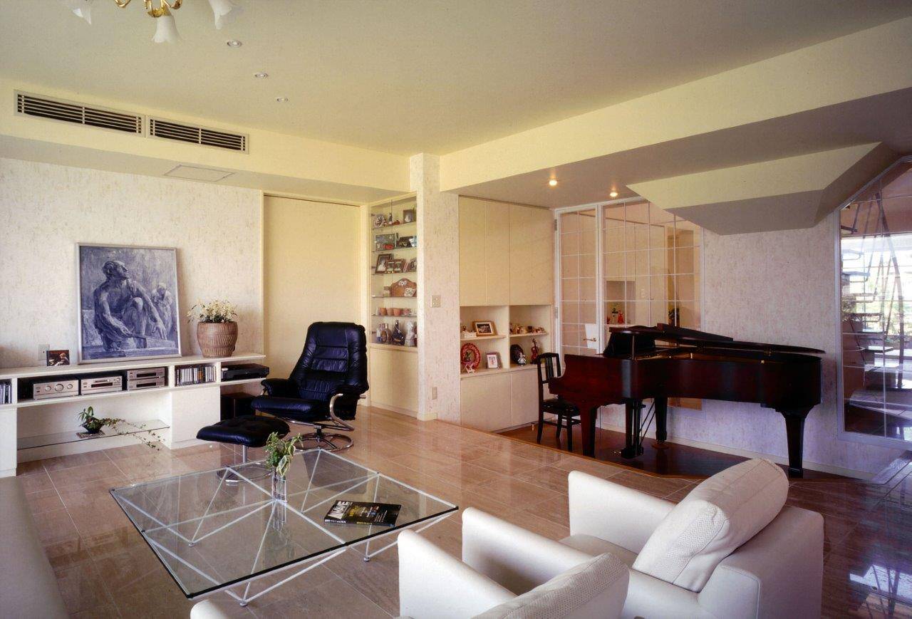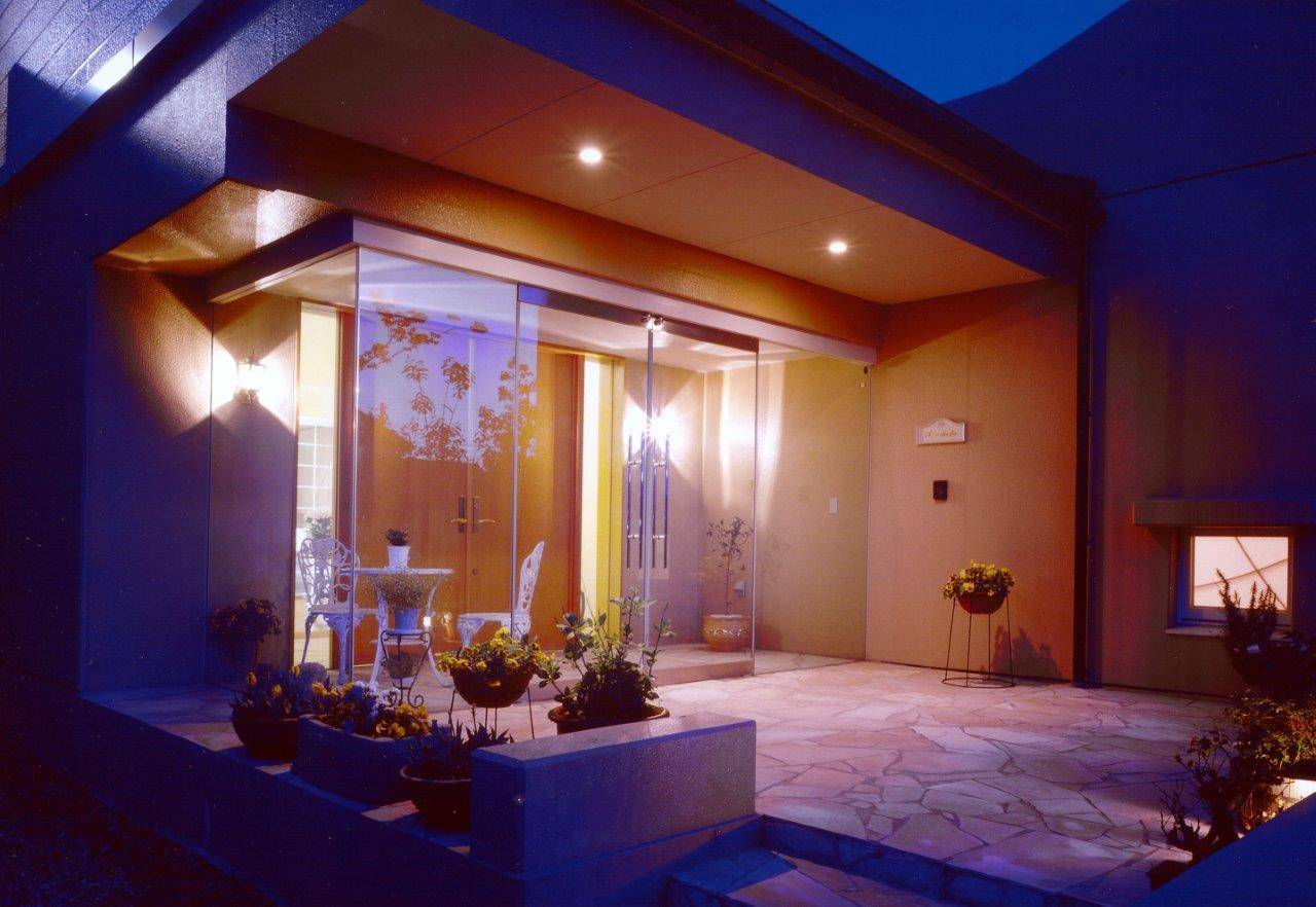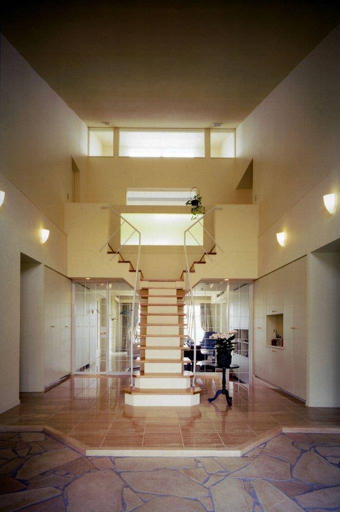 「間口2間半の玄関を作ってください」がはじめに伺ったご要望で、メーカーがうまく対応できなかったことから私への依頼となりました。富山県はもともと住まいの広いことで有名ですが、ゆったりとしたお暮しの土地柄に合わせ、すべてに余裕をもって設計しました。寒さ対策もあり、普通の住宅でも玄関に風除室を設けていますが、強化ガラスのドアで、開放感を持たせています。リビングにグランドピアノを置くと、どうしても目立ちすぎますので、ピアノ周りの床を30cmほど下げました。写真にはありませんが、ご主人の趣味が熱帯魚の飼育。専用のアクアリウムを設け、井戸水の給水と共にエアコンディショナーで常に気温・水温を25度を保っています。完成後も数年かけて、サンルーム・ガレージ・お庭が整備されました。ご両親様のためにつくった和室の離れは、もっぱら私が泊まらせていただくお部屋になっています。1階がRC造、2階が木造の混構造で、雪と湿気の対策に加え耐震性も十分です。
