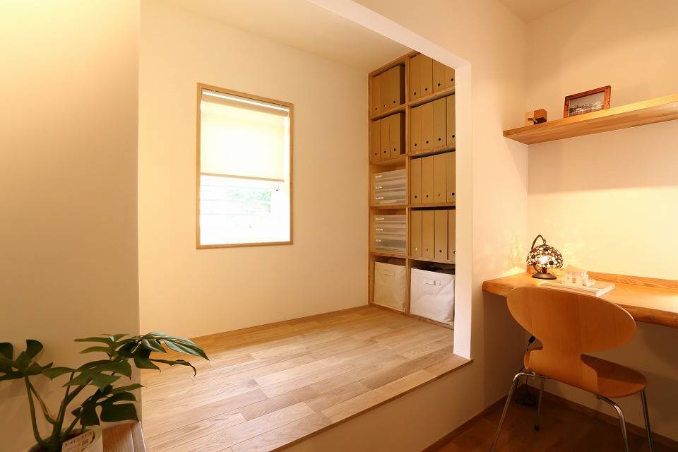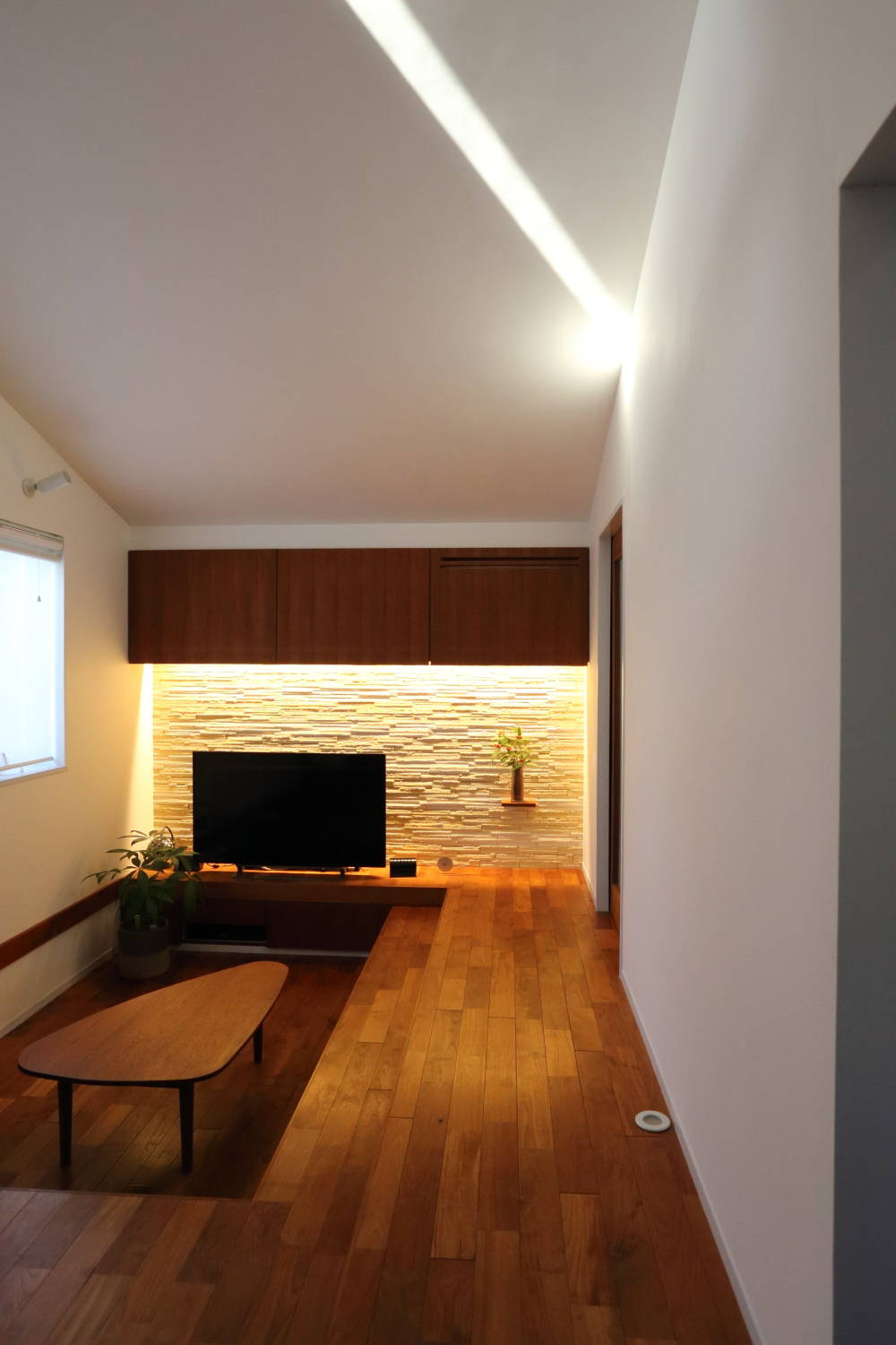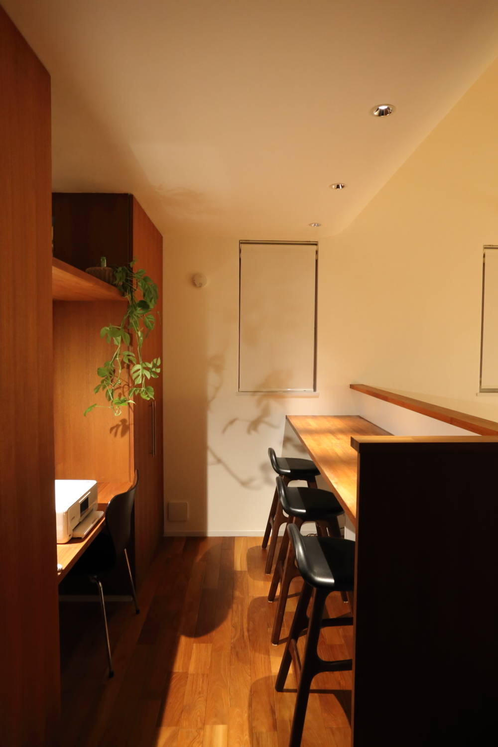 夫婦+大学生、3人家族の住まいです。子育てもひと段落した段階での家づくりは、それぞれのプライバシーを保ちながら、「自分の時間を大切にする住まいの設計」を目指しました。サンクンリビング+カフェカウンターの共有部分と3.75畳の個室3部屋によるシェアハウスのような住まいです。