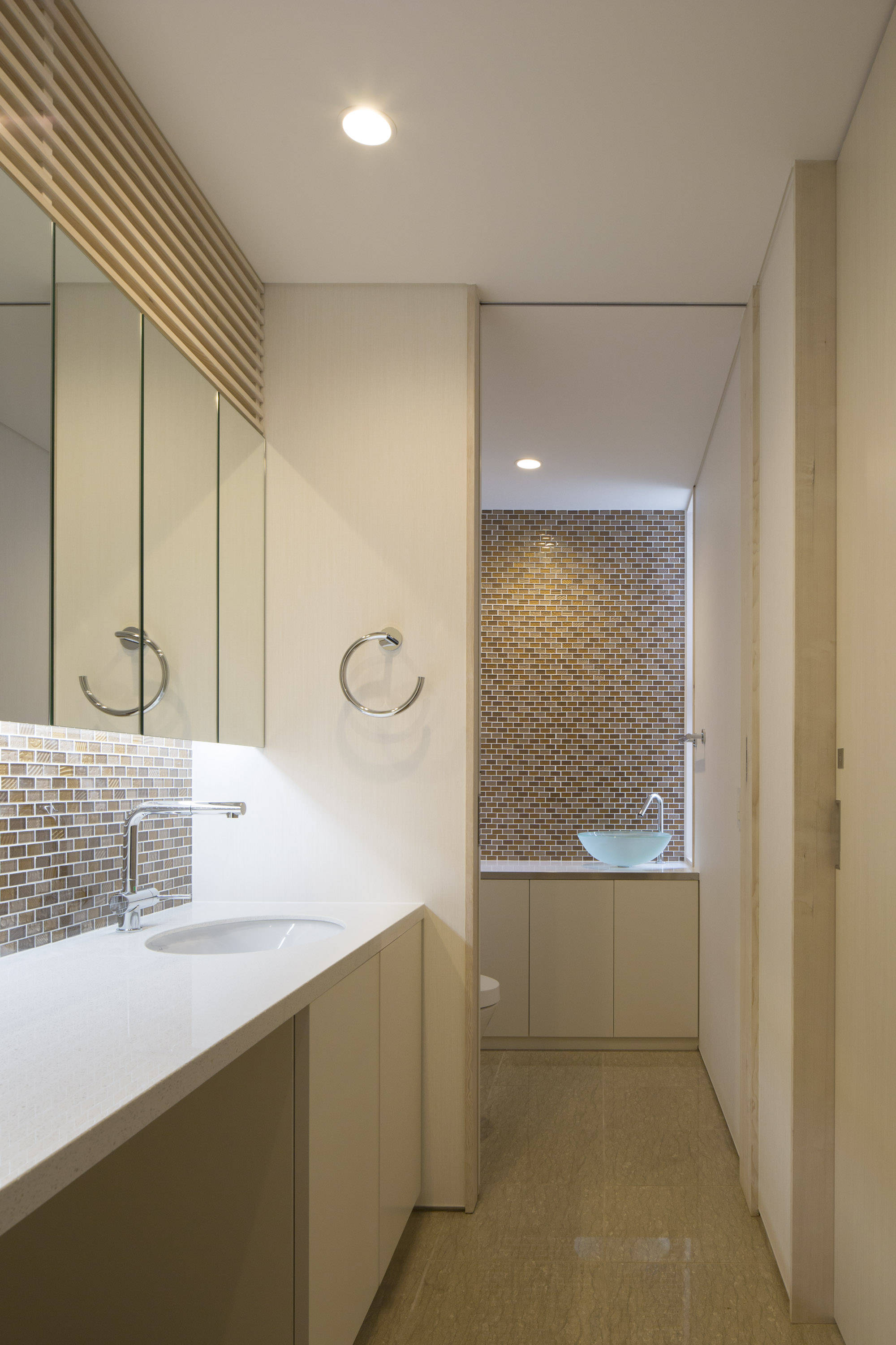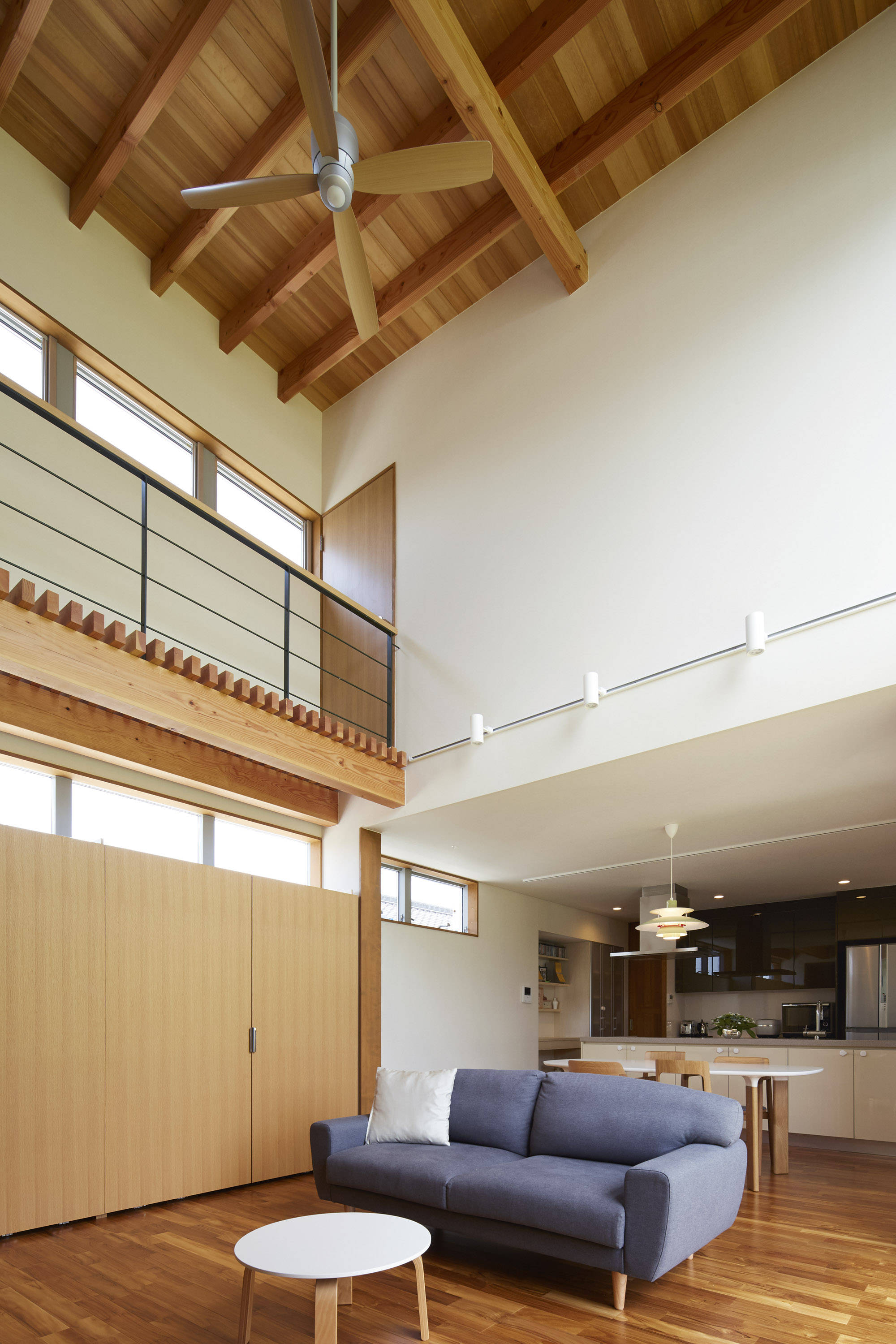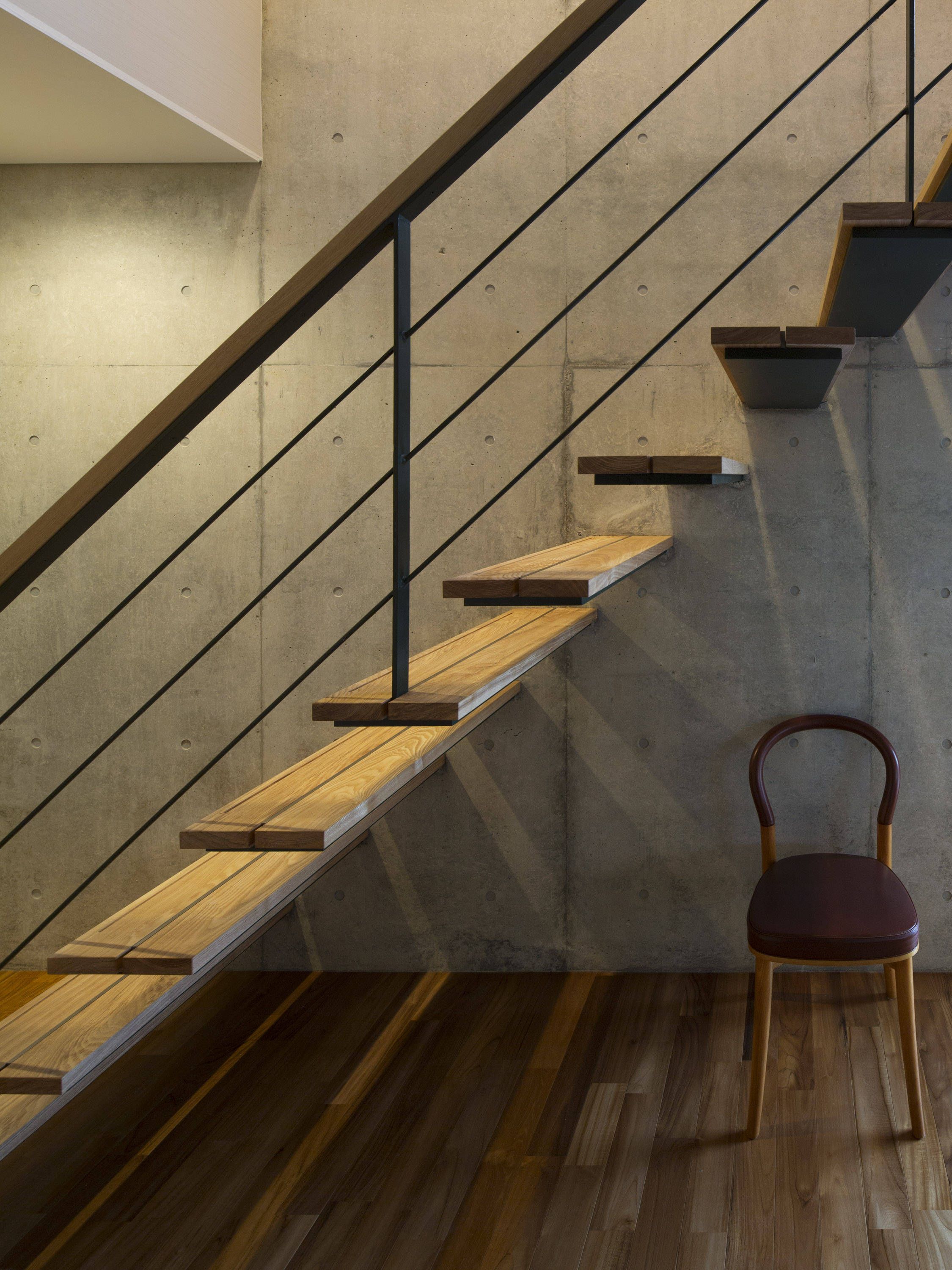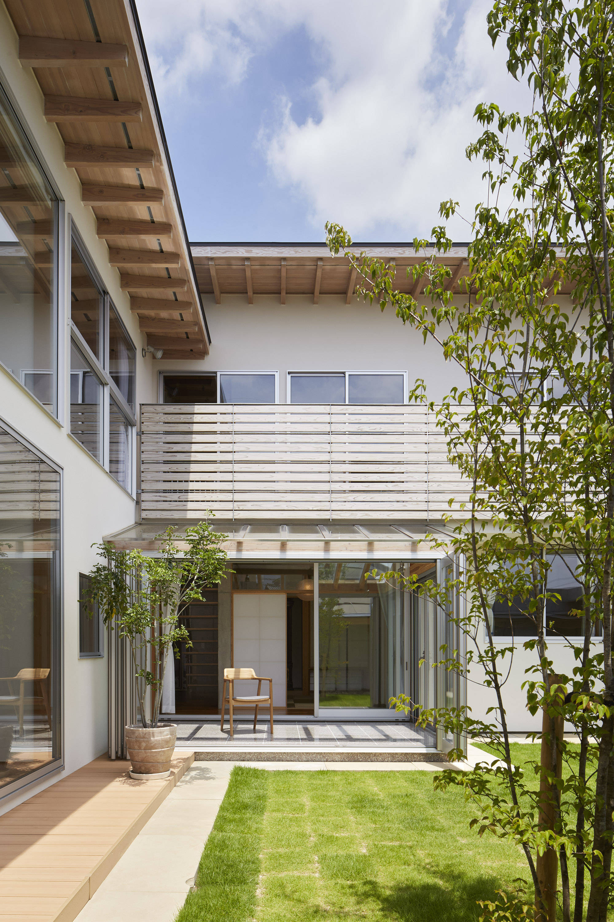 地震などの自然災害にも屈しなこと,騒音・振動を防ぎ,夏涼しく冬暖かい快適な温熱環境を追及したところ,堅牢な鉄筋コンクリート造の特性と,軽やかで暖かな木造の特性を併せ持つハイブリット構造にたどり着きました.両者のいいとこ取りをしたハイブリット構造は,コスト的にも優れ,意匠的にも特徴のあるファサードを形成するに至りました.道路側にはマッシブな鉄筋ンクリート造の壁が立ちはだかり,外部からの喧騒を遮断します.一方,建物内部は木肌のやさしいテクスチャーに包まれ,一日の疲れを癒してくれます.また,建物の調和を彩る中庭には,手入れの行き届いた芝が覆い,家族の憩いの場として使用されています.