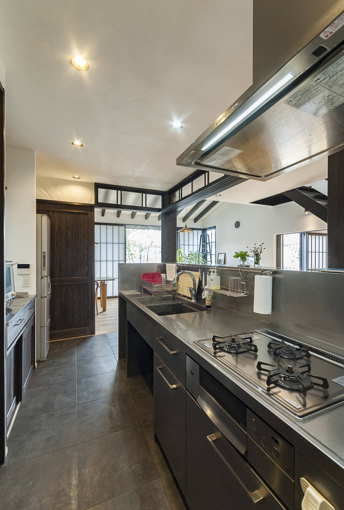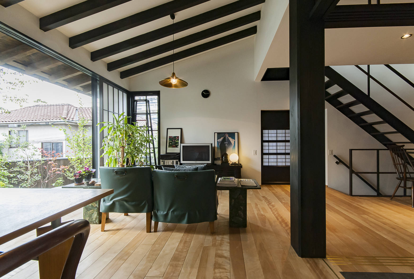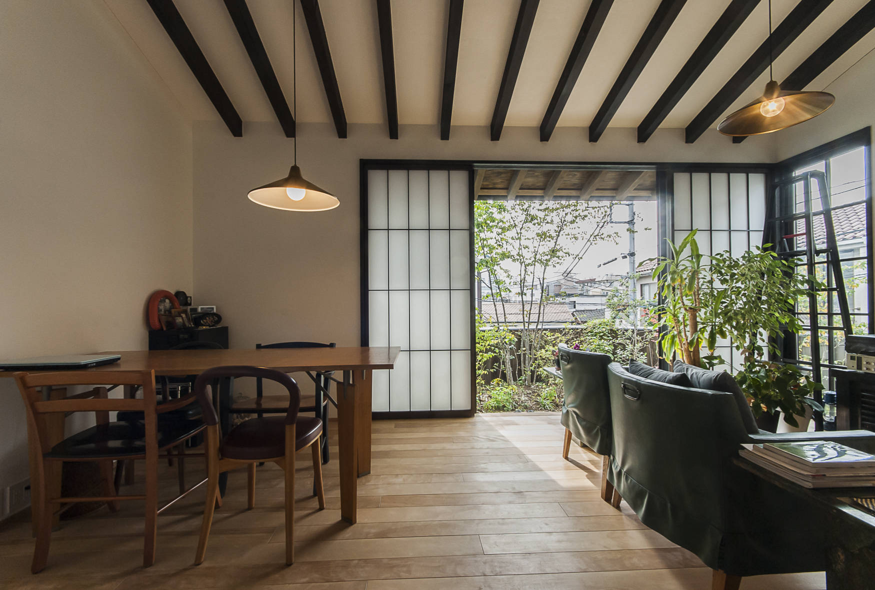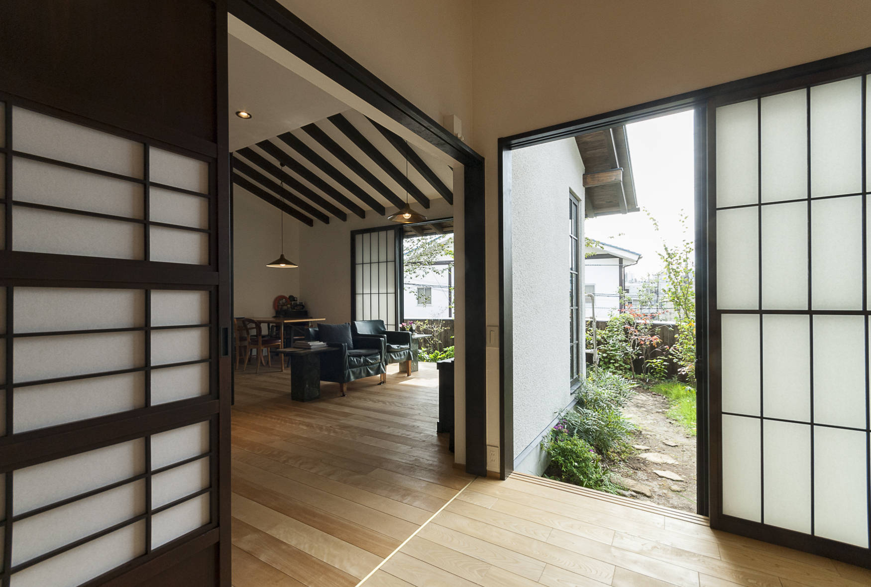 春先から始まる花粉症。今や多くの日本人がこの症状に悩まされています。同じアレルギーでも建材などに含まれる化学物質に反応する症状もあります。この家はその化学物質過敏症の子供が、快適な生活を送る事が出来る様に設計されています。一般的な住宅に良く使われる合板やビニールクロスは、低ホルムアルデヒド建材の基準であるFのフォースターを使用していても化学物質は発散されれています。その為、今回はそのような現代的な建材は使わずに、昔からよく使われてきた無垢の木材や、漆喰などをメインに使用しています。リビングダイニングと一体となった庭を設けた事で、住宅街にありながら、静けさと趣きがある家になっています。