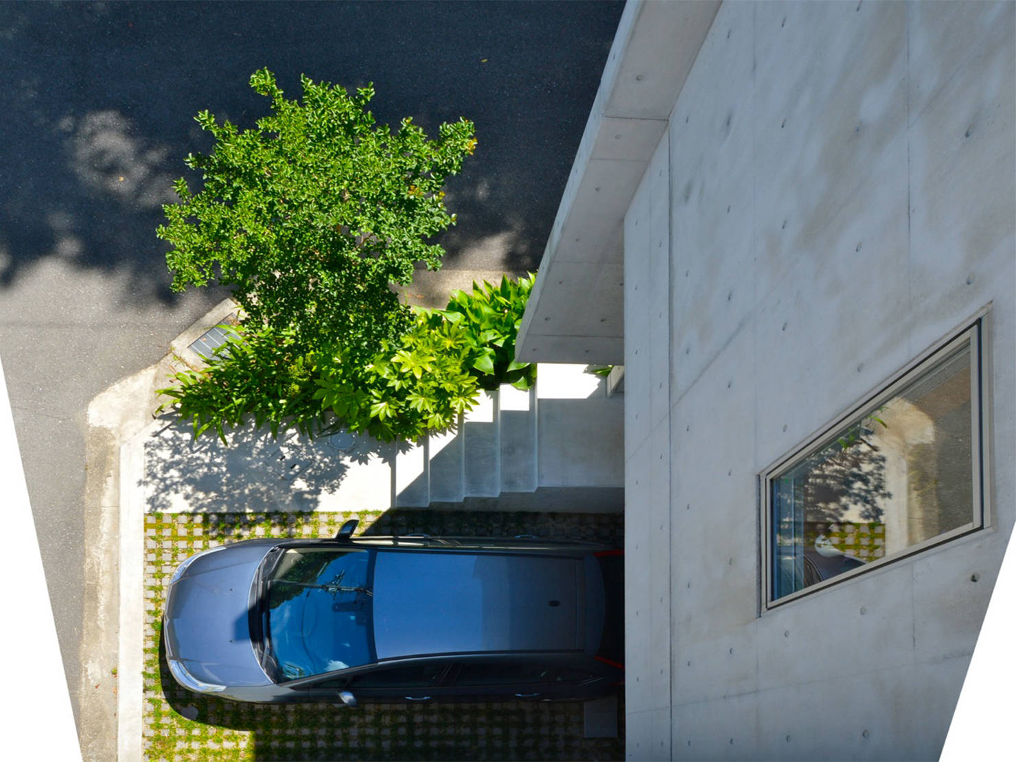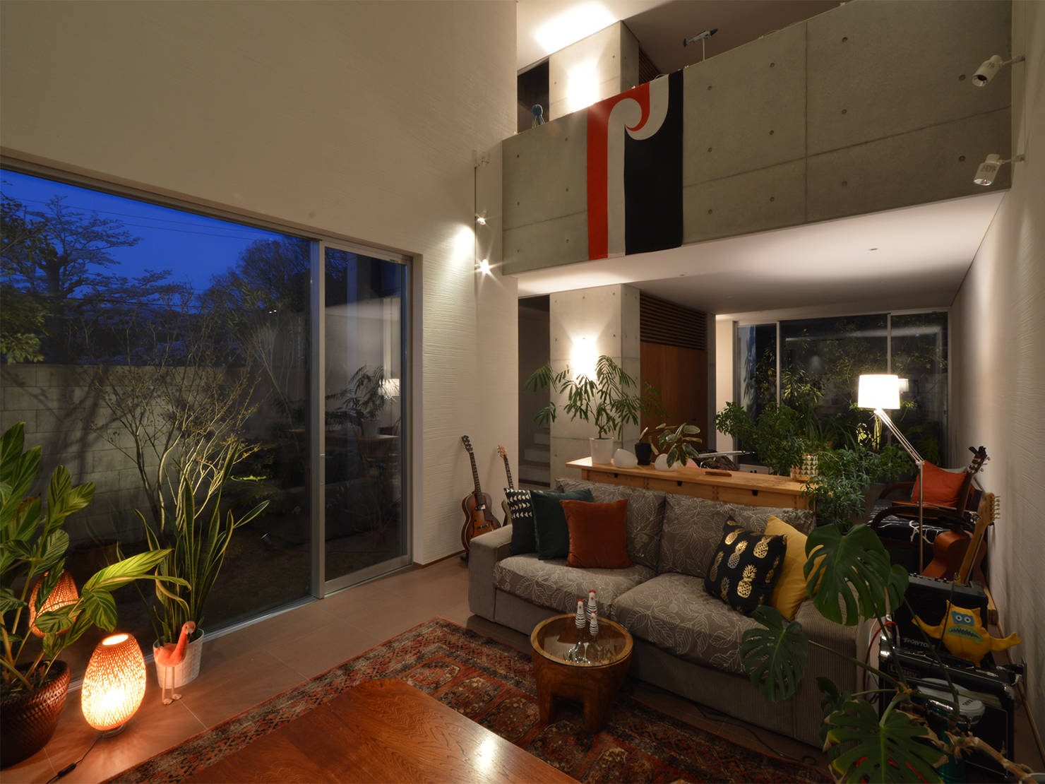 周辺環境を考慮してコート(小さな庭)と窓の配置を計画することにより、カーテンも不要なプライバ シーを確保しつつ、同時に大きな開放感も両立しました。