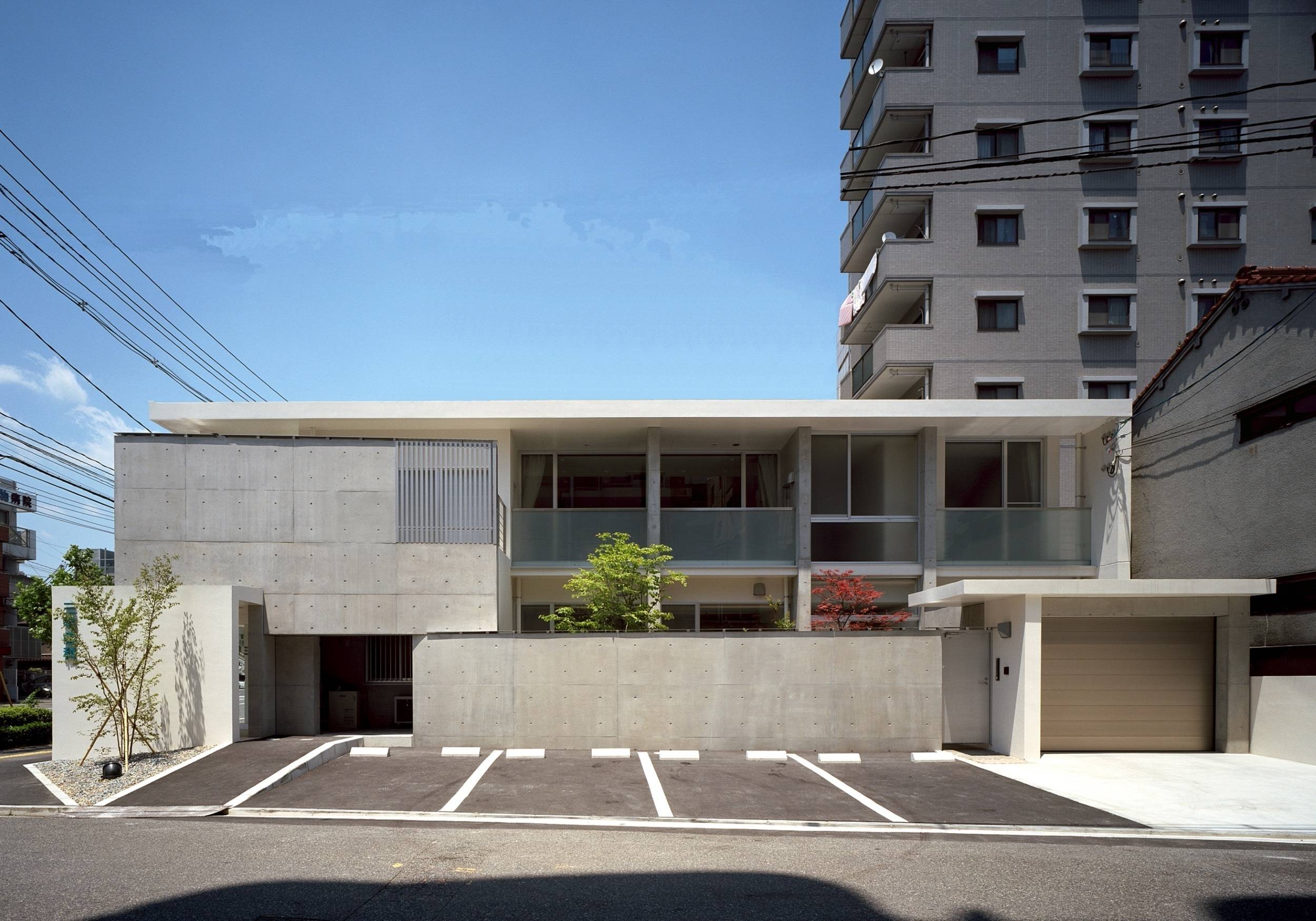 敷地は交通量の多い幅25mの広い道路に面した角地であり、周囲には高層マンションやオフィスビルが立ち並ぶ地域である。上部からの視線を考慮し、大きく深い庇を架け、ファサ-ドの特徴としている。