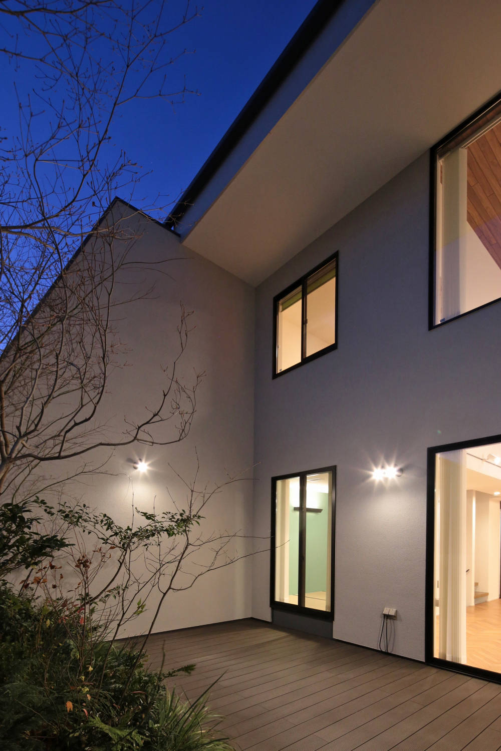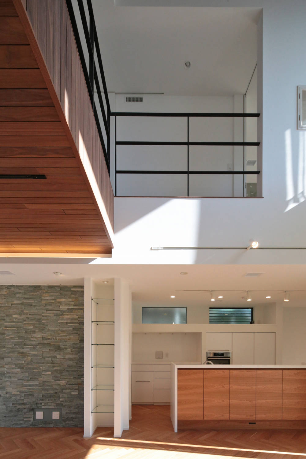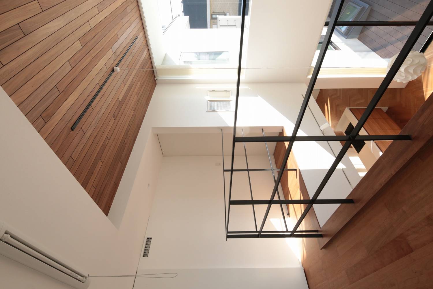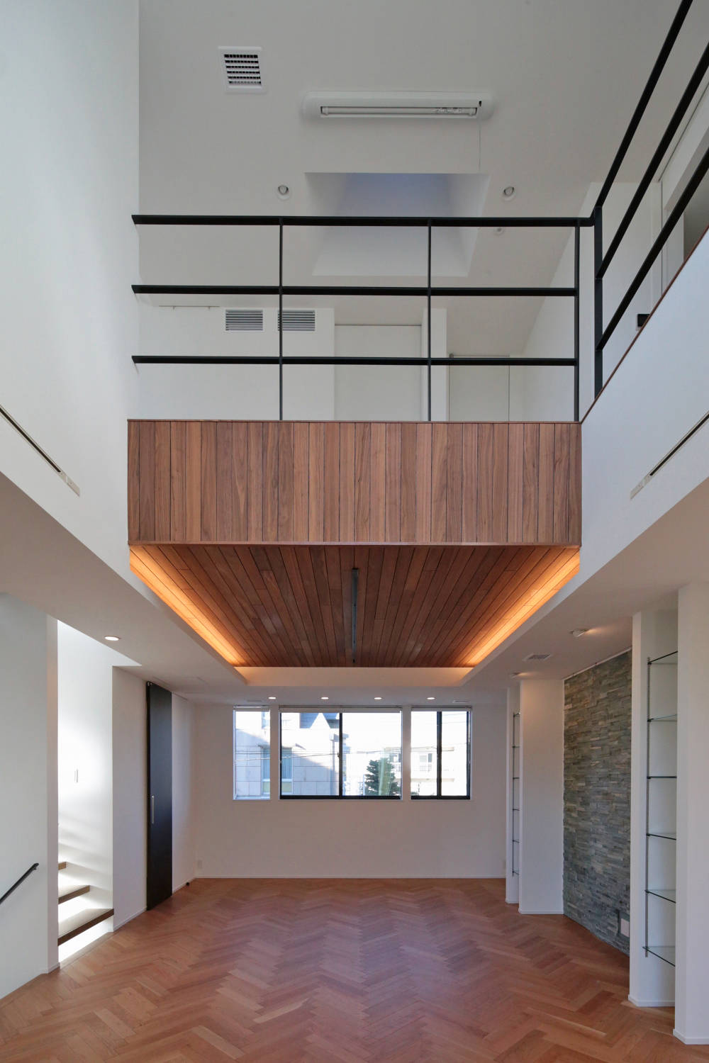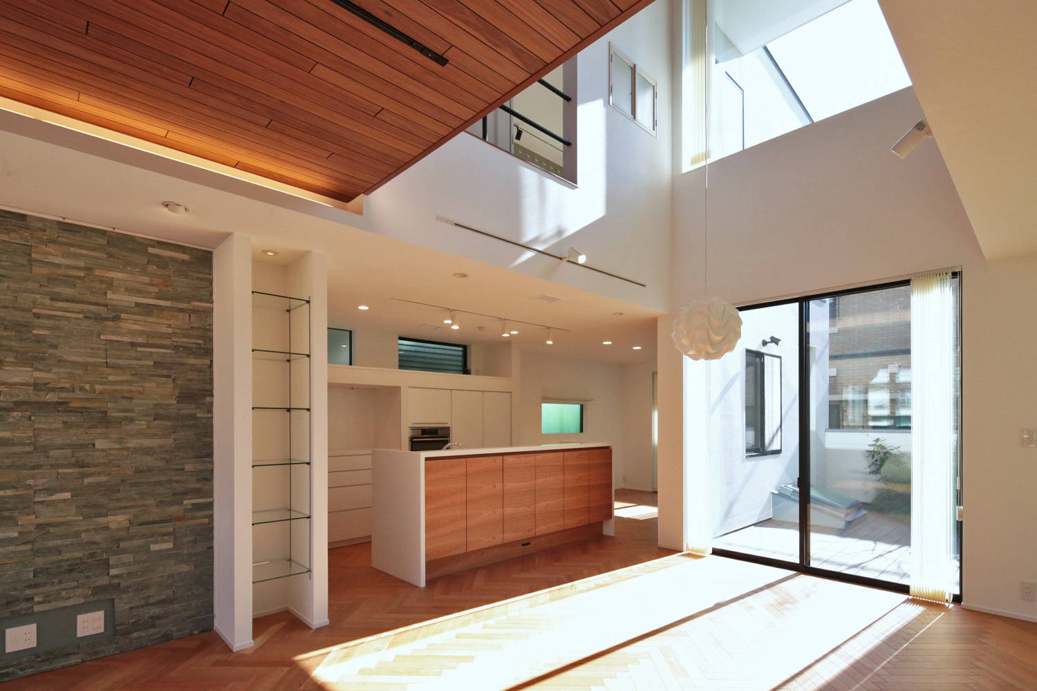 渋谷区の住宅街にある住まいです。2階にLDK、3階に個室群と水廻りを配置し、LDKから吹抜けを通して上階の雰囲気がつたわる一体感が感じられる計画としました。吹抜けには南側に大きな開口部があり建物の奥まで光が差し込むよう配慮しています。LDKに面して囲われたテラスが連続し季節の良い時期はサッシュを開放すれば外部のテラスと内部のLDKが連続する心地よい空間となります。