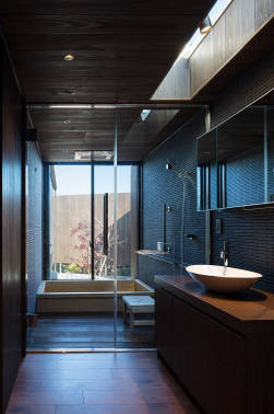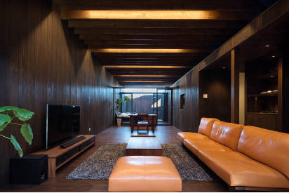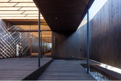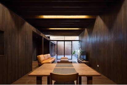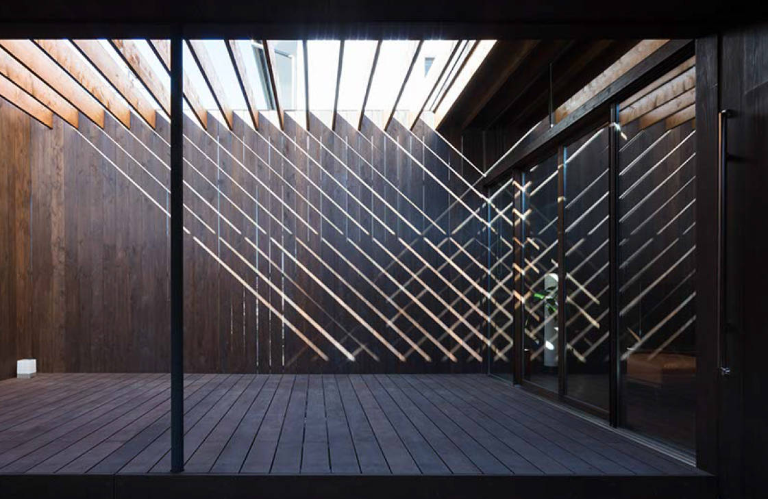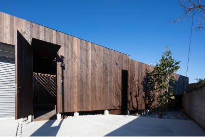 忙しい施主が、心身ともにリラックスするための別荘として計画された住宅である。施主からの要望は、3台分のビルトインガレージ、どこからも見られない隠れ家、そしてその中に大きな浴槽をつくることであった。 南北に細長い変形した100坪超の敷地であったため、長さ30m、高さ4mの木板壁を東側と西側の隣地に沿うように建てて、その間のスペースをガレージと隠れ家とした。木板壁に挟まれた空間は外部から隔絶された別世界としている。道路に面した板壁に隠された扉を開けると、そこはインナーコートとなっており、縦横無尽に乱舞する光が出迎える。リビング・ダイニング・寝室は心地よくリズムを刻むルーバーに包まれた洞窟のような静謐な空間であり、両端部のインナーコートにうつろう光を眺めていると時を忘れる。木板壁と同じ桧の無垢板でつくられた大きな浴槽は、モミジが植えられたテラスとつながっており、窓を開けると露天風呂のような気分を味わえる。