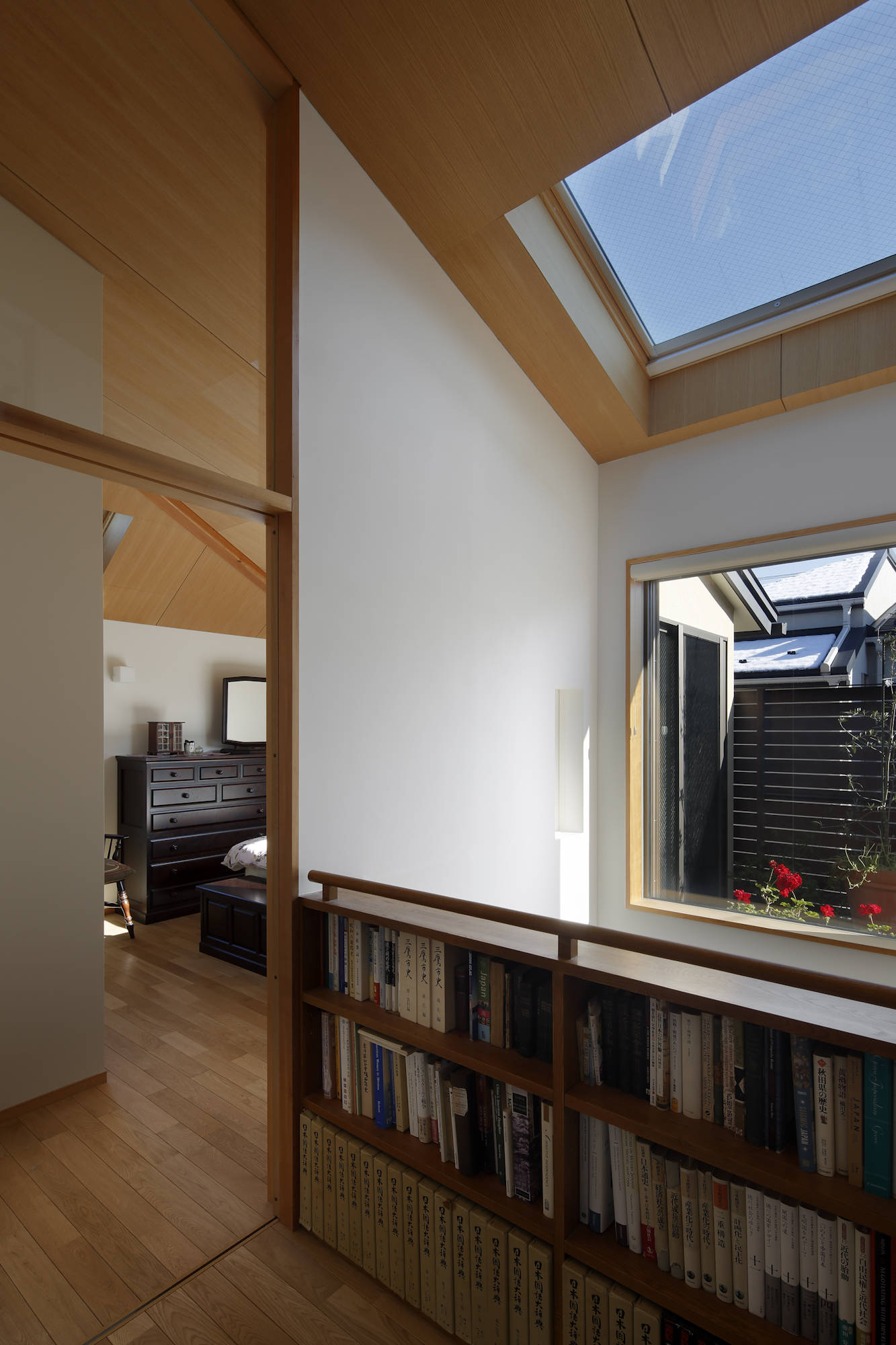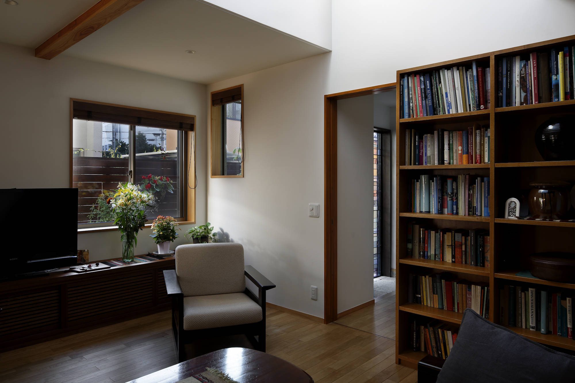 設計では敷地環境を丁寧に読み、周囲の建物の隙間を縫うように窓を配置、風通しや採光に加えて視線の抜けも得られるようにすることで、閉塞感の無い伸びやかな空間を実現しています。