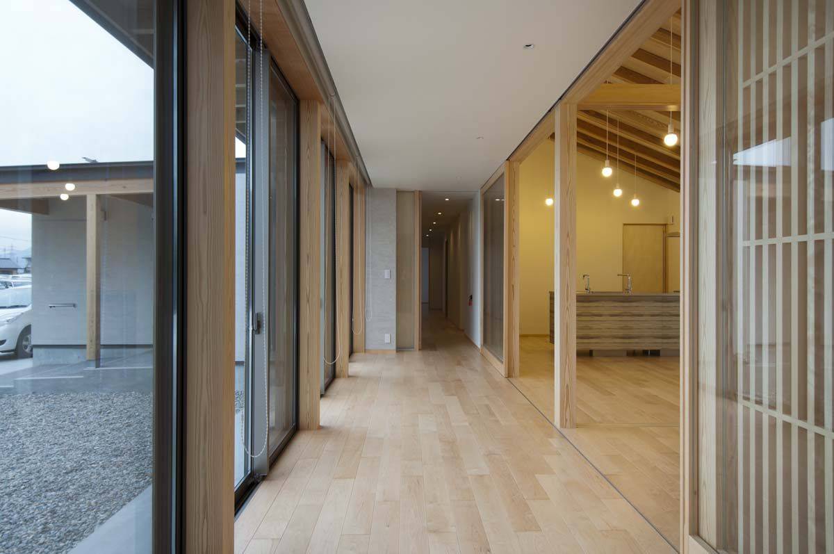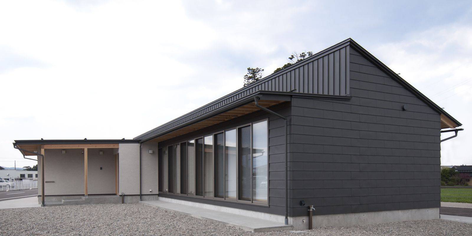 東西に長い敷地のため居住スペースを南面させ広い開口部を設けているが、新設される道路からの視線や、騒音を考慮する必要があった。北側の垂木構造を表した勾配天井のリビング空間と寝室に南向きのハイサイドライトを設け、空へ抜ける視線と通風・採光を確保している。また積雪の多い地域のため屋根雪は敷地背面の空地に落とし、アプローチには屋根のある広い空間を設けるとともにガレージ内からも住宅に入ることができるようにしている。車いす対応のトイレを寝室に隣接させ、廊下の幅もゆったりとしてバリアフリーにも考慮している。