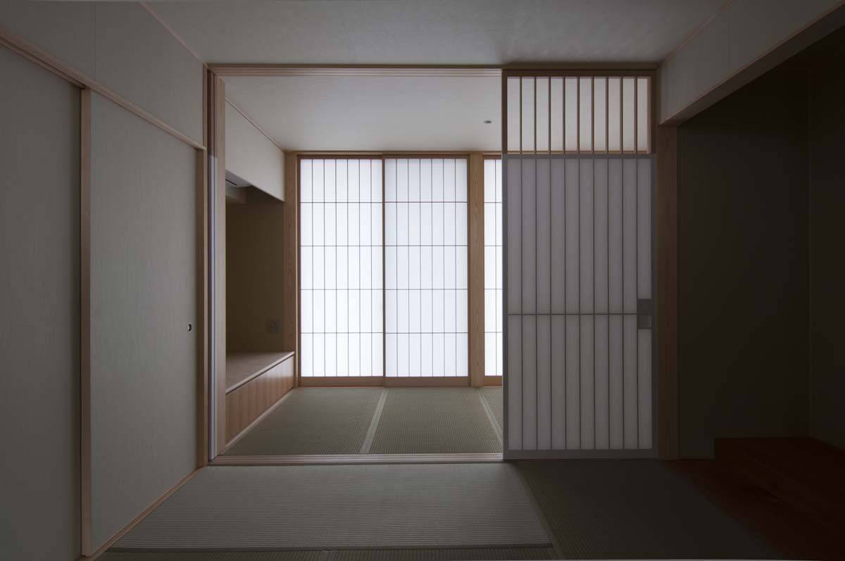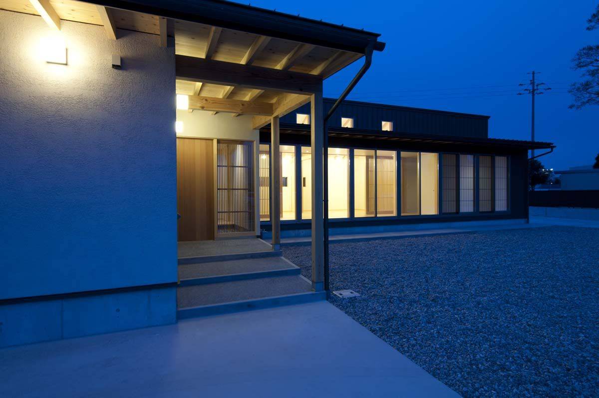 リビング前面の縁側から連続する玄関ポーチが取り囲む前庭は、来客など外部の気配を建物内から感じられることができる空間となっている。