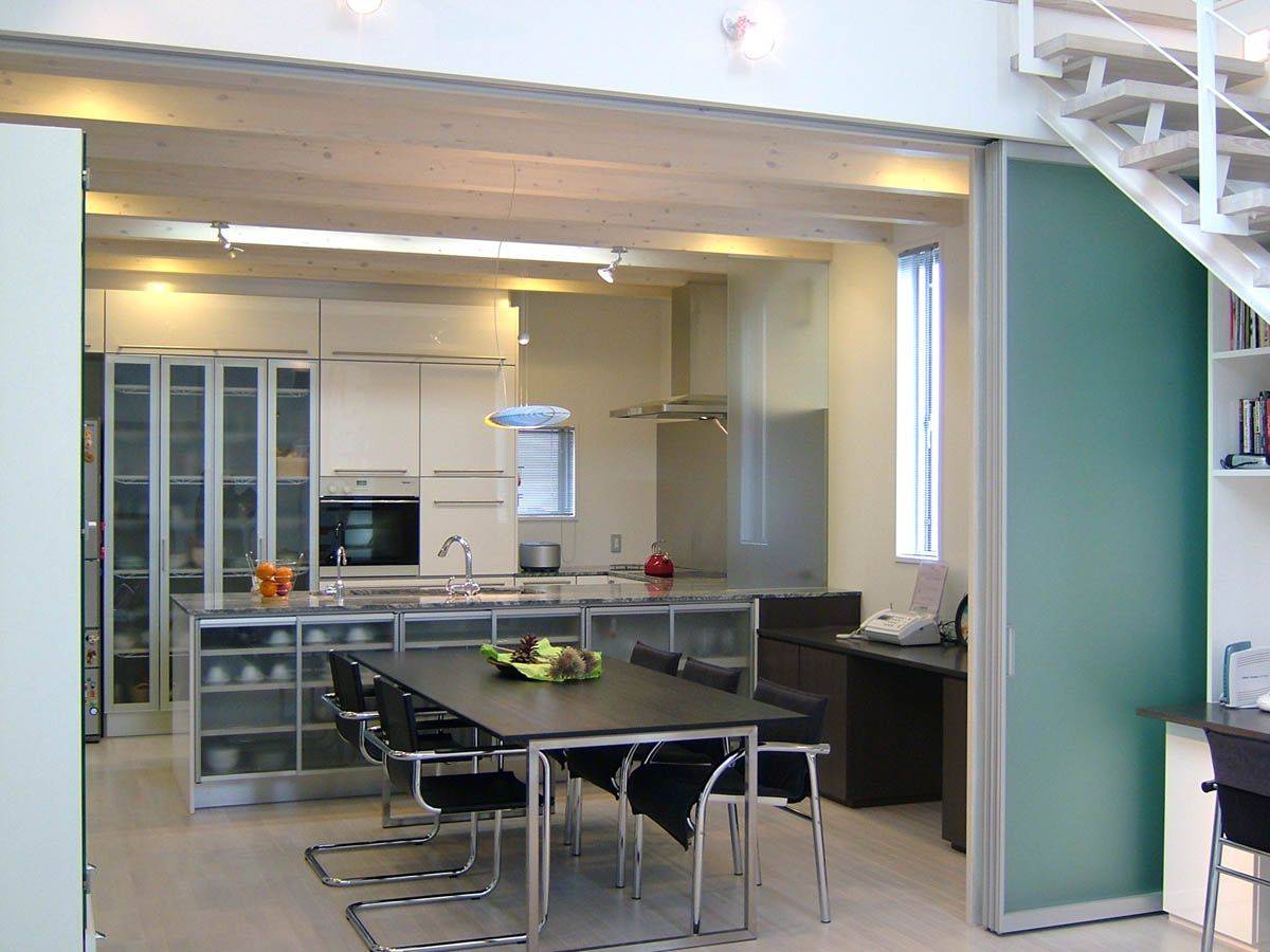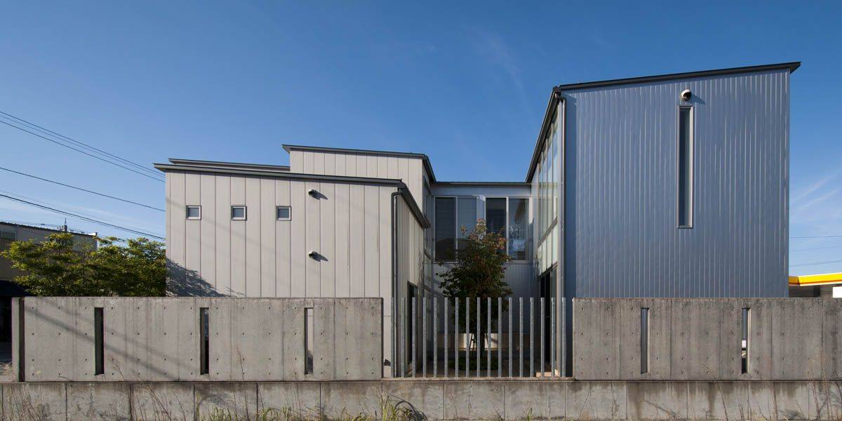 金沢市南部の郊外で、東西に細長い敷地。周辺は、空地が点在する中に様々な形態の住宅が建ち並ぶ地域である。打放コンクリートやシルバーの無機質な質感。デザイン性の高い設備機器の選定。生活上の機能性、動線を考慮した計画が求められた。