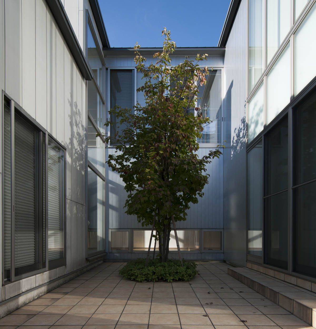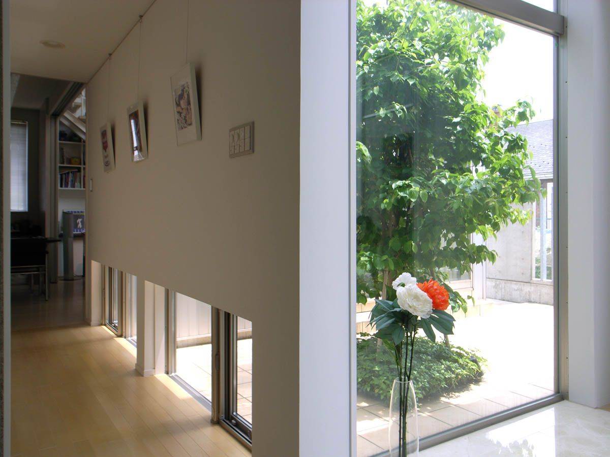周辺環境に対しては、この住宅が街並みに影響を与えていくものと考えて計画した。道路に対しては来客用の駐車スペースが空間的な広がりと、植栽による緑を街並みに提供している。また、幾重にも重なるコンクリートの塀が建築の奥行き感を出しながらも住まいとしての領域を分け、建築の形をまとめる役割を果たしている。建築を3つのボリュームに分け、それによって幾つかのプライベートな外部空間を設けた。それぞれの部屋は、隣地側に対しては限定された大きさの開口部、プライベートな外部空間には大きな開口部を設け、通風・採光および機能的な繋がりを考慮した。様々な内部空間と外部空間の関係性が、リビング吹抜と玄関吹抜の2つの吹抜と共に多様な空間の繋がりを展開するようになっている。