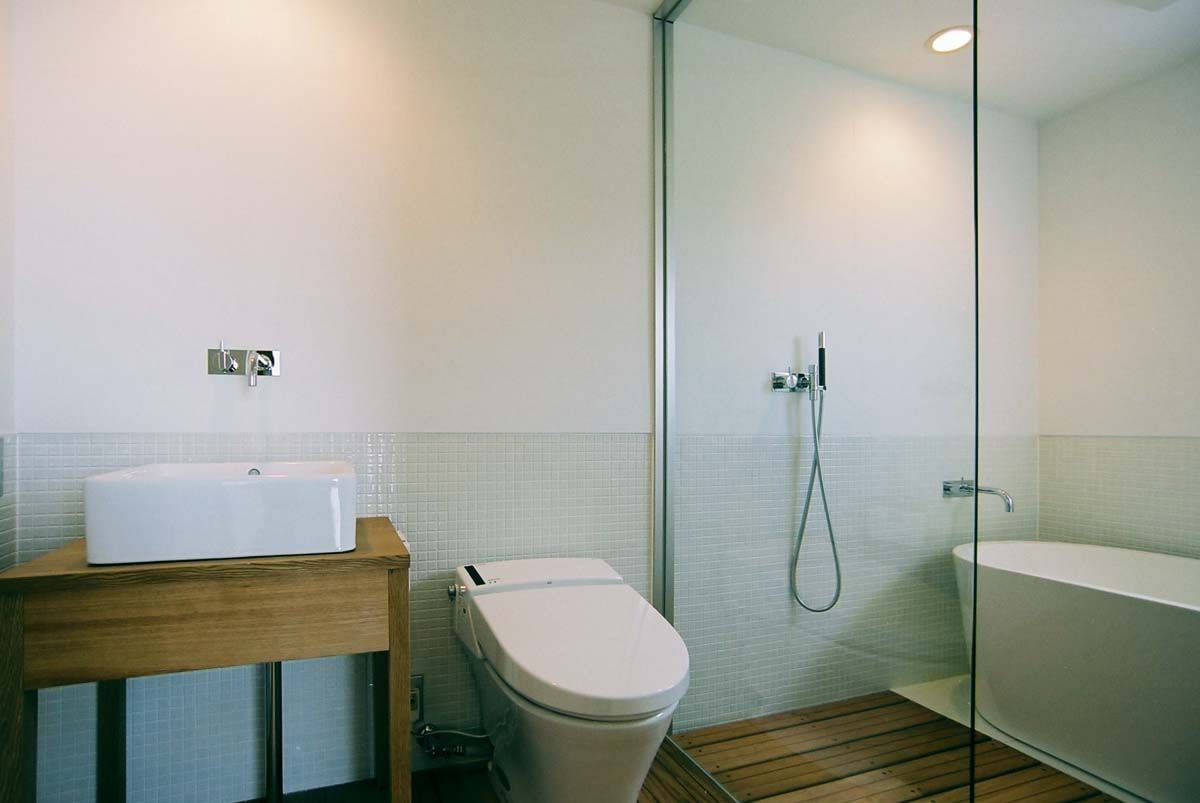 内部はミニキッチンを備えた居室と、バス・トイレが一体となった開放的なサニタリー空間で構成されている。