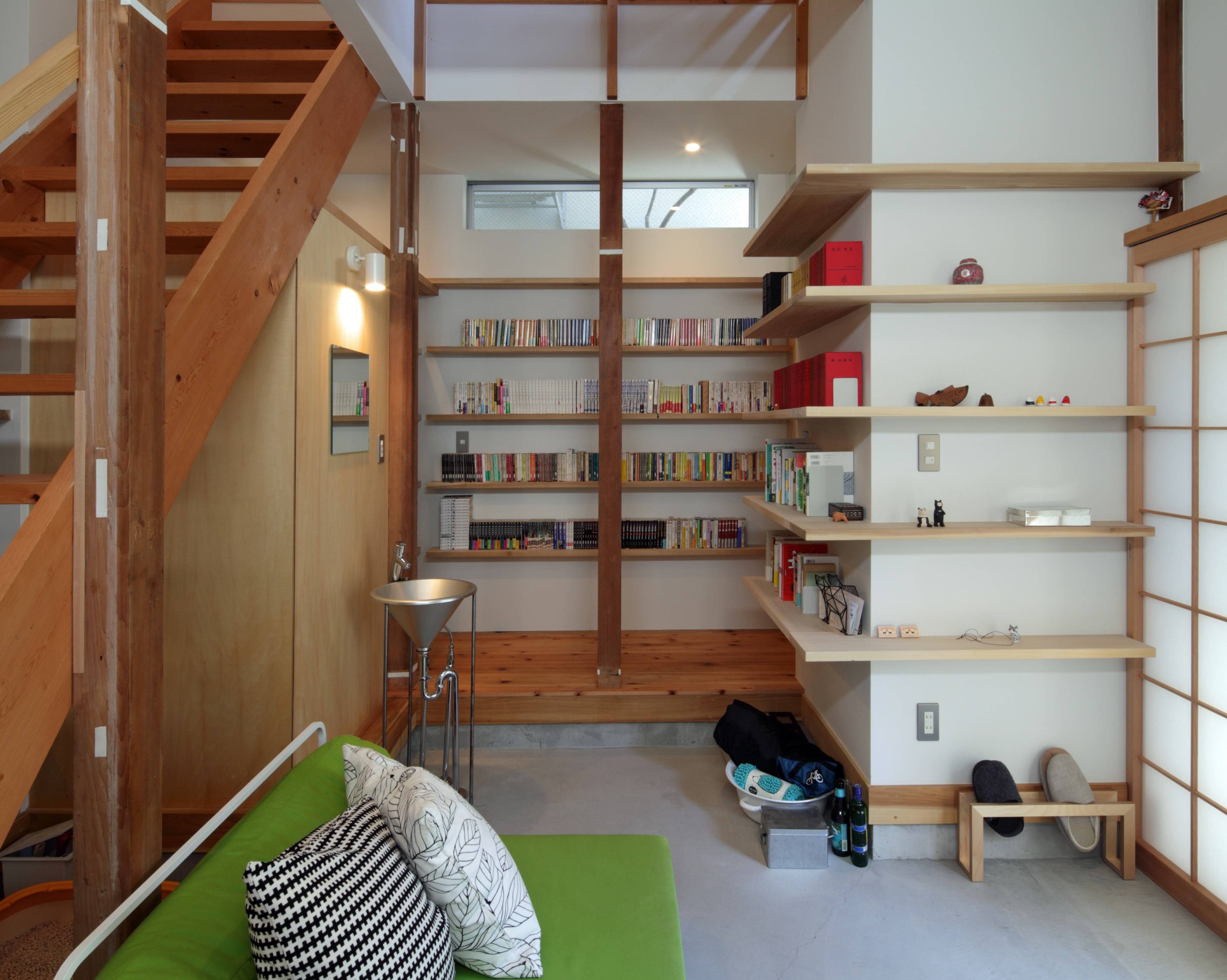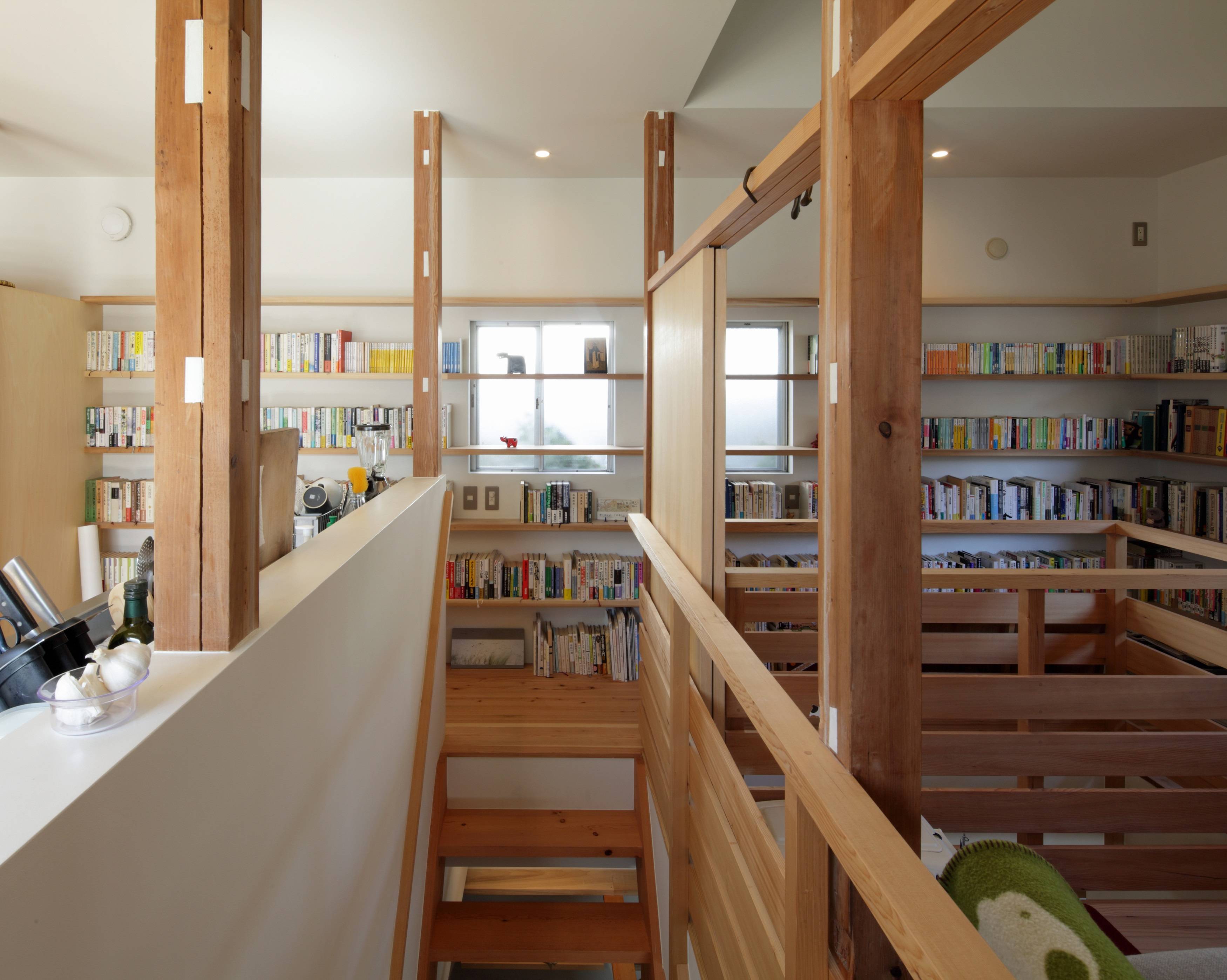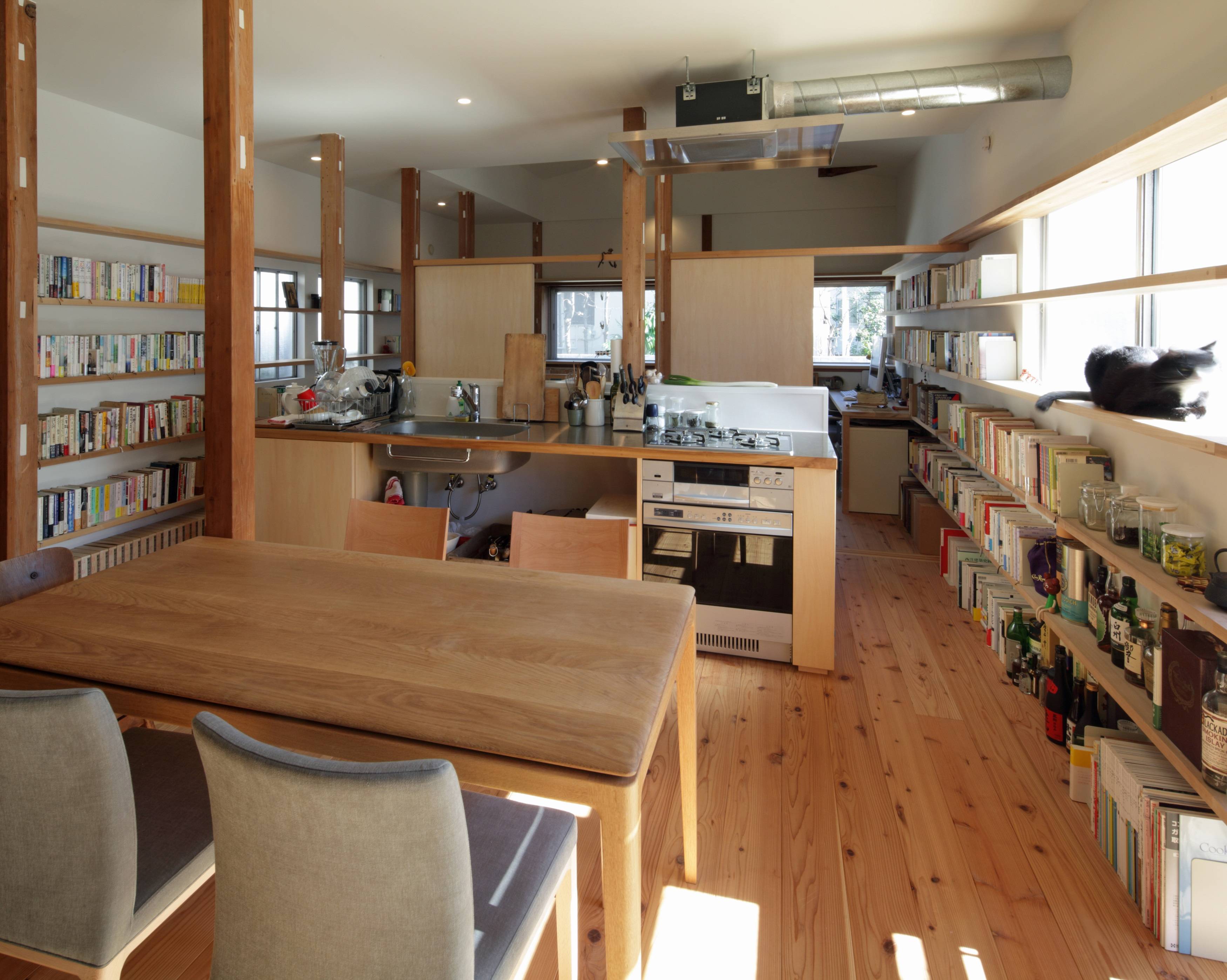 書籍を沢山お持ちのご夫婦のために、建物外周部に固定の木の棚をぐるりと回し、この家のインテリアの特徴としました。