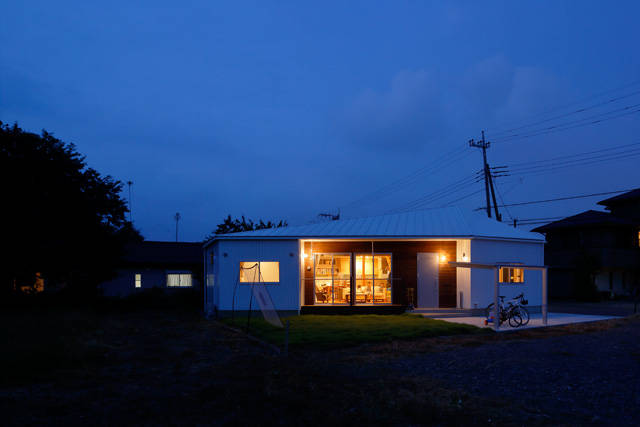 この配置構成により、家の中からは道路側の様子を気にせず、芝生のお庭側に向かって明るく開いて暮らすことができます。