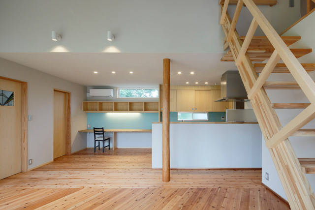 1階の間取りの中心はキッチンです。台所に立っているお母さんは、子ども達が家の中のどこにいても様子を感じることができます。