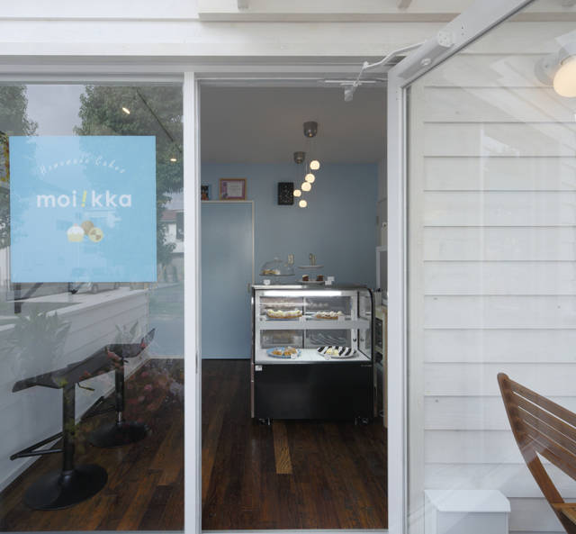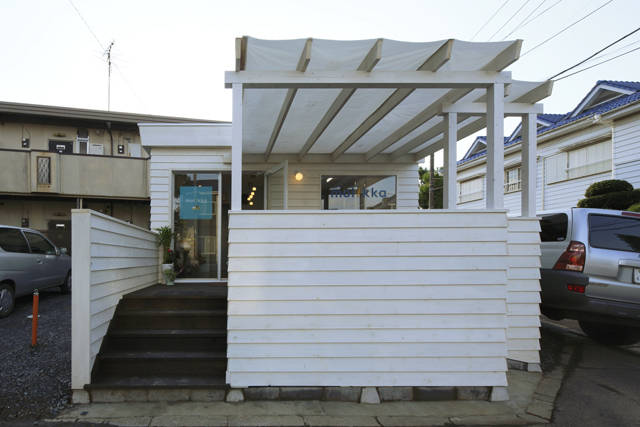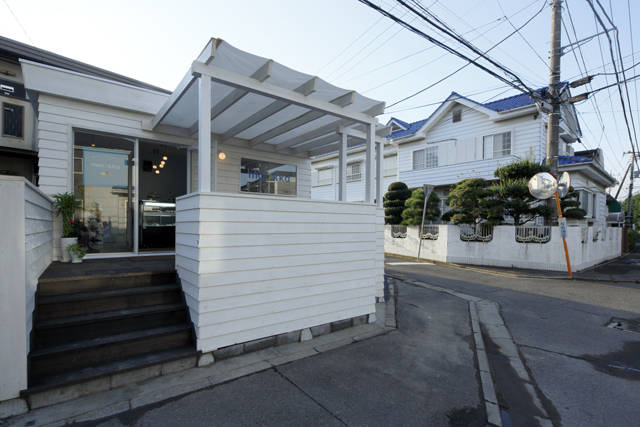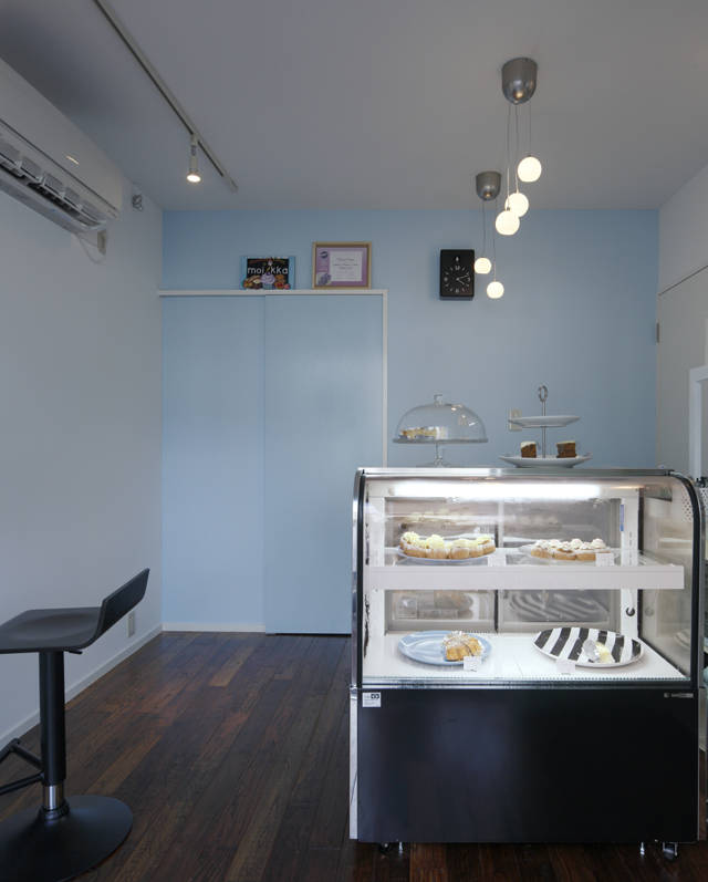 白を基調とした建物に、水色の壁がアクセントになっています。