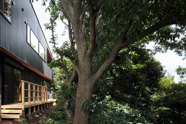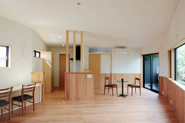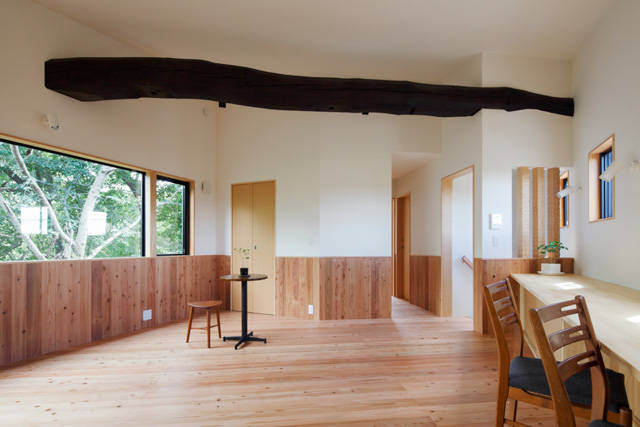 ツリーハウスに住んでいるような、絶景のリビングを持つお家です。変形の土地を活かした豊かな空間がうまれました。
