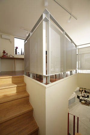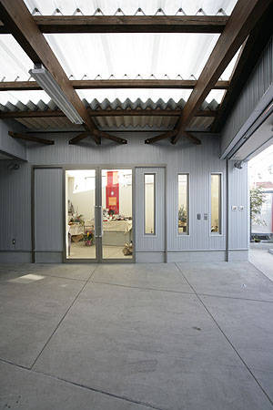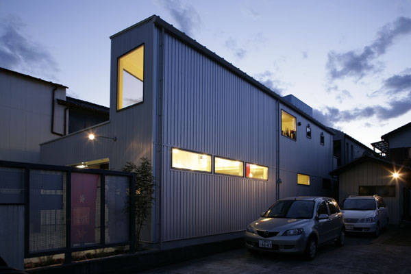店舗と住宅と倉庫と車庫の機能を備えた船体のような建物です。ギャラリーのような設備屋さんです。