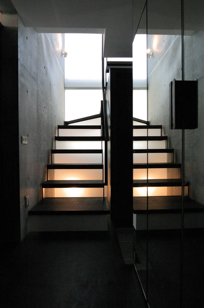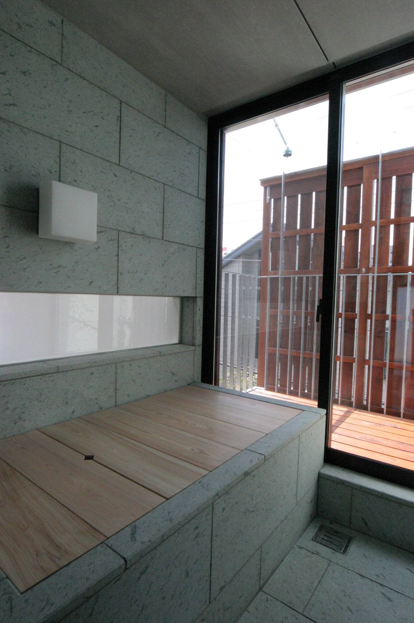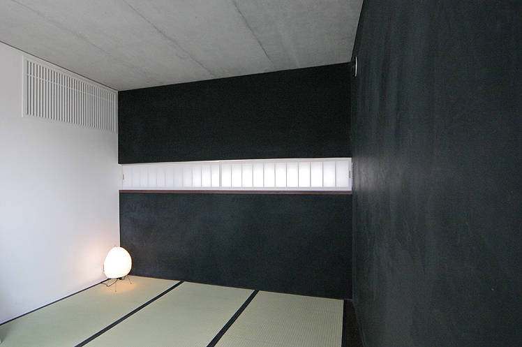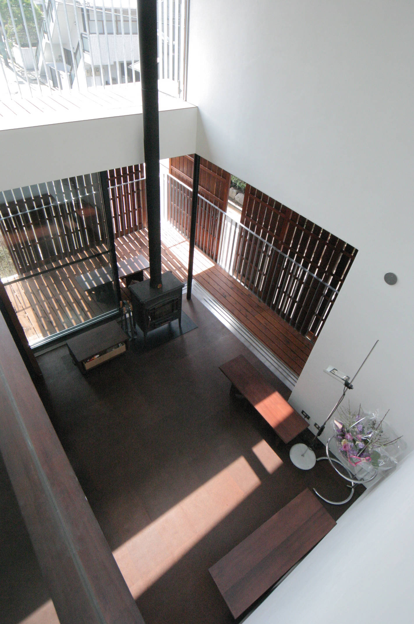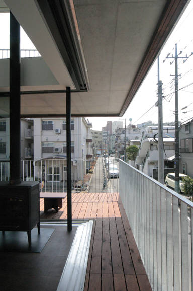 私の住まいと事務所の建物です。3方角地の恵まれた環境を活かすように建物周囲をバルコニーで囲みました。1周50mの散歩道は竣工当時はサッカーのドリブルコース、現在は犬の散歩道。バルコニーの先端には格子戸をつけ動かすことでプライバシーを守ります。足場を掛けずに外壁塗装などのメンテもできます。