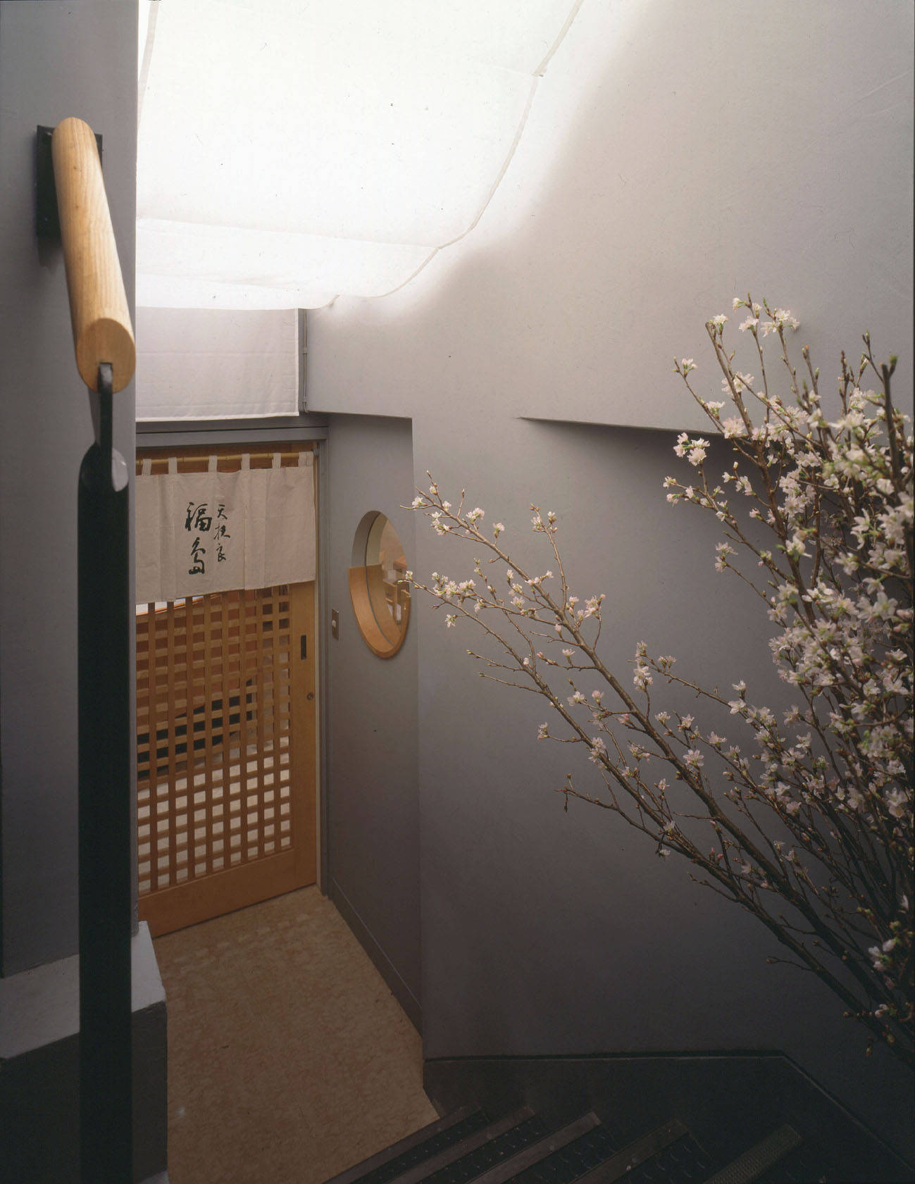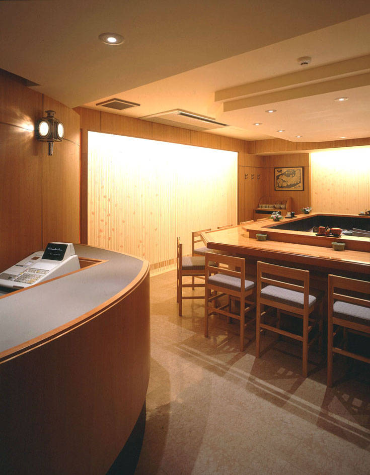 29歳で独立した直後の思い出の作品です。料理人(=職人さん)の仕事場が舞台(=場)となるよう全周をカウンターで包みました。ご主人の手さばきがお客さんの視線で活き活きとしてきます。揚げたての天ぷらをもてなす振る舞いが粋な店です。カウンターや壁面に桜材を用いて優しく包み壁面の白い壁にも桜の絵が描かれています。グラフィックデザインも担当しました。